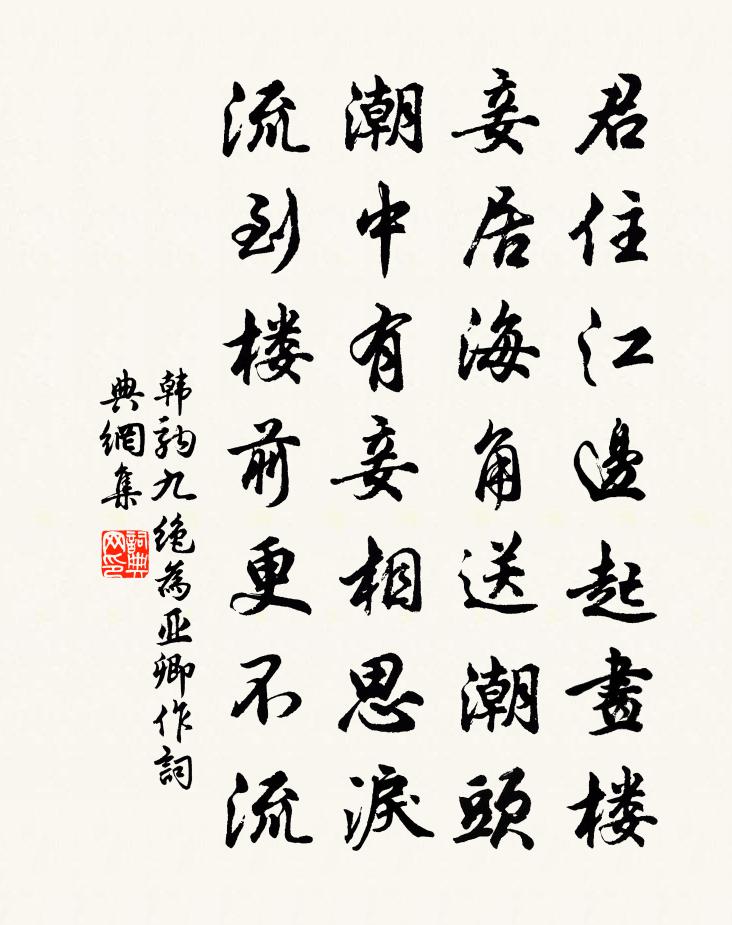 詩詞名句歷史字典書法欣賞書法字典國語詞典說文解字康熙字典古漢語字典標 題 作 者 詩 句 九絕為亞卿作作者:韓駒 朝代:宋代九絕為亞卿作原文君住江邊起畫樓,妾居海角送潮頭。潮中有妾相思淚,流到樓前更不流。詩詞問答問:九絕為亞卿作的作者是誰?答:韓駒問:九絕為亞卿作寫於哪個朝代?答:宋代問:九絕為亞卿作是什麼體裁?答:七絕韓駒九絕為亞卿作書法欣賞九絕為亞卿作書法作品詩文賞析畫樓:以繪畫作裝飾的樓,即華美的樓。下篇畫檣同。 海角:指江入海處,海水漲潮,則潮頭隨江而上,所以這么說。詩詞推薦諫院台省語佚名〔唐代〕遺補相惜,御史相憎,郎官相輕。雲邊阻雨劉宰〔宋代〕輾轉無眠到夜闌,鵲聲送喜近檐間。好風吹斷夜來雨,晴日放開雲外山。宴山亭/燕山亭張鎡〔宋代〕幽夢初回,重陰未開,曉色吹成疏雨。竹檻氣寒,蕙畹聲搖,新綠暗通南浦。未有人行,才半啟、迴廊朱戶。無緒偈頌一百六十首釋宗杲〔宋代〕心空及第無階級,直下忘懷罪性空。一念廓然三際斷,千差萬別盡圓通。再授小諫偶書所懷王禹偁〔宋代〕宦途滋味飽更諳,命薄於人分亦甘。兩鬢雪霜為小諫,六街泥雨趁常參。便休祿仕饑寒累,強逐班行面目慚。安得居厚弟和七十四吟再賦劉克莊〔宋代〕用世文章莫太高,空言詎有補絲毫。呼來誰遣批黃敕,謫去何須著錦袍。齒耋自應陪九老,詩低不足列三豪。仆家如夢令·一晌凝情無語王之道〔宋代〕一晌凝情無語,手捻梅花何處。倚竹不勝愁,暗想江頭歸路。東去東去,短艇淡煙疏雨。醉中示梅山弟陳著〔宋代〕浮生無足處,樂事有誰真。風雨少晴日,弟兄能幾人。清談流俗外,薄醉小窗春。栩栩投床夢,方知造物仁。三峽堂宋肇〔宋代〕初尋磴道踏雪煙,漸引茅瞻屋數椽。江影動搖波面日,山光隱見峽中天。放懷缸酒憑欄客,回首弦歌趁市船。要與思歸黎廷瑞〔宋代〕目斷飛雲思黯然,獨攜樽酒杏花前。清明寒食能多雨,白下長乾又一年。萬里風沙憐雁去,滿村桑柘憶蠶眠。家書雷州八首蘇軾〔宋代〕舊時日南郡,野女出成群。此去尚應遠,東風已如雲。蚩氓托絲布,相就通殷勤。可憐秋鬍子,不遇卓文君。游張園觀海棠戲作釋永頤〔宋代〕春色都將付海棠,群仙會處錦屏張。約齋妙出春風手,子美無情為發揚。宮詞一百首岳珂〔宋代〕十里金明貫寶津,鴨頭新綠水粼粼。玉卮齊獻堯階壽,柳鈀花光一樣春。金宮詞一百首其二十五門內使走天街,當檜蘇軾〔宋代〕強致南山樹,來經渭水灘。生成未有意,鴉鵲莫相干。新寒戲簡尤延之檢正楊萬里〔宋代〕逗曉添衣並數重,隔哺剩熱尚斜紅。秋生露竹風荷外,寒到雲窗霧合中。半點暄涼能幾許,古來豪傑總成空。木犀奉酬崔員外副使《攜琴宿使院》見示李益〔唐代〕忽聞此夜攜琴宿,遂嘆常時塵吏喧。庭木已衰空月亮,城砧自急對霜繁。猶持副節留軍府,未薦高詞直掖垣。誰問天馬歌書劉子淮海秋思詩藁後劉宰〔宋代〕貳師城空渥窪涸,百年徒費秦川榷。眼明見此玉花驄,畫工如山筆難貌。朔風號,朔雪舞,交河水冰連后土。一聲依韻答吳正仲罷飲梅堯臣〔宋代〕君辭予家傾蟻醅,自有嘉味須持來。青篾絡缾方出戶,紅妝侑席已邀杯。窮愁一飲猶關分,側望群賢不可陪。靜坐挽武宣教徯四首廖行之〔宋代〕生平耿耿不忘君,位下才高氣不群。手取科名如拾芥,眼高富貴等浮雲。只知世可行吾道,其奈天將喪此文。知遇南歌子(湖州作)蘇軾〔宋代〕山雨瀟瀟過,溪橋瀏瀏清。小園幽榭枕苹汀。門外月華如水、彩舟橫。苕岸霜花盡,江湖雪陣平。兩山遙指海門青名句推薦己有能,勿自私。人所能,勿輕訾。李毓秀《弟子規·泛愛眾》 戰士軍前半死生,美人帳下猶歌舞。高適《燕歌行》 歲寒無與同,朗月何朧朧。潘安《悼亡詩三首》 銀箭金壺漏水多,起看秋月墜江波。李白《烏棲曲》 雨中禁火空齋冷,江上流鶯獨坐聽。韋應物《寒食寄京師諸弟》 竹喧歸浣女,蓮動下漁舟。王維《山居秋暝》 欲知悵別心易苦,向暮春風楊柳絲。李白《下途歸石門舊居》 行雲卻在行舟下,空水澄鮮,俯仰留連,疑是湖中別有天。歐陽修《採桑子·畫船載酒西湖好》 君子之心事,天青日白,不可使人不知洪應明《菜根譚·概論》 關關雎鳩,在河之洲。窈窕淑女,君子好逑。佚名《關雎》