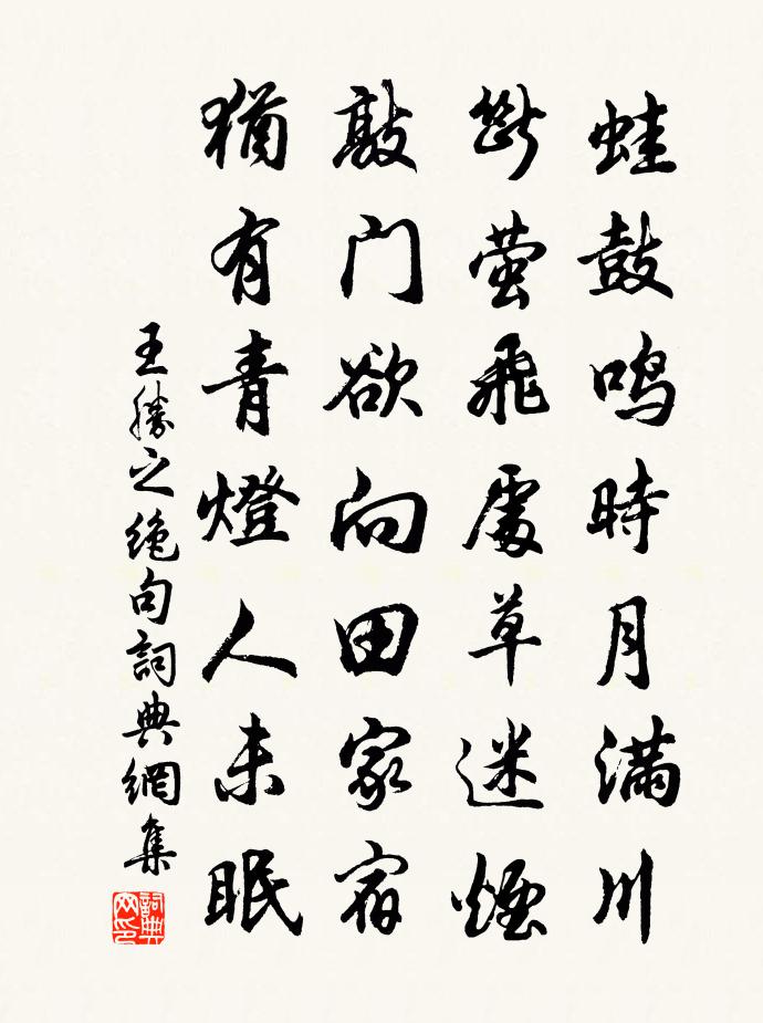 詩詞名句歷史字典書法欣賞書法字典國語詞典說文解字康熙字典古漢語字典標 題 作 者 詩 句 絕句作者:王勝之 朝代:宋代絕句原文蛙鼓鳴時月滿川,斷螢飛處草迷1*1煙。敲門欲向田家宿,猶有青燈人未眠。詩詞問答問:絕句的作者是誰?答:王勝之問:絕句寫於哪個朝代?答:宋代王勝之絕句書法欣賞絕句書法作品詩詞推薦明日又來天微陰再賦陸游〔宋代〕烏臼赤于楓,園林九月中。天寒山慘澹,雲薄日曈曨。旋摘分猿果,寬編養鶴籠。身閒足幽事,歸臥莫匆匆。酬報先上人登樓見寄(上人自峽下來)許渾〔唐代〕丹葉下西樓,知君萬里愁。鍾非黔峽寺,帆是敬亭舟。山色和雲暮,湖光共月秋。天台多道侶,何惜更南遊。贈相僧楊懶散張嵲〔宋代〕野鶴本長生,孤雲無定意。托跡雖世間,游心乃塵外。請問絳人年,曾觀柏寢器。微言洞倚伏,妙中驚人世。往夏折楊柳行謝靈運〔南北朝〕騷屑出穴風。揮霍見日雪。颼颼無久搖。皎皎幾時潔。未覺泮春冰。已復謝秋節。空對尺素遷。獨視寸陰滅。否桑長沙勸耕真德秀〔宋代〕田裡工夫著得勤,翻鋤須熟糞須均。插秧更要當時節,趁取陽和三月春。憶昔劉克莊〔宋代〕憶昔春郊共踏青,十人中已九凋零。溘先未遣隨朝落,殿後姑留作曙星。老眼蠅書猶可讀,微聾蟻鬧不須聽。申公寄內蘇泂〔宋代〕甕頭留得菊花春,過了重陽即誕辰。想見閨中為壽酒,只同兒女說歸人。戲答荊州王充道烹茶四首黃庭堅〔宋代〕香從靈堅壟上發,味自白石源中生。為公喚覺荊州夢,可待南柯一夢成。偈頌八十五首釋妙倫〔宋代〕穿人鼻孔,換人眼晴。都來只是這一句子,如何見得,題目分明。和虞永康美功堂詩魏了翁〔宋代〕我曾寄徑城南州,果杏纂纂香浮浮。雲開千仞雪山白,月照萬古滄江流。我時未得江山意,但愛高明甲西州。十年首尾吟邵雍〔宋代〕堯夫非是愛吟詩,詩是堯夫自省時。義若不為無勇也,幸如有過必知之。面前地惡猶能掃,心上田荒何所欺。從諫山口陳師道〔宋代〕重霧真成雨,疏簾不隔風。青林擁紅樹,家鶩雜賓鴻。漁屋渾環水,晴湖半落東。往來成一老,猶在半塗中。薦冰陳至〔唐代〕凌寒開涸沍,寢廟致精誠。色靜澄三酒,光寒肅兩楹。形鹽非近進,玉豆為潛英。禮自春分展,堅從北陸成。藉茅清湘驛送王柳州南歸二絕范成大〔宋代〕南歸北去路茫茫,不是行人也斷腸。可惜湘江春夜月,落花時節照離觴。下第春遊施肩吾〔唐代〕羈情含櫱復含辛,淚眼看花只似塵。天遣春風領春色,不教分付與愁人。試院即事呈諸公張耒〔宋代〕天街落日走鳴珂,咫尺衡門不許過。催去據鞍猶鶴望,爭觀夾道已雲羅。奏篇定有凌雲賦,招隱今無扣角歌。最苦送王季海敷文赴閩漕喻良能〔宋代〕鐵冠慷慨老臣風,諫紙雍容補袞功。久以精忠簡天上,暫將和氣到閩中。寄壽春使君陳學士釋希晝〔宋代〕三處波濤郡,連年輟謝公。春齋山藥遍,夜舶海書通。樓潤星河露,川寒鼓角風。誰當刊惠政,一一古賢同。水龍吟(賦酴醿)盧祖皋〔宋代〕盪紅流水無聲,暮煙細草黏天遠。低回倦蝶,往來忙燕,芳期頓懶。綠霧迷牆,翠虬騰架,雪明香暖。笑依依欲挽偈頌十首釋德光〔宋代〕口似備盆呵佛祖,牙如劍樹罵諸方。而今死入阿鼻獄,看你如何孟八郎。名句推薦舊曲梅花唱,新正柏酒傳。孟浩然《歲除夜會樂城張少府宅》 粉墮百花洲,香殘燕子樓。曹雪芹《唐多令·柳絮》 誰言千里自今夕,離夢杳如關塞長。薛濤《送友人》 晝成淒黯,雁飛過、垂楊轉青。吳文英《慶 * ·秋感》 應難奈,故人天際,望徹淮山,相思無雁足。史達祖《八歸·秋江帶雨》 明月照高樓,流光正徘徊。曹植《七哀》 國破山河在,城春草木深。杜甫《春望》 鞠躬盡瘁,死而後已。諸葛亮《後出師表》 北風夜卷赤亭口,一夜天山雪更厚。岑參《天山雪歌送蕭治歸京》 人主之患,在於信人,信人,則制於人。韓非及後人《韓非子·備內》