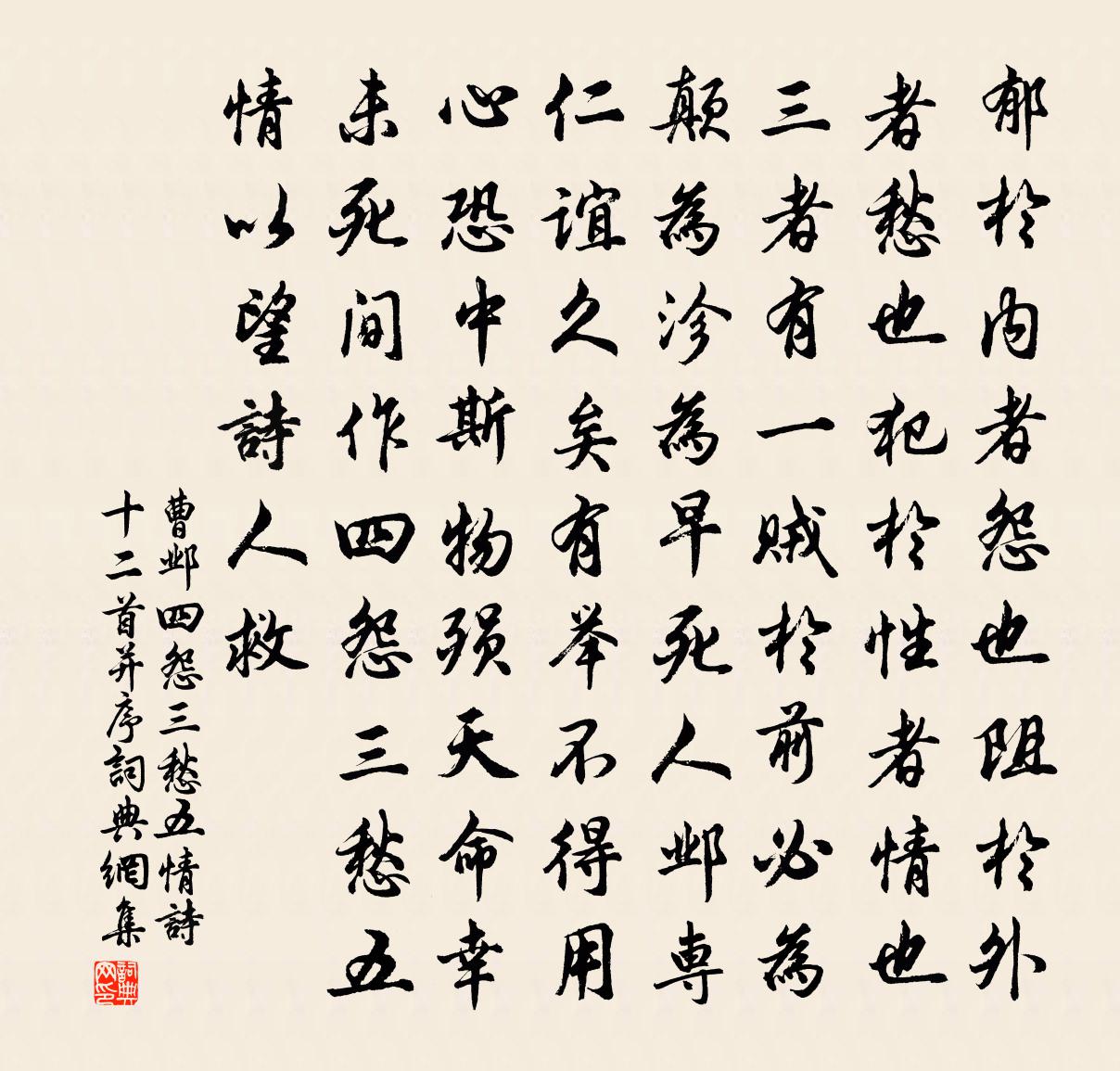 詩詞名句歷史字典書法欣賞書法字典國語詞典說文解字康熙字典古漢語字典標 題 作 者 詩 句 四怨三愁五情詩十二首並序作者:曹鄴 朝代:唐代四怨三愁五情詩十二首並序原文郁於內者怨也,阻於外者愁也,犯於性者情也。三者有一賊於前,必為顛、為沴、為早死人。鄴專仁誼久矣,有舉不得用心,恐中斯物殞天命,幸未死。間作《四怨三愁五情》以望詩人救。詩詞問答問:四怨三愁五情詩十二首並序的作者是誰?答:曹鄴問:四怨三愁五情詩十二首並序寫於哪個朝代?答:唐代曹鄴四怨三愁五情詩十二首並序書法欣賞四怨三愁五情詩十二首並序書法作品注釋全唐詩詩詞推薦觸龍說趙太后劉向〔先秦〕趙太后新用事,秦急攻之。趙氏求救於齊,齊曰:“必以長安君為質,兵乃出。”太后不肯,大臣強諫。太后明謂點絳唇黃公度〔宋代〕嫩綠嬌紅,砌成別恨千千斗。短亭回首。不是緣春瘦。一曲陽關,杯送纖縴手。還知否。鳳池歸後。無路陪尊酒。敬和大人新年韻洪咨夔〔宋代〕井渫得泉終必食,睽弧遇雨更須疑。毋庸伊尹要三聘,且學顏淵克四非。勢去鐵鞋無處覓,志亨金印有時累。梅花聲聲慢·壽魏方泉吳文英〔宋代〕鶯團橙徑,鱸躍蓴波,重來兩過中秋。酒市漁鄉,西風勝似春柔。宿春去年村墅,看黃雲、還委西疇。鳳池去,信小疾陸游〔宋代〕老不禁當病,經旬臥一床。亦知非疥癬,幸未至膏盲。水落灘初出,秋深草漸黃。非關畏人事,晚歲合深藏。送別羅堅文度正〔宋代〕重違直諒友,失入斗筲群。眇眇初晴日,蒙蒙欲暮雲。已荒三徑菊,無奈萬家薰。莫厭山中惡,山中妙莫雲。贈歙州妓趙嘏〔唐代〕灩灩橫波思有餘,庾樓明月墮雲初。揚州寒食春風寺,看遍花枝盡不如。徐鳧岩釋鑒〔宋代〕蕭然上方境,人稀知地僻。徙聞古仙人,石上有遺蹟。金剛隨機無盡頌知見不生分第三十一釋印肅〔宋代〕洪鐘渾鐵鑄,懸樓插雲勢。搖杵一擊時,此聲振天地。水調歌頭鄭元秀〔宋代〕園林夸富貴,紅綠簇枝頭。陽和毓秀,氣劘屈賈壓曹劉。翰墨場中獨步,灑落胸中萬卷,橫截百川流。邈視青雲侶訴衷情趙師俠〔宋代〕威靈千里護封圻。十萬戶歸依。白湖宮殿雲聳,香火盡虔祈。傾壽酒,誦聲詩。諒遙知。民康俗阜,雨潤風滋,功南院白居易〔唐代〕林院無情緒,經春不一開。楊花飛作穗,榆莢落成堆。壯氣從中減,流年逐後催。只應如過客,病去老迎來。洛陽春吟邵雍〔宋代〕用盡四時周一歲,唯春能見好花開。十千買酒未為貴,既去紅芳豈再來。臨江仙朱敦儒〔宋代〕直自鳳凰城破後,擘釵破鏡分飛。天涯海角信音稀。夢回遼海北,魂斷玉關西。月解重圓星解聚,如何不見人歸。好事近程大昌〔宋代〕白屋到橫金,已是蟠桃結子。更向仕途貪戀,是痴人呆慮。水晶宮裡飯蓴鱸,中菰第一義。留得鬢須遲白,是本來游四明山劉樊二真人祠,題山下孫氏居李頻〔唐代〕久在仙壇下,全家是地仙。池塘來乳洞,禾黍接芝田。起看青山足,還傾白酒眠。不知塵世事,雙鬢逐流年。浣溪沙(求年例貢余香)張元乾〔宋代〕花氣薰人百和香。少陵佳句是仙方。空教蜂蝶為花忙。和露摘來輕換骨,傍懷聞處惱迴腸。去年時候入思量。登嵩山十首 搗衣石蘇轍〔宋代〕玉女云為衣,飄搖不須搗。空傳岩下石,夜杵知誰抱。清泉供浣濯,素月鋪繒縞。人世迫秋寒,處處砧聲早。有感晁說之〔宋代〕吏隱兩非空百感,塗窮浪跡亦何哉。波濤遠引月華去,風雨常將月色來。孤學有誰同慷慨,獨愁無地重徘徊。謾談寄徐秋澗張汝勤〔宋代〕懷人渺渺數重山,風月將秋入夢寒。疑有清風生羽翼,去隨明月倚欄乾。名句推薦三山半落青天外,二水中分白鷺洲李白《登金陵鳳凰台》 君子有九思:視思明,聽思聰,色思溫,貌思恭,言思忠,事思敬,疑思問,忿思難,見得思義。孔子弟子《論語·季氏篇》 明朝事與孤煙冷,做滿湖、風雨愁人。吳文英《渡江雲三犯·西湖清明》 乘興南遊不戒嚴,九重誰省諫書函。李商隱《隋宮》 新啼痕壓舊啼痕,斷腸人憶斷腸人。王實甫《十二月過堯民歌·別情》 南國辛居士,言歸舊竹林孟浩然《都下送辛大之鄂》 胡馬嘶風,漢旗翻雪,彤雲又吐,一竿殘照。時彥《青門飲·寄寵人》 夫兩貴之不能相事,兩賤之不能相使,是天數也。荀子《荀子·王制》 晚歲登門最不才,蕭蕭華發映金罍蘇洵《九日和韓魏公》 歸來飽飯黃昏後,不脫蓑衣臥月明。呂岩《牧童 / 令牧童答鍾弱翁》