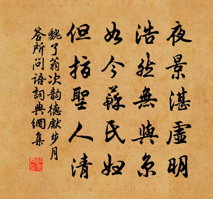 詩詞名句歷史字典書法欣賞書法字典國語詞典說文解字康熙字典古漢語字典標 題 作 者 詩 句 次韻德先步月答所問語作者:魏了翁 朝代:宋代次韻德先步月答所問語原文夜景湛虛明,浩然無與京。如今蘇氏婦,但指聖人清。詩詞問答問:次韻德先步月答所問語的作者是誰?答:魏了翁問:次韻德先步月答所問語寫於哪個朝代?答:宋代魏了翁次韻德先步月答所問語書法欣賞次韻德先步月答所問語書法作品詩詞推薦次韻陳宜中攜詩見防黃公度〔宋代〕朝來乾鵲啅檐牙,昨夜燈開送喜花。好事寧期貴公子,攜詩肯訪野人家。客愁到此逢寒食,薄宦羈人屢歲華。載酒呂望非熊邵定〔宋代〕呂望非熊,□□□伯與太公,千千歲,無此逢。使伯蚤而出獵兮,公方沽酒之匆匆。使伯遲而出獵兮,公已埋骨乎固陵道中三首文天祥〔宋代〕九天雲下垂,一雨作秋色。塵埃化泥塗,原野轉蕭瑟。十里一雙堠,狐兔臥荊棘。見說數年來,中州乍蘇息。雜曲歌辭古別離聶夷中〔唐代〕欲別牽郎衣,問郎游何處。不恨歸日遲,莫向臨邛去。江城口號二首董嗣杲〔宋代〕定江軍門擁雲氣,廬山面目長相朝。閫臣所持止一恕,牆壁何恨粘歌謠。讀仲退和胡秀才詩有感斯文用韻徐瑞〔宋代〕文章聖外無誰語,獨立蒼茫只屢愛。從渠高眼空四海,自古名家能幾人。愛鳥怒蟹言何淺,畫虎雕龍技漫新。吾道藍田溪雜詠二十二首洞仙謠(一作伺山徑)錢起〔唐代〕幾轉到青山,數重度流水。秦人入雲去,知向桃源里。自淇涉黃河途中作十三首高適〔唐代〕川上常極目,世情今已閒。去帆釣魚落日,征路隨長山。親友若雲霄,可望不可攀。於茲任所愜,浩蕩風波間。清夜聞鄰管劉商〔唐代〕何事霜天月滿空,鸝雛百囀向春風。鄰家思婦更長短,楊柳如絲在管中。竹枝詞蘇軾〔宋代〕自過鬼門關外天,命同人鮓瓮頭船。北人墮淚南人笑,青嶂無梯聞杜鵑。和谹父尋春之作王洋〔宋代〕農華女兒紅,芳草五孫綠。小大各盡態,低昂俱悅目,久雨脫滯著,振衣樂休沐。晴空吟思開,命簡句可屬。起看次韻張守酴醾二首劉子翬〔宋代〕退食黃堂喜自公,不妨幽興囑芳叢。雙旌不出閒春晝,大筆微吟綴祖風。老矣交朋今日少,飄然遊宦異鄉同。杖藜依韻和唐彥猷華亭十詠秦始皇馳道梅堯臣〔宋代〕秦帝觀滄海,勞人何得修。石橋虹霓斷,馳道鹿麋游。車轍久已沒,馬跡亦無留。驪山寶衣盡,萬古空冢丘。山房陸游〔宋代〕四紀移家剡曲傍,自茨生草作山房。寒侵夜艾知霜重,行遍天涯覺夢長。戒婢無勞事釵澤,課奴相率補陂塘。無衣柳枝詞十首徐鉉〔唐代〕風暖雲開晚照明,翠條深映鳳皇城。人間欲識靈和態,聽取新詞玉管聲。峴山送裴秀才赴舉皎然〔唐代〕漢家招秀士,峴上送君行。萬里見秋色,兩河傷遠情。王師出西鎬,虜寇避東平。天府登名後,回看楚水清。和慎思秋日同文館詩蔡肇〔宋代〕清月看初滿,黃花吐未齊。小山思隱桂,大谷憶佳梨。節物信可美,詩騷懶自題。長年諳獨宿,聽雨閉秋閨。彭澄之告以卜築佐之一緡一石二絕句以為親舊曾豐〔宋代〕家無儲粟況儲錢,佐費吾其以義先。一石一緡未為厚,量渠背負與腰纏。俞廣文以詩定交次韻奉答章甫〔宋代〕懶慢易招咎,貧賤難相知。客歸二十年,破屋臨江湄。遣悶豈無酒,寄懷徒有詩。慷慨思古人,恨不生同時。去秋江城子(三之三)秦觀〔宋代〕棗花金釧約柔荑。昔曾攜。事難期。咫尺玉顏,和淚鎖春閨。恰似小園桃與李,雖同處,不同枝。玉笙初度顫鸞篦名句推薦風雨淒淒,雞鳴喈喈。佚名《風雨》 烏啼隱楊花,君醉留妾家。李白《楊叛兒》 松下茅亭五月涼,汀沙雲樹晚蒼蒼。戴叔倫《題稚川山水》 九華山路雲遮寺,清弋江村柳拂橋。杜牧《宣州送裴坦判官往舒州時牧欲赴官歸京》 人皆可罪,罪人須定其人。來俊臣《羅織經·問罪卷第十》 欲訴奇愁無可訴,算興亡、已慣司空見。梁啓超《金縷曲·丁未五月歸國旋復東渡卻寄滬上諸君子》 此馬非凡馬,房星本是星。李賀《馬詩二十三首·其四》 和氣吹綠野,梅雨灑芳田。李世民《詠雨》 陽月南飛雁,傳聞至此回。宋之問《題大庾嶺北驛》 垂楊拂綠水,搖艷東風年。李白《折楊柳》