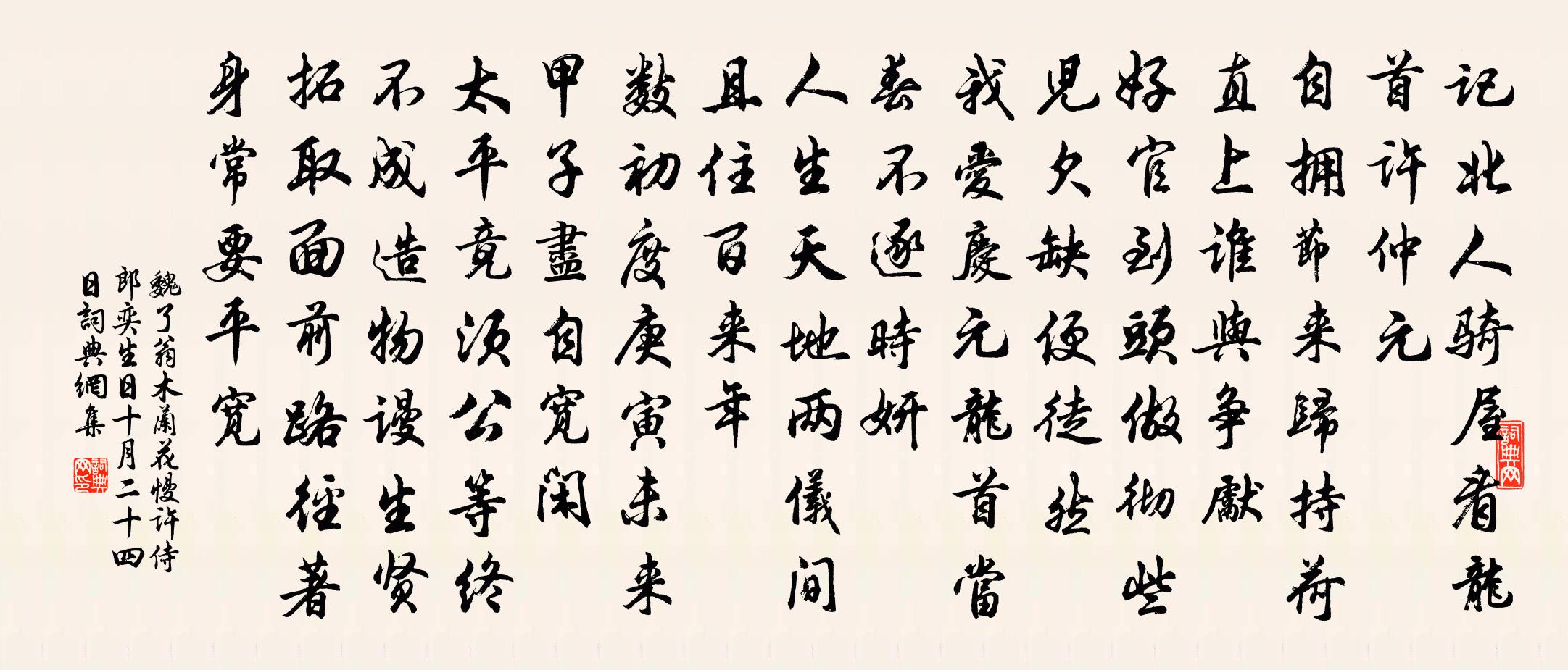 詩詞名句歷史字典書法欣賞書法字典國語詞典說文解字康熙字典古漢語字典標 題 作 者 詩 句 木蘭花慢(許侍郎奕生日十月二十四日)作者:魏了翁 朝代:宋代原文記北人騎屋,看龍首、許仲元。自擁節來歸,持荷直上,誰與爭先。好官到頭做徹,些兒欠缺便徒然。我愛慶元龍首,當春不逐時妍。人生天地兩儀間。且住百來年。數初度庚寅,未來甲子,儘自寬閒。太平竟須公等,終不成、造物謾生賢。拓取面前路徑,著身常要平寬。詩詞問答問:《木蘭花慢(許侍郎奕生日十月二十四日)》的作者是誰?答:魏了翁問:該詩寫於哪個朝代?答:宋代問:該詩是什麼體裁?答:詞書法欣賞木蘭花慢(許侍郎奕生日十月二十四日)書法作品詩詞推薦少年行三首李嶷〔唐代〕十八羽林郎,戎衣侍漢王。臂鷹金殿側,挾彈玉輿傍。馳道春風起,陪游出建章。侍獵長楊下,承恩更射飛。塵生次韻答申屠子迪府推王冕〔元代〕今日風光好,梅花滿屋春。年年長在客,事事不如人。道路貂裘敝,庭闈鶴髮新。曉來看雨露,小草亦精神。頌四賓主釋印肅〔宋代〕一揮凜凜劍鋒寒,函蓋乾坤絕自觀。堪笑天龍無可說,示人祗在指頭端。送稅官仇副使詩十首熊禾〔宋代〕課餘自喔詩,詩罷還教子。時時視橐余,質鬻市薪米。公子家二首李山甫〔唐代〕曾是皇家幾世侯,入雲高第照神州。柳遮門戶橫金鎖,花擁弦歌咽畫樓。錦袖妒姬爭巧笑,玉銜驕馬索閒遊。 * 早秋山中作李山甫〔唐代〕誰到山中語,雨餘風氣秋。煙嵐出澗底,瀑布落床頭。至道亦非遠,僻詩須苦求。千峰有嘉景,拄杖獨巡遊。送超侍者釋慧空〔宋代〕空生眾中居,似欠人偈債。超禪歸臨安,亦來相惱害。布袋連底翻,一還無復載。閉門鄭新經,後來且莫怪。去去題謝清音道人扇面葉翥〔宋代〕歸休謝去世間忙,看畫題詩引興長。忽見遠山來幾席,方知妙筆出閨房。百杯歌徹行雲住,萬象心營點墨香。珍重秉文薦對報罷赴任有詩示予遂和李復〔宋代〕廣文予所知,京國十年舊。出背錦囊歸,人嘲飯山瘦。去歲近臣薦,三接期在晝。孤鴻鎩翮久,高舉或可就。慘澹示徒釋印肅〔宋代〕未得塵勞息,須依善知識。若肯慈悲學,發願施心力。入泥併入水,莫作閒戲劇。揚眉動目庭,法身無窮極。於中病起書院偶成盛世忠〔宋代〕蓄水滋蘭畹,開窗近竹林。敗糊黃蟣閧,斷簡老蟲侵。酒尚欺人病,詩能對客吟。晨昏一飲足,此外不關心。又和曾秘丞見贈王禹偁〔宋代〕非才誤受帝恩深,報國空存一片心。命薄任從官進退,道孤難與眾浮沉。日邊信斷無歸夢,滁上公餘且醉吟。勞寄送呂令防赴海門宰韓元吉〔宋代〕五斗由來豈療貧,尚應拄笏對秋雲。未嗟薄宦來還去,但覺頻年我送君。舍北水生思共賞,淮南米賤好相聞。白魚普陀宗乘廟落成拈香得句乾隆〔清代〕遞肖何妨屢普陀,金剛四句括無多。層樓金瓦輝香象,偏袒黃衣演法螺。虔為祝釐開八秩,會逢歸極仰三摩。撰良贈趙廉州范成大〔宋代〕馬群雜沓草蒙茸,刮目權奇一洗空。天末也煩行李到,歲寒聊得酒尊同。梅花夜夜湘南雨,榕葉年年海北風。少待甘州/八聲甘州張炎〔宋代〕俯長江、不占洞庭波,山拔地形高。對扶疏古木,浮圖倒影,勢壓雄濤。門掩翠微僧院,應有月明敲。物換堂安在奉韻酬謝張埴〔宋代〕得失無常所未論,相輝輩行幾人存。小山政自慚為弟,老瓦何期飲到孫。橘盎且還諸老樂,梅花尤是丈人尊。向誰郊居秋晚五首趙蕃〔宋代〕庭菊種匪晚,秋風開爾遲。人嗟地力薄,我有歲寒期。蘭芷元同類,藁萊敢肆欺。懷哉非失所,社老謾銜悲。傷嬾巢蘇泂〔宋代〕車水池邊句尚新,重來手帖更精神。知他的赴何方約,一去茫茫不告人。送曹西士宰建昌翁卷〔宋代〕買得秋風棹,江行不問程。誰知書判筆,中有惠慈情。舊治川僧說,新銜楚吏迎。名山皆在望,應費好詩評。名句推薦見說新愁,如今也到鷗邊張炎《高陽台·西湖春感》 東船西舫悄無言,唯見江心秋月白。白居易《琵琶行 / 琵琶引》 父兄有惡行,子弟學之則無不肖王永彬《圍爐夜話·第三三則》 水流濕,火就燥。雲從龍,風從虎。佚名《易傳·文言傳·乾文言》 斜髻嬌娥夜臥遲,梨花風靜鳥栖枝。唐寅《美人對月》 愁看飛雪聞雞唱,獨向長空背雁行。羅鄴《早發》 迴廊一寸相思地,落月成孤倚。納蘭性德《虞美人·銀床淅瀝青梧老》 天覆吾,地載吾,天地生吾有意無。李泌《長歌行》 心之憂危,若蹈虎尾,涉於春冰。佚名《尚書·周書·君牙》 土膏欲動雨頻催,萬草千花一餉開;范成大《春日田園雜興》