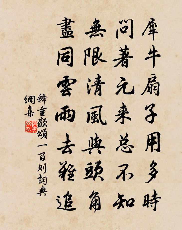 詩詞名句歷史字典書法欣賞書法字典國語詞典說文解字康熙字典古漢語字典標 題 作 者 詩 句 頌一百則作者:釋重顯 朝代:宋代頌一百則原文犀牛扇子用多時,問著元來總不知。無限清風與頭角,盡同雲雨去難追。詩詞問答問:頌一百則的作者是誰?答:釋重顯問:頌一百則寫於哪個朝代?答:宋代釋重顯頌一百則書法欣賞頌一百則書法作品詩詞推薦諸葛仁叟縣丞極貧能保風節有權貴招之不屑其戴復古〔宋代〕時人誰識老聲丞,滿口常談杜少陵。俗輩眾多吾輩少,素交零落利交興。權門炙手炎如火,詩社投身冷似冰。堪笑句宋慶之〔宋代〕城中豈雲隘,我見無夷途。所以龐德公,車不向此驅。斜陽掛林杪,野花續春餘。數年何處客,昨夜獨歸船。飄泊為惟翁題非畫圖釋紹曇〔宋代〕誤入蓬壺影里游,諭盟白鳥下滄洲。吞波島嶼鰲身黑,映日樓台蜃氣浮。門逆潮開喧海市,綱沿堤曬簇漁舟。晦明洪州逢熊孺登白居易〔唐代〕靖安院裡辛夷下,醉笑狂吟氣最粗。莫問別來多少苦,低頭看取白髭鬚。棗花董嗣杲〔宋代〕香落衣巾靡靡中,花垂碧澗不流冬。易開易落催成子,誰采誰收怕見紅。種有萬林綿北地,詩傳八月剝西風。千株同張侍御宴北樓儲光羲〔唐代〕今之太守古諸侯,出入雙旌垂七旒。朝覽干戈時聽訟,暮延賓客復登樓。西山漠漠崦嵫色,北渚沉沉江漢流。良宵席上呈正老強至〔宋代〕去年贈別折寒梅,盡道行人不再來。今日樽前成邂逅,大家花下且徘徊。經春雨腳無時斷,浮世眉頭幾度開。莫待和韋侍御寓直對雨錢起〔唐代〕名貴四科首,班宜二妙齊。如何厭白簡,未得步金閨。寓直晦秋雨,吟餘聞遠雞。漏聲過旦冷,雲色向窗低。誰謂戲書方回〔宋代〕春天晴更好,無奈惡情懷。馬死鞍空在,花開酒欠佳。鄰醫賒藥餌,侍婢典簪釵。倚杖吟還喜,新分孔暮楷。夏日陸游〔宋代〕暑雨初晴晝漏遲,江鄉樂事有誰知?村村隴麥登場後,戶戶吳蠶拆簇時。大滌洞天留題樊處恭〔宋代〕持杯睥睨不逾時,一派寒聲落翠微。蛟室倒翻珠亂躍,瓊田耕破玉紛飛。壯懷搖動頻扶檻,濺沫飄零欲濕衣。繞磵朝中措 張允濟子滿啐蒲道源〔元代〕熊罷佳兆應神簽。何必夢中占。看取隆顱犀角,不愁長守齊鹽。今朝滿*,諸般排比,筆墨先拈。休道添丁無用,一剪梅·唱到陽關第四聲劉仙倫〔宋代〕唱到陽關第四聲。香帶輕分。羅帶輕分。杏花時節雨紛紛。山繞孤村。水繞孤村。更沒心情共酒尊。春衫香滿,空城南尋梅得句四首陸游〔宋代〕老子今年嬾賦詩,風光料理鬢成絲。青羊宮裡春來早,初見梅花第一枝。用秦公贈李次仲韻呈次仲三首曹勛〔宋代〕欲求玄牝蘊清華,莫放朝昏子午差。收得五華滋湛露,自應雙鶴下青霞。頗聞北海終棲火,莫向東陵只種瓜。它日季氏將伐顓臾佚名〔先秦〕季氏將伐顓臾。冉有、季路見於孔子曰:“季氏將有事於顓臾。” 孔子曰:“求!無乃爾是過與?夫顓臾,昔水仙謠溫庭筠〔唐代〕水客夜騎紅鯉魚,赤鸞雙鶴蓬瀛書。輕塵不起雨新霽,萬里孤光含碧虛。露魄冠輕見雲發,寒絲七炷香泉咽。夜深游韋七洞庭別業孟郊〔唐代〕洞庭如瀟湘,疊翠盪浮碧。松桂無赤日,風物饒清激。逍遙展幽韻,參差逗良覿。道勝不知疲,冥搜自無斁。曠然冬至夜懷湘靈白居易〔唐代〕艷質無由見,寒衾不可親。何堪最長夜,俱作獨眠人。宴徐大參方大琮〔宋代〕麟符久合又貂蟬,又向鄉邦擁十年。眼赤腰黃天寵澤,顏紅鬢綠地神仙。極知書繡堪行染,見說宵衣正渴賢。好事名句推薦古木陰中系短篷,杖藜扶我過橋東。志南《絕句》 山中一夜雨,樹杪百重泉。王維《送梓州李使君》 鴻雁來時,無限思量。晏殊《訴衷情·芙蓉金菊斗馨香》 用舍由時,行藏在我,袖手何妨閒處看。蘇軾《沁園春·孤館燈青》 不求見面惟通謁,名紙朝來滿敝廬。文徵明《拜年》 秋聲萬戶竹,寒色五陵松。李頎《望秦川》 風含翠篠娟娟淨,雨裛紅蕖冉冉香。杜甫《狂夫》 飢則附人, 飽便高颺房玄齡《晉書·載記·第二十三章》 榴葉擁花當北戶,竹根抽筍出東牆。湯允績《浣溪沙·燕壘雛空日正長》 平岡細草鳴黃犢,斜日寒林點暮鴉。辛棄疾《鷓鴣天·陌上柔桑破嫩芽》