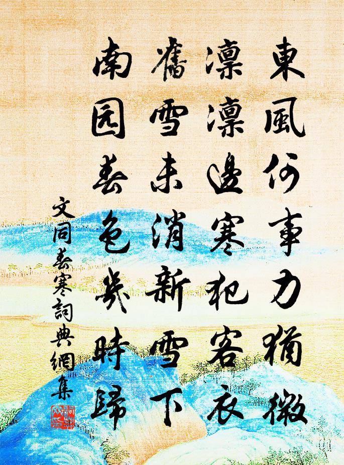 詩詞名句歷史字典書法欣賞書法字典國語詞典說文解字康熙字典古漢語字典標 題 作 者 詩 句 春寒作者:文同 朝代:宋代春寒原文東風何事力猶微,凜凜邊寒犯客衣。舊雪未消新雪下,南園春色幾時歸。詩詞問答問:春寒的作者是誰?答:文同問:春寒寫於哪個朝代?答:宋代文同春寒書法欣賞春寒書法作品詩詞推薦賀新郎(寄辛潭州)楊炎正〔宋代〕夢裡驂鸞馭。望蓬萊不遠,翩然被風吹去。吹到楚樓煙月上,不記人間何處。但疑是、蓬壺別所。縹緲霓裳天女隊汝墳別業祖詠〔唐代〕失路農為業,移家到汝墳。獨愁常廢卷,多病久離群。鳥雀垂窗柳,虹霓出澗雲。山中無外事,樵唱有時聞。題雪峰因大夢頂相李昴英〔宋代〕終朝咬菜根,那得許精神。自笑形為贅,從渠畫不真。閒雲留片影, * 化千身。大夢何時覺,痴人問木人。久欲乞歸未得一日蒙恩放歸不勝欣喜塗中得十吳芾〔宋代〕我病只宜投紱去,君恩卻許奉祠歸。小人報國非無志,正恐叨逾觸禍機。點絳唇(送常守陳正同應之還朝)蔡伸〔宋代〕解紱朝天,滿城桃李繁陰布。彩舟難駐。忍聽驪歌舉。協贊中興,聖意方傾注。從今去。五雲深處。穩步沙堤路。嘉泰三年皇后冊寶十三首佚名〔宋代〕服煥盛德,班分華緻。九嬪婦職,六寐內治。參差荇菜,求勤寤寐。函然來思,相禮讚祭。雜體詩 潘黃門岳述哀江淹〔南北朝〕青春速天機。素秋馳白日。美人歸重泉。悽愴無終畢。殯宮已肅清。松柏轉蕭瑟。俯仰未能弭。尋念非但一。撫衿回文偈四首宋太宗〔宋代〕垂要理真詮。下缺醉吟二首楊萬里〔宋代〕十載人間樂與憂,幾曾半點到心頭。梧桐葉上秋無價,蟋蟀聲中月亦愁。暮角曉鍾何日了,蒼顏華發此生休。吟顛和君實端明洛陽看花邵雍〔宋代〕洛陽交友皆奇傑,遞賞名園只似家。卻笑孟郊窮不慣,一日看盡長安花。書室中焚法煮降真香鄭剛中〔宋代〕村落縈盤草半遮,到門猶未識人家。終朝靜坐無相過,慢火薰香到日斜。滕王閣釋晦機〔宋代〕檻外長江去不回,檻前楊柳後人栽。當時唯有西山在,曾見滕王歌舞來。偈頌五十一首釋大觀〔宋代〕三疊秋風古調清,移商換徵許誰聽。周郎一雇揚鞭去,雲外數峰江上青。送真泉州曾極〔宋代〕隱然風節動朝行,屢叩龍墀貢皂囊。未促相如歸蜀道,翻令汲黯去淮陽。便潘自足榮萊服,邃殿誰當補舜裳。急召袁州州學記李覯〔宋代〕皇帝二十有三年,制詔州縣立學。惟時守令,有哲有愚。有屈力殫慮,祗順德意;有假官借師,苟具文書。或連數送程尊師東遊有寄羅隱〔唐代〕華蓋峰前擬卜耕,主人無奈又閒行。且憑鶴駕尋滄海,又恐犀軒過赤城。絳簡便應朝右弼,紫旄兼合見東卿。勸君水調歌頭林淳〔宋代〕瀟灑東湖上,夜雨洗清秋。朝來塵霽,凝望千里興悠悠。山色揉藍深染,波影青銅新鑄,□冷翠光浮。蓑笠真吾事酹月亭吳儆〔宋代〕周郎人道古英雄,漢室顛危合奮忠。萬里中原猶未復,一視赤壁偶成功。新亭且對江山勝,陳跡俱隨歲月空。把酒次韻徐中散丙寅二月見訪之什朱長文〔唐代〕數年解紱隱林扉,乘興頻來訪羽池。老似樂天兼少病,官如叔夜又能詩。身閒幸與耆英接,學淺虛蒙國士如。白雪和子由送將官梁左藏仲通蘇軾〔宋代〕雨足誰言春麥短,城堅不怕秋濤卷。日長惟有睡相宜,半脫紗巾落紈扇。芳草不鋤當戶長,珍禽獨下無人見。覺來名句推薦歌中醉倒誰能恨,唱罷歸來酒未消。晏幾道《鷓鴣天·小令尊前見玉簫》 此身行作稽山土,猶吊遺蹤一泫然。陸游《沈園二首》 人之性惡,其善者偽也。荀子《荀子·性惡》 嘆寄與路遙,夜雪初積。姜夔《暗香疏影》 人處疾則貴醫。韓非及後人《韓非子·解老》 立身不嫌家世貧賤,但能忠厚老成,所行無一毫苟且處,便為鄉黨仰望之人。王永彬《圍爐夜話·第十七則》 不才明主棄,多病故人疏。孟浩然《歲暮歸南山 / 歸故園作 / 歸終南山》 身既死兮神以靈,魂魄毅兮為鬼雄。屈原《國殤》 天秋木葉下,月冷莎雞悲。李白《秋思》 水至清則無魚,人太急則無智。佚名《增廣賢文·上集》