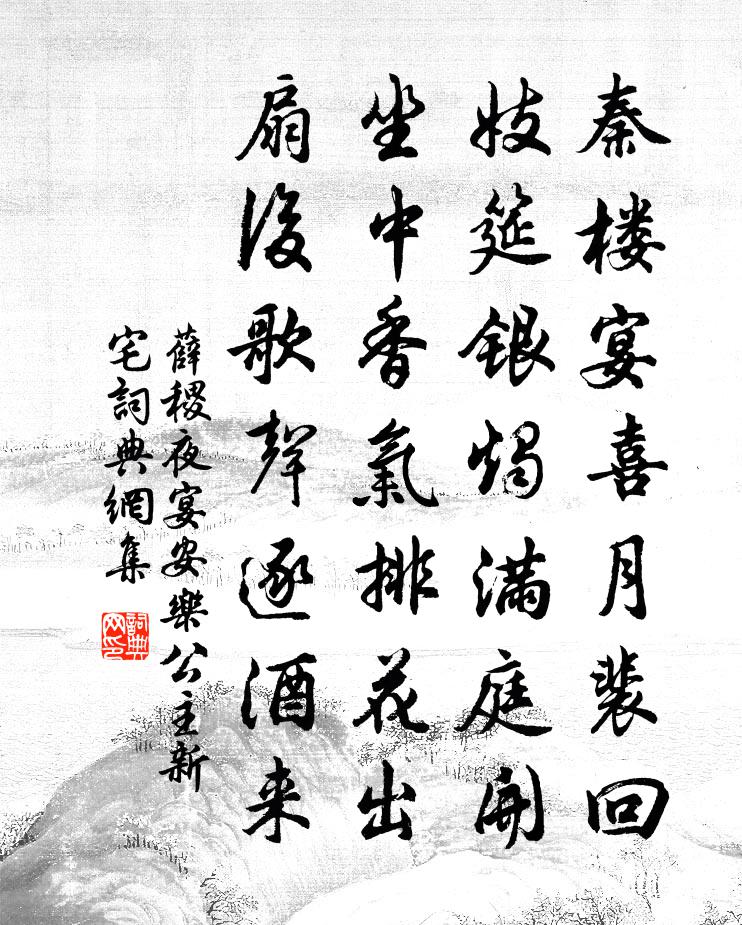 詩詞名句歷史字典書法欣賞書法字典國語詞典說文解字康熙字典古漢語字典標 題 作 者 詩 句 夜宴安樂公主新宅作者:薛稷 朝代:唐代夜宴安樂公主新宅原文秦樓宴喜月裴回,妓筵銀燭滿庭開。坐中香氣排花出,扇後歌聲逐酒來。詩詞問答問:夜宴安樂公主新宅的作者是誰?答:薛稷問:夜宴安樂公主新宅寫於哪個朝代?答:唐代問:夜宴安樂公主新宅是什麼體裁?答:七絕薛稷夜宴安樂公主新宅書法欣賞夜宴安樂公主新宅書法作品注釋全唐詩:卷93_26詩詞推薦哀病驄呈致用元稹〔唐代〕櫪上病驄啼褭褭,江邊廢宅路迢迢。自經梅雨長垂耳,乍食菰蔣欲折腰。金絡頭銜光未滅,玉花衫色瘦來燋。曾聽養疾陸游〔宋代〕齒耄嬰新疾,才衰減舊名。短邸扶蹇步,小院愜幽情。卜叟言災退,醫翁賀脈平。飯香炊罷亞,羹美馣蕪菁。菊穎發粟至石陂寺王安石〔宋代〕驀水穿山近更賒,三更燃火飯僧家。乘田有秩難逃責,從事雖勤敢嘆嗟。嘉禾百詠白蓮沼張堯同〔宋代〕池波圍為止面,艷艷玉開花。自可除簾幕,清香不用遮。過北雁盪山下林景熙〔宋代〕驛路入芙蓉,秋高見早鴻。盪雲飛作雨,海日射成虹。一水通龍穴,諸峰盡佛宮。如何靈運屐,不到此山中。挽龔汀州二首劉克莊〔宋代〕所守老尤剛,清風凜不亡。洞房無粉黛,堊室屏緇黃。東閣遵遺令,南山獻吉藏。百年耆舊盡,里社轉淒涼。生查子周紫芝〔宋代〕輕雲淺護霜,曉日紅生砌。煙共寶薰濃,人與山長翠。銀浪酒杯濃,錦幄雙鸞戲。庭下彩衣郎,共祝千千歲。再次韻二首陳造〔宋代〕雪神不袖噓枯手,嗣歲豐登預告成。泚筆徑煩書上瑞,載途況已沸歡聲。騎驢有客搜新句,扶路何人趁晚晴。一笑挽蔡文叔王柏〔宋代〕南風南風兮,莫蘇槁質。坎離互宅兮,已翩翩乎月窟。駕朱鳥以啟路兮,潛玄宮而永息。終長夜之漫漫兮,委人間寄十二侄陸游〔宋代〕庚寅吾入蜀,西過齊安城。雪堂拜老仙,眉宇寒崢嶸。微泉尚如昔,激激琴築聲。龍蛇入筆力,斷石臥縱橫。戊戌青玉案(至宜州次韻上酬七兄)黃庭堅〔宋代〕煙中一線來時路。極目送、歸鴻去。第四陽關雲不度。山胡新囀,子規言語。正在人愁處。憂能損性休朝暮。憶我念奴嬌 勞勞亭鄭燮〔清代〕勞勞亭畔,被西風一吹,逼成衰柳。如線如絲無限恨,和風和煙。江上征帆,尊前別淚,眼底多情友。寸言不盡,慶潯州廖太守四首許縣尉〔宋代〕潯江千騎擁雙旌,泮不依然舊貫仍。不但袴襦歌惠政,更今矜佩樂師承。朱幡太守來何暮,絳帳先生自此升。預想溧水道中仇遠〔宋代〕五峰合沓擁東廬,泉落芳塘旱不枯。空鑿秦淮三百里,六朝王氣幾曾無。憶仙姿(九之九)賀鑄〔宋代〕夢想山陰遊冶。深徑碧桃花謝。曲水穩流觴,暖絮芳蘭堪藉。蕭灑。蕭灑。月棹煙蓑東下。宜興山房十首李曾伯〔宋代〕齋罷雞志轉午天,地虛人寂境蕭然。兩三衲子自來去,時取茶芽煮澗泉。憶故山贈司空曙李端〔唐代〕漢主金門正召才,馬卿多病自遲回。舊山暫別老將至,芳草欲闌歸去來。雲在高天風會起,年如流水日長催。知君報任少卿書 / 報任安書司馬遷〔兩漢〕太史公牛馬走司馬遷,再拜言。 少卿足下:曩者辱賜書,教以慎於接物,推賢進士為務,意氣勤勤懇懇。若望越谿怨冷朝光〔唐代〕越王宮裡如花人,越水谿頭采白蘋。白蘋未盡人先盡,誰見江南春復春。偈頌一百一十七首釋紹曇〔宋代〕四十年同參,廿餘年相別。不唱菩薩蠻,休暇說佛法。驀劄相逢十二峰,我患生盲你患聾。是聖是凡都莫問,且分名句推薦言則稱於湯文,行則譬於狗豨,傷矣哉。墨子《墨子·46章 耕柱》 還作江南會,翻疑夢裡逢。戴叔倫《客夜與故人偶集 / 江鄉故人偶集客舍》 白日放歌須縱酒,青春作伴好還鄉。杜甫《聞官軍收河南河北》 恩疏寵不及,桃李傷春風。李白《上之回》 寒色孤村幕,悲風四野聞。洪升《雪望》 捫蘿正意我,折桂方思君。范雲《送沈記室夜別》 道不拾遺,民不妄取劉向《戰國策·秦一·衛鞅亡魏入秦》 一年之計在於春,一日之計在於寅。佚名《增廣賢文·上集》 疾風知勁草,板蕩識誠臣。李世民《賜蕭瑀》 空山新雨後,天氣晚來秋。王維《山居秋暝》