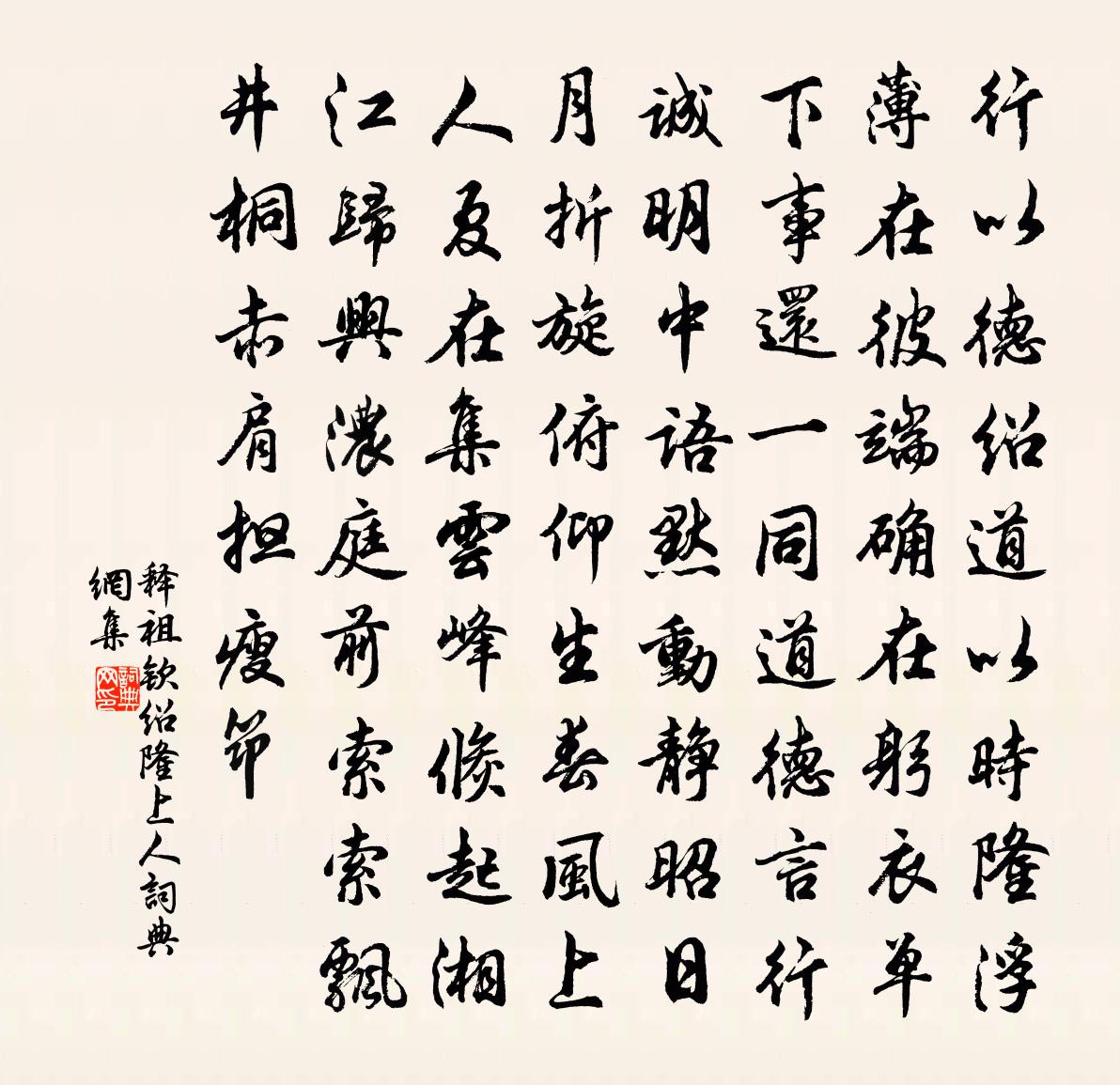 詩詞名句歷史字典書法欣賞書法字典國語詞典說文解字康熙字典古漢語字典標 題 作 者 詩 句 紹隆上人作者:釋祖欽 朝代:宋代紹隆上人原文行以德紹,道以時隆。浮薄在彼,端確在躬。衣單下事還一同,道德言行誠明中。語默動靜昭日月,折旋俯仰生春風。上人夏在集雲峰,倏起湘江歸興濃。庭前索索飄井桐,赤肩擔瘦筇。詩詞問答問:紹隆上人的作者是誰?答:釋祖欽問:紹隆上人寫於哪個朝代?答:宋代釋祖欽紹隆上人書法欣賞紹隆上人書法作品詩詞推薦賀新郎(寄辛潭州)楊炎正〔宋代〕夢裡驂鸞馭。望蓬萊不遠,翩然被風吹去。吹到楚樓煙月上,不記人間何處。但疑是、蓬壺別所。縹緲霓裳天女隊虎丘王諶〔宋代〕五百年前吾祖宅,雲孫從昔未曾經。山藏古寺窗連碧,水繞平田稻正青。台染夜雲微帶潤,劍涵秋水尚余腥。僧堂題李三書齋 崇嗣陳子昂〔唐代〕灼灼青春仲。悠悠白日升。聲容何足恃。榮吝坐相矜。願與金庭會。將待玉書征。還丹應有術。煙駕共君乘。元應善利真人祠唐仲友〔宋代〕桐柏亦何有,清輝照瓊台。眾泉注金石,萬木羅琳瑰。玉室靜窈窕,鶴轡紛徘徊。紫雲擁飛蓋,知是真仙來。句陳詩〔宋代〕如何五載後,不問九疑歸。縱目陳棣〔宋代〕思窮煙浪闊,目斷暮雲層。舊賞去何有,新詩得未曾。披章如對景,搜句懶挑燈。酬唱慚非敵,君千我百能。龍女祠後塘自生荷花數權與史誠之更相酬和司馬光〔宋代〕清江向晚採蓮稀,獨倚蘭膛久未歸。目斷可堪人不至,斜風細雨濕羅衣。挽趙通判五首彭龜年〔宋代〕風波要自吾心定,涇渭從渠何日分。公已著身榮辱外,世間餘子自紛紛。酬蔡十二博士見寄四韻權德輿〔唐代〕蕪城十年別,蓬轉居不定。終歲白屋貧,獨謠清酒聖。風塵韋帶減,霜雪松心勁。何以浣相思,啟元能盡性。秋思陸游〔宋代〕少日猖狂不自謀,即今垂死更何求?簡編不隔聖賢面,夢寐時為河嶽游。濁酒未傾心已醉,長歌欲發涕先流。石帆布袋贊釋祖先〔宋代〕散誕不拘儀軌,街頭走到街尾。逢人大笑呵呵,那個知渠肚裡。薄薄酒陳造〔宋代〕薄薄酒,顏可丹。粗粗布,身不寒。醜醜婦,貧相歡。人生浪行路難,欲不外騖心內安。富貴底用極力奸,政自沐十六日伏睹明堂禮成聖駕恭謝太一宮小臣敬成蘇泂〔宋代〕黃門馳馬去如雲,末後椒房駕玉輪。驚起秋風無處避,變成三月萬花春。同范長官鄭主簿送戰船至鹽嶼江上奉酬應尉林亦之〔宋代〕相送長江風浪輕,尉仙真自好心情。四更明月宿何處,魚骨山前第一程。次韻雪後書事二首朱熹〔宋代〕惆悵江頭幾樹梅,杖藜行繞去還來。前時雪壓無尋處,昨夜月明依舊開。折寄遙憐人似玉,相思應恨劫成灰。沉吟戰國吟邵雍〔宋代〕七國之時尚戰爭,威強智詐一齊行。廉頗白起善用兵,蘇秦張儀善縱橫。朝為布衣暮衣卿,昨日鼎食今鼎烹。范雎和景仁試明經大義多不通有感歐陽修〔宋代〕庠序制猶闕,鄉閭教不行。古於經學政,今也藝虛名。來者益可鄙,待之因愈輕。無徒誚其陋,講勸在公卿。壽林處士連文鳳〔宋代〕人物推先輩,江湖姓字香。今年方八十,此老不尋常。道義襟期重,詩書氣味長。顧余蒲柳質,那得似彭郎。句葉適〔宋代〕初分大道非常道,才有先天未後天。西江月朱彝尊〔清代〕傍玉何曾暑熱,惜香最恨眠遲。殘燈未殺影迷離,一點紗龍紅蕊。小雨初過庭樹,新涼漸近羅幃。殷勤臨別為披衣名句推薦人不可以無恥。無恥之恥,無恥矣。孟子《孟子·盡心章句上·第六節》 菊花信待重陽久,桂子香聞上界留。慧霖《閏中秋玩月》 寒山吹笛喚春歸,遷客相看淚滿衣。李益《春夜聞笛》 回首天涯歸夢,幾魂飛西浦,淚灑東州。周密《一萼紅·登蓬萊閣有感》 荷笠帶斜陽,青山獨歸遠。劉長卿《送靈澈上人》 秋風吹到江村,正黃昏,寂寞梧桐夜雨不開門。顧彩《相見歡·秋風吹到江村》 楚鄉飛鳥沒,獨與碧雲還。錢起《送夏侯審校書東歸》 出犯繁花露,歸穿弱柳風溫庭筠《清明日》 真積力久則入。荀子《荀子·勸學》 人之所助者,信也。佚名《易傳·繫辭傳上·第十二章》
