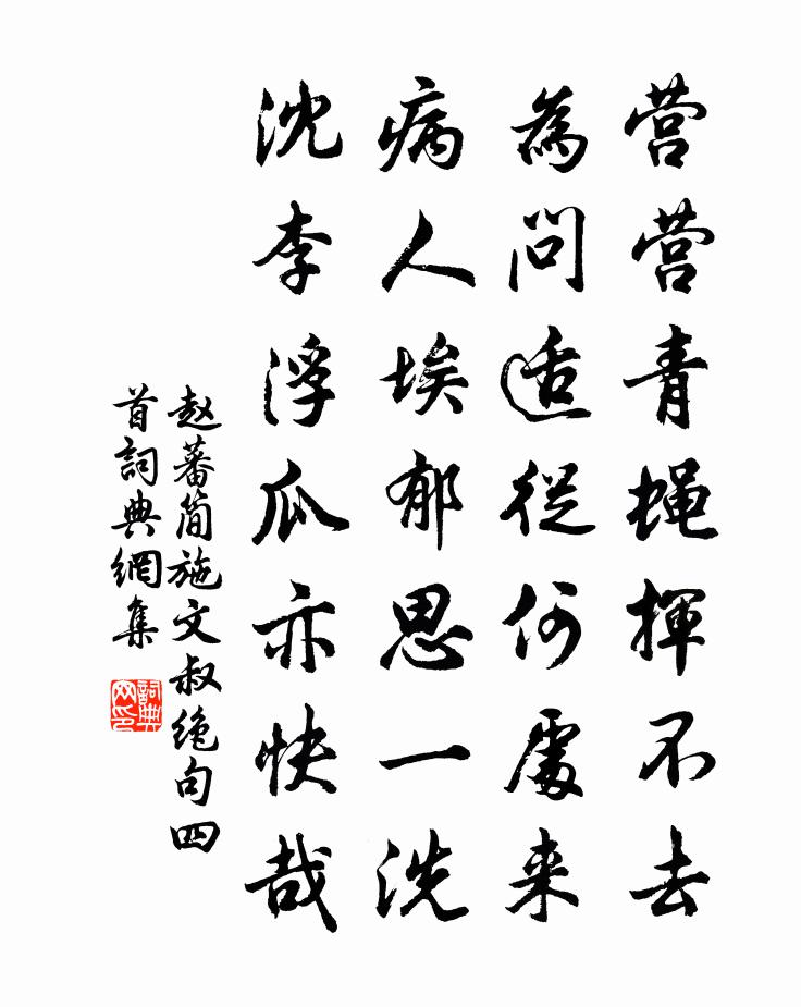 詩詞名句歷史字典書法欣賞書法字典國語詞典說文解字康熙字典古漢語字典標 題 作 者 詩 句 簡施文叔絕句四首作者:趙蕃 朝代:宋代簡施文叔絕句四首原文營營青蠅揮不去,為問適從何處來。病人埃郁思一洗,沈李浮瓜亦快哉。詩詞問答問:簡施文叔絕句四首的作者是誰?答:趙蕃問:簡施文叔絕句四首寫於哪個朝代?答:宋代趙蕃簡施文叔絕句四首書法欣賞簡施文叔絕句四首書法作品詩詞推薦憶王孫王丹桂〔元代〕本來真性喚神仙。為愛幽棲遠市廛。獨隱山堂妙最玄。樂恬然。欣即春晴二首郭印〔宋代〕二月垂楊長綠柯,漁村春塢景融和。沙邊細浪搖芳藻,水上紅雲映綠波。風裊釣絲時蕩漾,日移花影更婆娑。徑須念奴嬌(四和)劉克莊〔宋代〕太丘晚節,把家事、一切傳他諶紀。業已休休,又誰解露綬,會稽郡邸。張丈殷兄,阮生朱老,相與為唇齒。酒樓將拆舊屋權住西廊蘇轍〔宋代〕平生未有三間屋,今歲初成百步廊。欲趁閒年就新宅,不辭暑月臥斜陽。修篁已謝前人種,甘井何妨眾口嘗。奔走題奇石(石在浙西公署)李德裕〔唐代〕蘊玉抱清輝,閒庭日瀟灑。塊然天地間,自是孤生者。楊柳枝王哲〔元代〕一息來時流通氣*。騁風流。不來一息破胞抽。這回休。若要依前常建販,復從頭。胞兒裡面氣重收。再*僂。玉樓春李朝卿〔宋代〕厭玉為漿麟作□。玉樹瓊葩長不謝。翠簾繡暖燕歸來,寶鴨花香蜂上下。沙堤佩馬催公駕,月白風清天不夜。重來百丈寺竹所錢時〔宋代〕向來百丈有清規,此日山中肯者誰。檐外蕭蕭群玉立,不由客子不題詩。贈僧張嵲〔宋代〕片雲一去幾時回,好在江心碧玉堆。他時倘記珍台客,默坐猶能遣化來。送蘇屯田知單州司馬光〔宋代〕佳郡望都城,相聞擊柝聲。賓朋纏執別,耆舊已前迎。彩服當年戲,驪駒此日榮。弦歌應盡在,琴調不須更。清暈閣在柳洲寺舊址二首張鎡〔宋代〕幽寺知何處,風鐘關遠撞。孤花明幾席,陰樹惜軒窗。喚渡輕舟競,窺人白鳥雙。寸心方自適,肯易利榮降。阮郎歸(春思)嚴仁〔宋代〕鰓花輕拂紫綿香。瓊杯初暖妝。貪憑雕檻看鴛鴦。無心上繡床。風絮亂。恣輕狂。惱人依舊忙。夢隨殘雨下高唐。大觀三年釋奠六首佚名〔宋代〕仰之彌高,鑽之彌堅。於昭斯於,被於萬年。峨峨膠庠,神其來止。思款無窮,敢忘於始。佛心禪師頂相釋普濟〔宋代〕千聖頭邊殃過作,春風和氣滿叢林。隨其機上者上之,任其器下者下之。一處不通,回天轉地。活天下死衲僧,死次韻虞永康廬居生芝魏了翁〔宋代〕河南富貴花,人與譜姓氏。惟茲三秀者,不譜亦名世。肖形草木均,出處哲人似。無然而致之,朝菌何異此。廣陵友人楚孟德過余縱言及神仙余謂之無孟德謂之司馬光〔宋代〕仙家不似人間歡,瑤漿琅菜青玉盤。乘醉東遊憩陽穀,酒瓢間掛扶桑木。飲石洞酒戲作陸游〔宋代〕酣酣霞暈力通神,澹澹鵝雛色可人。一笑破除垂老日,滿懷搖盪隔年春。梅花的的吹初破,楊柳纖纖染未勻。醉倒鷓鴣天李清照〔宋代〕寒日蕭蕭上鎖窗,梧桐應恨夜來霜。酒闌更喜團茶苦,夢斷偏宜瑞腦香。秋已盡,日猶長,仲宣懷遠更淒涼。不如溪庵十首劉克莊〔宋代〕病鶴曾棲禁苑枝,瞥然驚墜羽褵褷。包彈靡靡蕭蕭制,指摘深深款款詩。表聖暇時先卜壙,牧之他日自為碑。獨慚奉陪顏使君修《韻海》畢,東溪泛舟餞諸文士皎然〔唐代〕諸侯崇魯學,羔雁日成群。外史刊新韻,中郎定古文。菁華兼百氏,縑素備三墳。國語思開物,王言欲致君。研精名句推薦我見君來,頓覺吾廬,溪山美哉。辛棄疾《沁園春·和吳尉子似》 刷羽同搖漾,一舉還故鄉。沈約《詠湖中雁》 蛛絲暗鎖紅樓,燕子穿簾處。吳文英《荔枝香近·七夕》 稚子金盆脫曉冰,彩絲穿取當銀錚。楊萬里《稚子弄冰》 萋萋芳草憶王孫。柳外樓高空斷魂。李重元《憶王孫·春詞》 守分安命,順時聽天。朱柏廬《朱子家訓·全文》 故人應念,杜鵑枝上殘月。文天祥《酹江月·和友驛中言別》 一觴雖獨盡,杯盡壺自傾。陶淵明《飲酒·其四》 天秋日正中,水碧無塵埃。柳宗元《湘口館瀟湘二水所會》 黃葉仍風雨,青樓自管弦。李商隱《風雨》