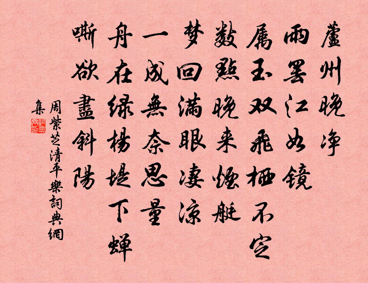 詩詞名句歷史字典書法欣賞書法字典國語詞典說文解字康熙字典古漢語字典標 題 作 者 詩 句 清平樂作者:周紫芝 朝代:宋代清平樂原文蘆州晚淨。雨罷江如鏡。屬玉雙飛棲不定。數點晚來煙艇。夢回滿眼淒涼。一成無奈思量。舟在綠楊堤下,蟬嘶欲盡斜陽。詩詞問答問:清平樂的作者是誰?答:周紫芝問:清平樂寫於哪個朝代?答:宋代問:清平樂是什麼體裁?答:詞問:周紫芝的名句有哪些?答:周紫芝名句大全周紫芝清平樂書法欣賞清平樂書法作品詩詞推薦挽李尚書母太淑人黃榦〔宋代〕紫橐光先烈,青衫拾世科。家聲今益振,母訓昔應多。方聽焚舟誓,俄聞喜缶歌。定非孫與祖,一戰一言和。菩薩蠻(回文)張孝祥〔宋代〕晚花殘雨風簾卷。捲簾風雨殘花晚。雙燕語虛窗。窗虛語燕雙。睡醒風愜意。意愜風醒睡。誰與話情詩。詩情話與送圓仁三藏歸本國棲白〔唐代〕家山臨晚日,海路信歸橈。樹滅渾無岸,風生只有潮。歲窮程未盡,天末國仍遙。已入閩王夢,香花境外邀。鼎丁謂〔宋代〕妙盡三才象,精皆九貢金。克商遷洛邑,興漢出汾陰。郜賂慚非道,秦求愧醜心。觀銘知考甫,傴僂戒何深。題也足軒黃庭堅〔宋代〕道人手種兩三竹,使君忽來唾珠玉。不須客賦千首詩,若是賞音一夔足。世人愛處但同流,一絲不掛似太俗。客來八曲鼓樓岩白玉蟾〔宋代〕萬太高岩聳石樓,雲翬煙桷瞰寒流。幔亭昔聚曾孫宴,石鼓拿歸古渡頭。次韻鄭檢法休日律詩項安世〔宋代〕一閒早已被閒魔,忙日求閒更幾何。稍向靜中觀物化,未妨聖處策勛多。官曹似方成冷,詩句如君可得過。小待州離騷九歌圖方回〔宋代〕正則靈均皇揆余,屈子文章古所無。我嘗痛飲讀□□,□乃復覽九歌圖。九歌根源何所自,羲文周孔易□□。□□題刁光胤畫冊五羊圖宋孝宗〔宋代〕霜風不動節毛塵,同沐中原水草春。蘇武還朝典屬國,一時高爵豈庸人。紀聞悼舊楊萬里〔宋代〕莫說湘南寺,令人絕痛渠。中間綠國論,偶似絕交書。衫短枯荷葉,牆高過筍輿。人生須富貴,富貴竟何如。代曲江老人百韻(年十六時作)元稹〔唐代〕何事花前泣,曾逢舊日春。先皇初在鎬,賤子正游秦。撥亂干戈後,經文禮樂辰。徽章懸象魏,貔虎畫騏驎。光武游城北李氏園池孔武仲〔宋代〕池塘春色歸,波水已極目。鳧雁稍下來,垂楊舞新綠。登臨不憚遠,枉逕入重複。已見數種花,參差隔修竹。非特送李倍秀才薛能〔唐代〕南朝才子尚途窮,畢竟應須問葉公。書劍伴身離泗上,雪風吹面立船中。家園棗熟歸圭竇,會府槐疏試射弓。相顧騎虎豐乾贊釋慧開〔宋代〕忙忙業識老豐乾,鼓舌搖唇總自瞞。從踞虎頭取虎尾,衲僧門下管窺斑。傾杯令呂渭老〔宋代〕隔座藏鉤,分曹射覆燭艷漸催三鼓。箏按教坊新譜。樓外月生春浦。徘徊爭忍忙歸去。怕明朝、無情風雨。珍花美宮詞張公庠〔宋代〕柳放金絲搭矮槐,御溝清影見樓台。落花流出宮城去,不似武陵容客來。旅懷許棠〔唐代〕終年唯旅舍,只似已無家。白髮除還出,丹霄去轉賒。夏遊窮塞路,春醉負秦花。應是穹蒼意,空教老若耶。奼鶯嬌 本名惜奴嬌 山居述懷王丹桂〔元代〕泉石清幽,好個真游地。香風散、彩雲呈瑞。日暖天和,更時有珍禽戲。嘉致。總妝點、山家況味。外景充盈,內遺建茶於惠老袁說友〔宋代〕東入吳中晚,團龍第一奩。政須香齒頰,莫慣下姜鹽。笑我便搜攪,從君辨苦甜。更煩揮妙手,銀粟看纖纖。九月西城無澗同陳道士衡上人戴表元〔宋代〕仙翁面帶江海色,釋子口融冰雪漿。同是西風未歸客,燒香煮茗作重陽。名句推薦興盡晚回舟,誤入藕花深處。李清照《如夢令·常記溪亭日暮》 野幕敞瓊筵,羌戎賀勞旋。盧綸《和張僕射塞下曲·其四》 隔水氈鄉,落日牛羊下,區脫縱橫。張孝祥《六州歌頭·長淮望斷》 擬把傷離情緒,待曉寒重說。納蘭性德《好事近·簾外五更風》 不知庭霰今朝落,疑是林花昨夜開。宋之問《苑中遇雪應制》 無我原非你,從他不解伊。曹雪芹《紅樓夢·第二十二回》 不經一事,不長一智。佚名《增廣賢文·下集》 長江巨浪征人淚,一夜西風共白頭。宋琬《江上阻風》 簌簌衣巾落棗花,村南村北響繅車,牛衣古柳賣黃瓜。蘇軾《浣溪沙·簌簌衣巾落棗花》 北風其涼,雨雪其雱。佚名《北風》