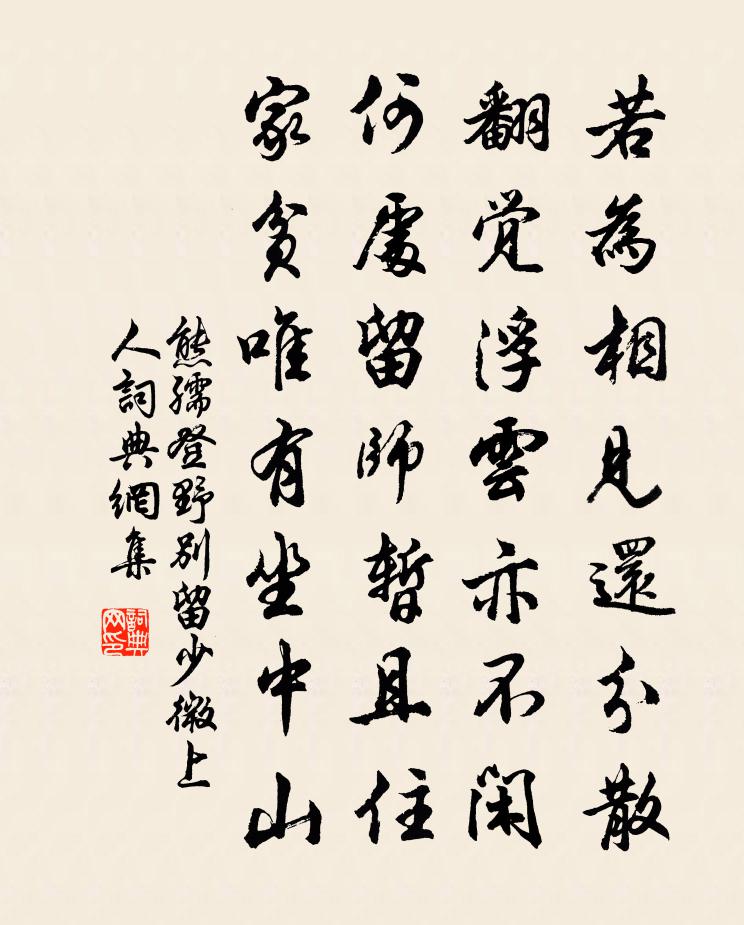 詩詞名句歷史字典書法欣賞書法字典國語詞典說文解字康熙字典古漢語字典標 題 作 者 詩 句 野別留少微上人作者:熊孺登 朝代:唐代野別留少微上人原文若為相見還分散,翻覺浮雲亦不閒。何處留師暫且住,家貧唯有坐中山。詩詞問答問:野別留少微上人的作者是誰?答:熊孺登問:野別留少微上人寫於哪個朝代?答:唐代問:野別留少微上人是什麼體裁?答:七絕熊孺登野別留少微上人書法欣賞野別留少微上人書法作品注釋全唐詩:卷476-27詩詞推薦後溪先生劉閣學挽章三首曹彥約〔宋代〕憶奉巴西燕,工歌到鹿鳴。西清多學士,南省舊門生。屬耳靈光在,驚心砥柱傾。湖莊空望眼,讀記若為情。蛺蝶趙蕃〔宋代〕不逐春風去,仍當夏日長。一雙還一隻,能白或能黃。戀戀不自已,翩翩空復狂。計功歸實用,終日愧蜂房。夜歸釋永頤〔宋代〕昨夜溪上歸,雲下扣松扉。老褐啟重鑰,瘦龐循我衣。院靜雨聲大,氣寒燈量微。叨叨聽林鳥,春歇訴無依。送吳榮楷之官浙江三首曾國藩〔清代〕讀書三十年,今來始一試。自抱輪因材,構廈隨所置。世人苦寒儉,舞袖先擇地。斤削不能遷,罌盎各自器。君子斯遠兄入城見使君郎中且謁尚書韓先生提屬李趙蕃〔宋代〕雨後乘流絕快哉,眼中無適不詩材。詩成去覓騎鯨李,銜袖探將一笑開。南鄉子晏幾道〔宋代〕小蕊受春風。日日宮花花樹中。恰向柳綿撩亂處,相逢。笑靨旁邊心字濃。歸路草茸茸。家在秦樓更近東。醒去醉野菊王建〔唐代〕晚艷出荒籬,冷香著秋水。憶向山中見,伴蛩石壁里。過疏山題一覽亭梁溪公所書也二首胡寅〔宋代〕林梢斜月墮金盆,接影蒼茫日霧翻。欲倚小欄收遁景,試憑長嘯卷遐昏。寒山濯濯空堆皺,野水瀰瀰不待源。莫道題水牯庵二首曾豐〔宋代〕三十餘年不踏泥,其如猶有角如蹄。何當紀渻重馴養,四十日間如木雞。彥禮提宮寄似黃芙蓉詩次韻奉酬二絕喻良能〔宋代〕幽圃知何處,青山東復東。芙蓉黃玉蘂,還與海榴同。宗派圖釋道沖〔宋代〕列派分宗定此圖,繩繩相貫茲聯珠。不知佛祖未興日,還有許多訊息無。送李判官赴桂州幕錢起〔唐代〕欲知儒道貴,縫掖見諸侯。且感千金諾,寧辭萬里游。雁峰侵瘴遠,桂水出雲流。坐惜離居晚,相思綠蕙秋。鴛鴦湖棹歌 之七十三朱彝尊〔清代〕招寶塘傾水淺深,會骸山古家銷沉。都緣世上錢神貴,地下劉伶改姓金。謝新恩李煜〔唐代〕櫻花落盡階前月,象床愁倚薰籠。遠似去年今日,恨還同。雙鬟不整雲憔悴,淚沾紅抹胸。何處相思苦,紗窗醉夢初秋普明寺竹林小飲餞梅聖俞分韻得亭皋木葉歐陽修〔宋代〕野水竹間清,秋山酒中綠。送子此酣歌,淮南應落木。用徐編修德夫韻其開藩旴江二首王邁〔宋代〕君侯心事即蒼冥,諤諤曾同唯唯爭。醫國奇方留後用,字民好事及今行。懸知夔卨班難繼,且入龔黃傳亦榮。天誘回建德寄馮和峰隱士王奕〔宋代〕王子歸鄒魯,知公隱德鄉。道為千載惜,身抱六經藏。青壁丹崖遠,黃花白骨香。百年交一臂,悔不拜龐床。旱後郴寇又作楊萬里〔宋代〕自憐秋蝶生不早,只與夜蛩聲共悲。眼邊未覺天地寬,身後更用文章為。去秋今夏旱相繼,淮江未淨郴江沸。餓夫句李大力〔宋代〕笛聲吹起白玉槃,正照御前楊柳碧。白水縣崔少府十九翁高齋三十韻杜甫〔唐代〕客從南縣來,浩蕩無與適。旅食白日長,況當朱炎赫。高齋坐林杪,信宿游衍闃。清晨陪躋攀,傲睨俯峭壁。崇岡名句推薦溪深古雪在,石斷寒泉流。李白《尋高鳳石門山中元丹丘》 鷹擊長空,魚翔淺底,萬類霜天競自由。 * 《沁園春·長沙》 三分春色二分愁,更一分風雨。葉清臣《賀聖朝·留別》 存科名之心者,未必有琴書之樂王永彬《圍爐夜話·第二六則》 處世不退一步處,如飛蛾投燭、羝羊觸藩,如何安樂?洪應明《菜根譚·概論》 高田如樓梯,平田如棋局。楊慎《出郊》 閉門家裡坐,禍從天上來。馮夢龍《醒世恆言·卷十六》 嘶馬搖鞭何處去?曉禽霜滿樹。牛希濟《謁金門·秋已暮》 出師未捷身先死,長使英雄淚滿襟。杜甫《蜀相》 君馬黃,我馬白。李白《君馬黃》