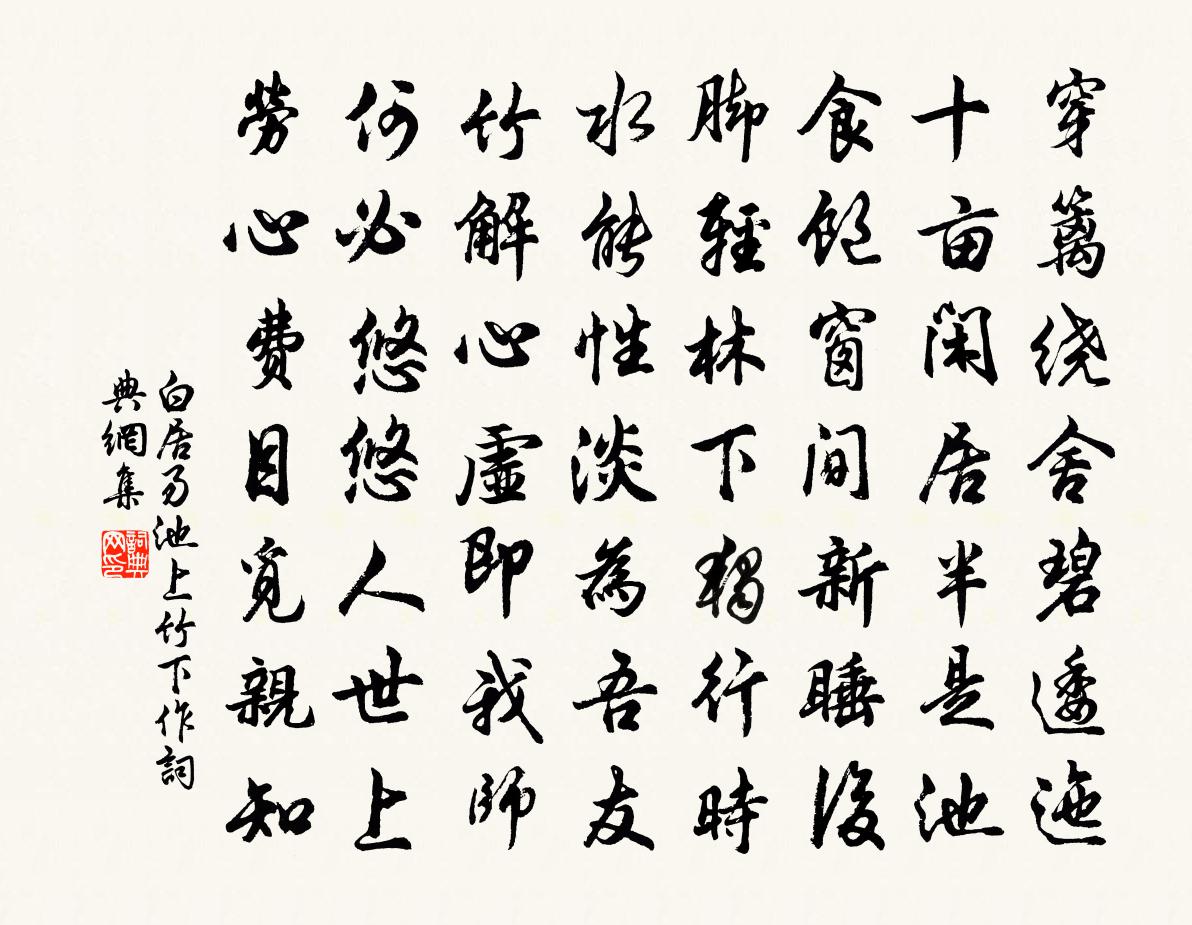 七律《池上竹下作》作於洛陽。這兩句是說,水性淡薄,它是我的好朋友,翠竹虛心,它是我的好老師。是時,詩人杭州刺史任滿,返歸洛陽,求分司東都,過淡泊寧靜的生活,這兩句詩即反映了這種心情。表達出詩人慾跳出官場是非之地,遠嫌避禍,求得自身的安全。蘊藉深沉,耐人尋味。