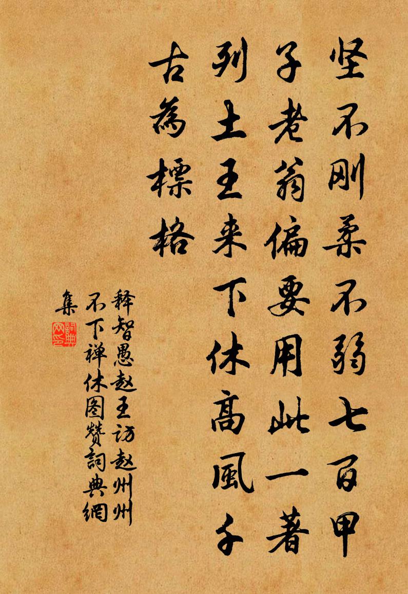 詩詞名句歷史字典書法欣賞書法字典國語詞典說文解字康熙字典古漢語字典標 題 作 者 詩 句 趙王訪趙州州不下禪休圖贊作者:釋智愚 朝代:宋代趙王訪趙州州不下禪休圖贊原文堅不剛,柔不弱。七百甲子老翁,偏要用此一著。列土王來下休,高風千古為標格。詩詞問答問:趙王訪趙州州不下禪休圖贊的作者是誰?答:釋智愚問:趙王訪趙州州不下禪休圖贊寫於哪個朝代?答:宋代釋智愚趙王訪趙州州不下禪休圖贊書法欣賞趙王訪趙州州不下禪休圖贊書法作品詩詞推薦奉和幸韋嗣立山莊侍宴應制李嶠〔唐代〕南洛琴師臣契,琴東岩王佐居。幽情遺紱冕,宸眷屬樵漁。制下峒山蹕,恩回灞水輿。松門駐旌琴,薜幄引簪裾。和顏長官百詠貧女朱繼芳〔宋代〕縴手清閒理瑟工,高樓半在碧雲中。行人豈是知音者,小立花陰待曲終。曉仙謠溫庭筠〔唐代〕玉妃喚月歸海宮,月色澹白涵春空。銀河欲轉星靨靨,碧浪疊山埋早紅。宮花有露如新淚,小苑叢叢入寒翠。綺閣霜天曉角(子慶母八十)劉子寰〔宋代〕滿前兒女。今日都歡聚。今也阿彌八十,兒也五十五。瓷甌並瓦注。山歌和社舞。但管年年強健,妝成個、西王母頌古釋慧空〔宋代〕趙州老倒一禪和,勘破台山個老婆。笑倒石門庵內客,一條濟水過新羅。驀山溪(憶古人詩云“滿城風雨近重陽”因成此詞)趙長卿〔宋代〕滿城風雨,又是重陽近。 * 媚清秋,倚東籬、商量開盡。紅萸白酒,景物一年年,人漸遠,夢還稀,贏得無窮恨絛蔣廷玉〔宋代〕八百青銅買,歸來系黑豹。松毛倒垂膝,棕綆曲圍腰。穩稱輕小帽,宜懸小藥瓢。有時吟未就,頻在手中搖。句釋曉瑩〔宋代〕誰復知予懶是真。昌年宮之作豆盧復〔唐代〕但有離宮處,君王每不居。旗門芳草合,輦路小槐疏。殿閉山煙滿,窗凝野靄虛。豐年多望幸,春色待鑾輿。簡周文顯借王有道集二首趙蕃〔宋代〕先生風節昔人似,白髮簞瓢猶嗜書。家有校書詩百首,可能乞我助三餘。郡內書懷寄劉連州竇夔州呂溫〔唐代〕朱邑何為者,桐鄉有古祠。我心常所慕,二郡老人知。傷越陸龜蒙〔唐代〕越溪自古好風煙,盜束兵纏已半年。訪戴客愁隨水遠,浣紗人泣共埃捐。臨焦賴灑王師雨,欲墮重登刺史天。早晚艷歌何嘗行曹丕〔魏晉〕何嘗快。獨無憂。但當飲醇酒。炙肥牛。長兄為二千石。中兄被貂裘。小弟雖無官爵。鞍馬{馬反}{馬反}。往千葉桃花方回〔宋代〕此亦桃花彼亦桃,成蹊各各綻春苞。一朝開出紅千葉,何啻高才十倍曹。宿王昌齡隱居常建〔唐代〕清溪深不測,隱處惟孤雲。松際露微月,清光猶為君。茅亭宿花影,藥院滋苔紋。余亦謝時去,西山鸞鶴群。成安道中懷寄馮惟逸賀鑄〔宋代〕蒼面黃須過壯時,欲投閒去兩難期。人生自是無根物,南北東西任所之。和勸農詩虞儔〔宋代〕節物常流轉,人情作異同。頗期千載後,寧忍一朝窮。隔葉饒晴哢,遊絲罥墮紅。老春何足恨,結習本來空。韓木陳知柔〔宋代〕康成跡寄書帶草,玄德祥標羽葆桑。名與此山俱不朽,何如煙杪郁蒼蒼。送元厚之資政致仕歸蘇州曾鞏〔宋代〕笑指家園是五湖,畫船東下載圖書。收功玉鉉丹青後,得老銅樓羽翼初。醒醉放懷從野服,登臨乘興屬安車。都門別關景暉二首二晁補之〔宋代〕筆陳雲橫未易陪,雁門端見壓城摧。櫟中麋出君搏飯,地上蛇成我奪杯。好在田園心事懶,罷休簪組鬢毛催。稽山名句推薦聽元宵,今歲嗟呀,愁也千家,怨也千家。王磐《古蟾宮·元宵》 江畔何人初見月?江月何年初照人?張若虛《春江花月夜》 看蓬門秋草,年年破巷,疏窗細雨,夜夜孤燈。鄭燮《沁園春·恨》 兵久則力屈,人悉則變生。范曄《後漢書·列傳·桓譚馮衍列傳上》 深夜無風新雨歇,涼月,露迎珠顆入圓荷。閻選《定風波·江水沉沉帆影過》 中山孺子倚新妝,鄭女燕姬獨擅場。李夢陽《汴京元夕》 綠竹含新粉,紅蓮落故衣。王維《山居即事》 春還草閣梅先動,月滿虛庭雪未消。王守仁《元夕二首》 天山雪後海風寒,橫笛偏吹行路難。李益《從軍北征》 苦心中常得悅心之趣;得意時便一失意之悲。洪應明《菜根譚·概論》
