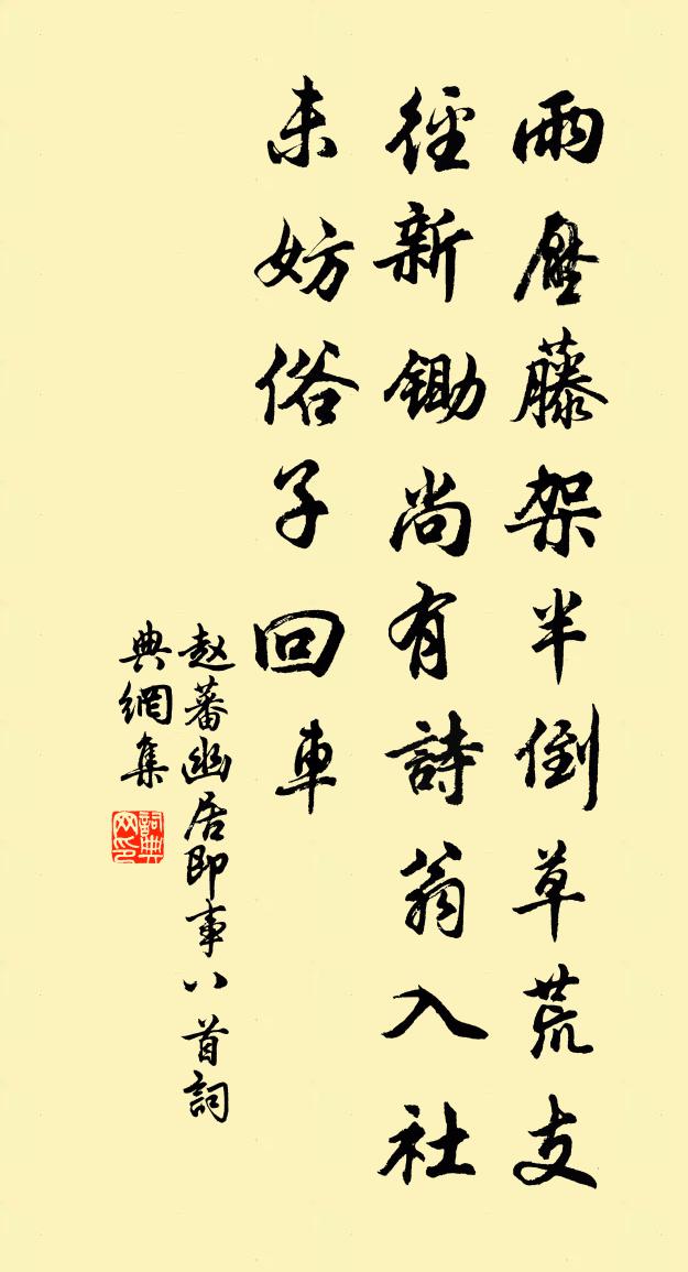 詩詞名句歷史字典書法欣賞書法字典國語詞典說文解字康熙字典古漢語字典標 題 作 者 詩 句 幽居即事八首作者:趙蕃 朝代:宋代幽居即事八首原文雨壓藤架半倒,草荒支徑新鋤。尚有詩翁入社,未妨俗子回車。詩詞問答問:幽居即事八首的作者是誰?答:趙蕃問:幽居即事八首寫於哪個朝代?答:宋代趙蕃幽居即事八首書法欣賞幽居即事八首書法作品詩詞推薦四月二十二日別江州謝送者方回〔宋代〕出城煩送客,童稚亦相隨。貌比初來老,行因共語遲。橋邊分手後,馬上轉頭時。欲識陽關曲,唯須誦此詩。雨中望靈山呈明遠韓元吉〔宋代〕騎曹公事日紛紛,荀令香爐欲罷薰。冷雨定知還作雪,好山無奈只藏雲。看花便沉名何用,勸酒誰能耳不聞。歲晚五月九日甲子至月望庚午大雨水不已十首方回〔宋代〕平地驚胥怒,滔天類鯀湮。稍低三板水,不活百城人。已拼過從絕,徒工徒倚頻。鵠形無白粲,蜂起有黃巾。題棺木朱貞白〔宋代〕久久終須要,而今未要君。有時閒憶著,大是要知聞。緣識宋太宗〔宋代〕善事多兮惡事少,君子能言兮心自了。杳杳冥冥幻之中,舉目因緣還大小。勿縱貪,勿縱巧,知有寒人飢是飽。良安厚卿樞密母夫人輓詞二首蘇轍〔宋代〕家起側微中,身兼富貴終。慈仁本宜壽,勤約自成風。大府寧居久,名邦賜沐雄。共傳生子福,仍指讀書功。早歲歲寒亭梅堯臣〔宋代〕種花邀青春,種柏要晏歲。乃知風露前,已辨雪霜勢。時俗愛芳菲,不妨鳴鶗{左圭右鳥}。他年都門歸,寧昧始吳尉東閣西亭劉過〔宋代〕襲桂行香徑,朱欄稍轉西。水風颼石冷,雲月墮檐低。棋敗深杯罰,詩豪健筆題。舞忙釵鬢亂,更為捧柔荑。司命宮楊道士息軒蘇軾〔宋代〕無事席此靜坐,席一日似兩席日。若活席七十年,便是百四十。黃金幾時成,白髮日夜出。開眼三千秋,速如駒過嵩山尋馮鍊師不遇崔曙〔唐代〕青溪訪道凌煙曙,王子仙成已飛去。更值空山雷雨時,雲林薄暮歸何處。第一百五十六卷感懷(一作陸沈詩,題作上禮部楊侍郎)張繼〔唐代〕調與時人背,心將靜者論。終年帝城裡,不識五侯門。清心鏡 薄待詔求問馬鈺〔元代〕薄待詔,能捏塑。夸妙手奇功,不曾停住。騁精神、漉水拖泥,為養家之故。心還省,性還悟。閒閒供養,本真父秋深(一作塞上行)周朴〔唐代〕柳色尚沈沈,風吹秋更深。山河空遠道,鄉國自鳴砧。巷有千家月,人無萬里心。長城哭崩後,寂絕至如今。句黃卓〔宋代〕浪卷雙溪神物化,煙橫三岸電光飛。留黃思忠李流謙〔宋代〕可人面如君不易面致,惠然面而來此天面意。往往文字雜嘯歌,兒輩倚牆吾敢訶。向來邂逅無此款,曲水風流嗟未三月二十五夜達旦不能寐陸游〔宋代〕憂國心常折,觀書眼欲枯。百年終坎壈,一飯且枝梧。忽忽殘春過,迢迢清夜徂。壯心空萬里,老病要人扶。霜降前四日頗寒陸游〔宋代〕草木初黃落,風雲屢闔開。兒童鋤麥罷,鄰里賽神回。鷹擊喜霜近,鸛鳴知雨來。盛衰君勿嘆,已有復燃灰。王風·揚之水佚名〔先秦〕揚之水,不流束薪。彼其之子,不與我戍申。懷哉懷哉,曷月予還歸哉?揚之水,不流束楚。彼其之子,不與我戍松滋渡望峽中劉禹錫〔唐代〕渡頭輕雨灑寒梅,雲際溶溶雪水來。夢渚草長迷楚望,夷陵土黑有秦灰。巴人淚應猿聲落,蜀客船從鳥道回。十二清平樂吳則禮〔宋代〕雪余寒退。惟有青松在。春不加榮寒不悴。用舍如公都耐。流肪磊落龜蛇。會留紅日西斜。欲助我公壽骨,蟠桃等名句推薦松月生夜涼,風泉滿清聽。孟浩然《宿業師山房期丁大不至 / 宿業師山房待丁大不至》 會天大雨,道不通,度已失期司馬遷《陳涉世家》 勝敗兵家事不期,包羞忍恥是男兒。杜牧《題烏江亭》 洊雷,震;君子以恐懼修省。佚名《易傳·象傳下·震》 故音樂者,所以動盪血脈,通流精神而和正心也。司馬遷《史記·樂書》 芄蘭之葉,童子佩韘。佚名《芄蘭》 無論作何等人,總不可有勢利氣王永彬《圍爐夜話·第三五則》 君在陰兮影不見,君依光兮妾所願。傅玄《車遙遙篇》 自憐人憐,自棄人棄。心無滯礙,害不侵矣。來俊臣《羅織經·保身卷第七》 道傍榆莢仍似錢,摘來沽酒君肯否。岑參《戲問花門酒家翁》