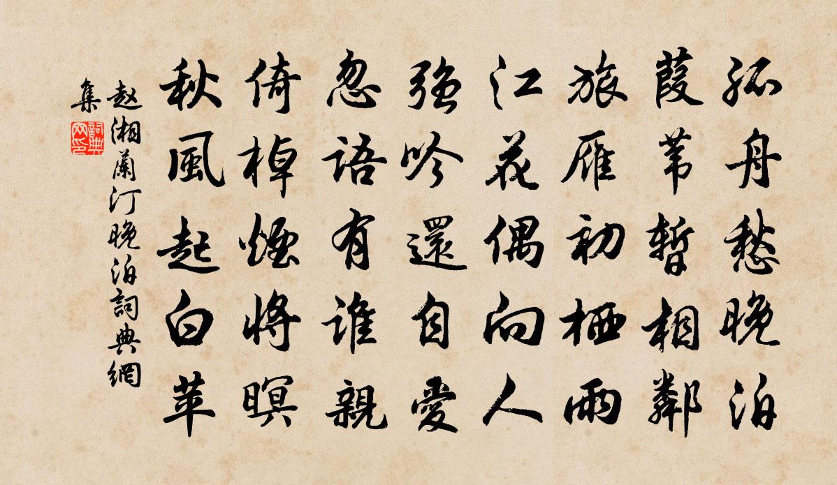 詩詞名句歷史字典書法欣賞書法字典國語詞典說文解字康熙字典古漢語字典標 題 作 者 詩 句 蘭汀晚泊作者:趙湘 朝代:唐代蘭汀晚泊原文孤舟愁晚泊,葭葦暫相鄰。旅雁初棲雨,江花偶向人。強吟還自愛,忽語有誰親。倚棹煙將暝,秋風起白苹。詩詞問答問:蘭汀晚泊的作者是誰?答:趙湘問:蘭汀晚泊寫於哪個朝代?答:唐代趙湘蘭汀晚泊書法欣賞蘭汀晚泊書法作品詩詞推薦林夫人輓詞范成大〔宋代〕翰墨門闌正巋然,故應婉娩亦儒先。與聞古學三千禮,能誦家書四百篇。卜協媯姜占永世,夢呼辰已讖凋年。班姬九日即事鄭清之〔宋代〕安晚閒身晚更安,蛩宵無夢落金鞍。通心白髮難為染,對面青編盡耐看。多謝紫萸占老健,喜招 * 伴秋寒。江城為證無得賦竹山陳郁〔宋代〕好山雖可愛,懶入翠重重。靜睦千竿玉,清如五老峰。徑陰禪履潤,林密佛香濃。靈運知師意,無勞屐蹤基。呂與叔挽章四首秦觀〔宋代〕數日音容隔,人琴遂已虛。門生應有謚,國史可無書。舊室懸蛛網,遺編走蠹魚。定無封禪草,平日笑相如。陳將軍哀詞周文璞〔宋代〕扞環城兮保赤子,歸王所兮執弓矢。雖有妻子兮不如兄弟,嗟全家兮南向而死。護行殿兮臥旗鼓,統伍符兮莫余侮阮郎歸曹勛〔宋代〕誰將春信到長安。江南臘向殘。玉妃何事在人間。冰肌瑩素顏。新月上,怯輕寒。香心破紫檀。數枝斜傍小亭閒。蘇秀道中大雨曾幾〔宋代〕梅雨又時雨,蘇州仍秀州。客行無六月,農事有三秋。雲氣深鴻雁,煙波沒白鷗。衰年慚愧汝,物役幾時休。賀新郎(次韻戴時芳)陳著〔宋代〕北馬飛江過。畫圖中、花城柳郭,萬摧千挫。羌管直驚猿鶴夢,愁得千山翠鎖。有多少、風餐雨臥。回首西湖空濺仲微相過把酒有感宋祁〔宋代〕故人當止酒,今夕喜銜盃。事與朱顏改,年將素領來。鹿車君偃蹇,鶴祿我裴回。紬史餘三擿,為郎愧一台。洛吟滴滴金楊無咎〔宋代〕相逢未盡論心素。早容易、背人去。憶得歌翻斷腸句。更惺惺言語。萋萋芳草迷南浦。正風吹、打船雨。靜聽愁聲雜劇·包待制智斬魯齋郎關漢卿〔元代〕楔子(沖末扮魯齋郎引張龍上,詩云)花花太歲為第一,浪子喪門再沒雙。街市小民聞吾怕,則我是權豪勢要魯齋蔬圃絕句陸游〔宋代〕百錢薪買綠蓑衣,不羨黃金帶十圍。枯柳坡頭風雨急,憑誰畫我荷鉏歸?水調歌頭劉之翰〔宋代〕涼露洗金井,一葉下梧桐。謫仙浪遊,何事華發作詩翁。烏帽蕭蕭一幅,坐對清泉白石,矯首撫長松。獨鶴歸來晚聞沈元用帥南海喜而有作張九成〔宋代〕與公相別五經年,憂患流離理固然。悵望故園江渚外,還驚橫浦瘴煙邊。喜聞金節專南海,行看鋒車上九天。顧我嵩陽書院詩李廌〔宋代〕束髮從政事,佩緩曳長裾。守令有民社,裂地皆分符。問之爾何由,必曰因業儒。自致或世賞,因儒升仕塗。一朝書事十首劉克莊〔宋代〕戰鼙非起自漁陽,到冠皆由偃月堂。相國裘雖來賀捷,蚩尤旗尚收亡芒。廚車古有刑都市,寶劍今誰請尚方。莫倚詠永州陳孚〔元代〕燒痕慘澹帶昏鴉,數盡寒梅未見花。回雁峰南三百里,《捕蛇說》里數千家。澄江繞郭聞漁唱,怪石堆庭見吏衙。芙蓉橋梁介〔宋代〕法{左氵右劇}瘴癘鄉,六月旱爍石。榆柳秋不枯,蛇虺冬不蟄。長橋坐清虛,足以度朝夕。汲井埋深盆,芙蕖間元和甲午歲詔書盡征江湘逐客余自武陵赴京宿於…諸君子劉禹錫〔唐代〕雷雨江山起臥龍,武陵樵客躡仙蹤。十年楚水楓林下,今夜初聞長樂鍾。句王安石〔宋代〕乞米助(疒加辛)鎦。名句推薦盡無言、閒品秦箏,淚滿參差雁呂渭老《薄倖·青樓春晚》 洞庭青草,近中秋,更無一點風色。張孝祥《念奴嬌·過洞庭》 與人善言,暖於布帛;傷人之言,深於矛戟。荀子《荀子·榮辱》 荒煙涼雨助人悲,淚染衣襟不自知。王安石《送和甫至龍安微雨》 失之東隅,收之桑榆。范曄《後漢書·列傳·馮岑賈列傳》 宜有詞仙,擁素雲黃鶴,與君遊戲。姜夔《翠樓吟·淳熙丙午冬》 酌酒與君君自寬,人情翻覆似波瀾。王維《酌酒與裴迪》 讀書不覺已春深,一寸光陰一寸金。王貞白《白鹿洞二首·其一》 何須急管吹雲暝,高寒灩灩開金餅。高觀國《菩薩蠻·何須急管吹雲暝》 莫遣只輪歸海窟,仍留一箭射天山。李益《塞下曲》