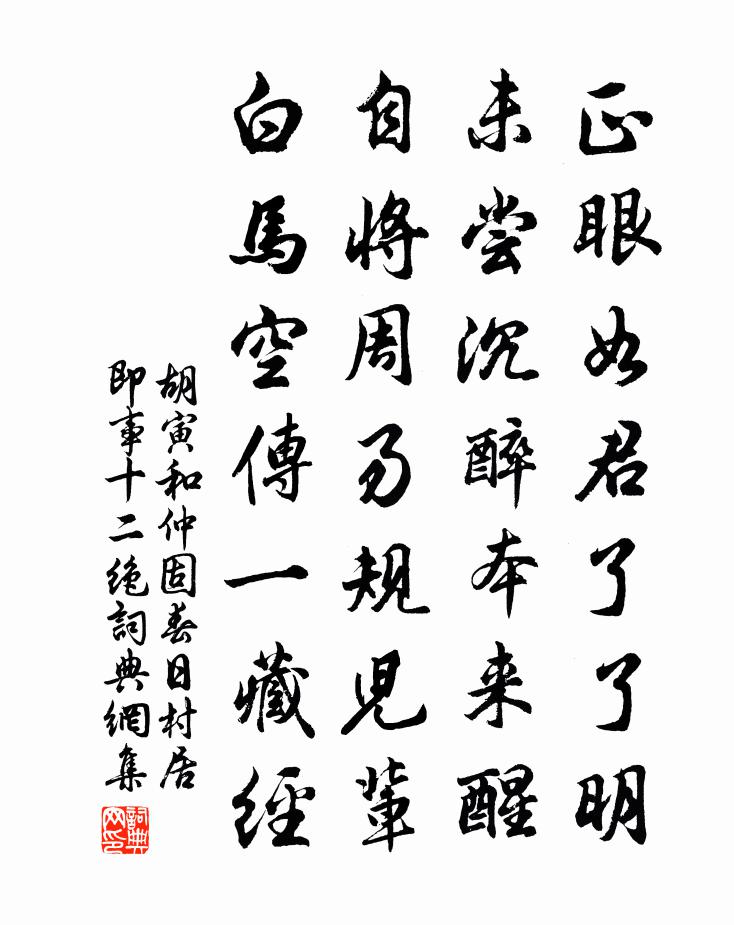 詩詞名句歷史字典書法欣賞書法字典國語詞典說文解字康熙字典古漢語字典標 題 作 者 詩 句 和仲固春日村居即事十二絕作者:胡寅 朝代:宋代和仲固春日村居即事十二絕原文正眼如君了了明,未嘗沉醉本來醒。自將周易規兒輩,白馬空傳一藏經。詩詞問答問:和仲固春日村居即事十二絕的作者是誰?答:胡寅問:和仲固春日村居即事十二絕寫於哪個朝代?答:宋代胡寅和仲固春日村居即事十二絕書法欣賞和仲固春日村居即事十二絕書法作品詩詞推薦幔卷綢/慢卷綢李甲〔宋代〕絕羽沈鱗,埋花葬玉,杳杳悲前事。對一盞寒燈,數點流螢,悄悄畫屏,巫山十二。蕣臉星眸,蕙情蘭性,一旦成魚籪金嘉謨〔宋代〕芒葦織簾箔,橫當湖水秋。寄言魚興蟹,機穽在中流。菩薩蠻(管邦惠家小鬟善謳)李彌遜〔宋代〕小山嬌翠低歌扇。雛鶯學語春猶淺。無力響方檀。聲隨玉筍翻。垂鬟雲乍染。媚靨香微點。未解作輕顰。凝情已動靜照堂王安石〔宋代〕任公蹲會稽,海上得招提。淨觀堂新構,幽尋客屢攜。飛檐出風雨,灑翰落虹蜺。投老黃塵陌,東看路恐迷。寄寇荊山陳師道〔宋代〕曠士三年別,荊山一顧中。百千人慾死,四六老能工。脫帽頭應白,求田意欲東。口須論世事,目已失飛鴻。江上阻風宋祁〔宋代〕百尺危檣倚曙空,古祠簫鼓隔丹楓。誰將一隻仙人箭,換作樵溪旦暮風。頌古三十一首釋如本〔宋代〕似錦桃花滿樹紅,靈雲一見便心空。當時不遇玄沙老,爭得名喧宇宙中。偶成陳棣〔宋代〕直面溪山照眼明,息肩簿領暫身輕。蝸巢得失直餘事,燕羽差池已半生。老境到門顏有甲,愁城堅壁酒無兵。何時再用前韻李彌遜〔宋代〕薄宦驅人不亦勞,久紆章服礙爬搔。何時歸臥鐘山石,荷插長隨手種桃。鷓鴣天(元夕不出)姜夔〔宋代〕憶昨天街預賞時。柳慳梅小未教知。而今正是歡游夕,卻怕春寒自掩扉。簾寂寂,月低低。舊情惟有絳都詞。芙蓉偈頌六十七首釋原妙〔宋代〕一夏九十日,看看又將半。面門無位人,急著眼睛看。冷地驀相逢,腳跟紅線斷。掌內握乾坤,翻身游碧漢。堪笑寄太和舊遊趙蕃〔宋代〕李暗桃春未是晚,可憐孤負海棠天。故應陶寫皆詩內,安得淋漓到酒邊。已辦經營求散吏,便思瀟瀟泛江船。相思心泉二首蒲壽宬〔宋代〕涓涓萬古意,湛湛一塵無。明月來窺鏡,宵寒露滴珠。次如心侄古意韻陳著〔宋代〕妻孥恩愛深,生死同一窗。胡然成別離,使汝悲涕雙。人世能幾何,明滅風鐙幢。有家尚堪活,奚豈□他鄉。安得金陵雜興二百首蘇泂〔宋代〕曲曲青溪貫大江,鴛鴦鸂鶒一雙雙。元戎開燕時來此,城郭山林意兩忘。過永州道間李曾伯〔宋代〕雨欠農憂燥,風多客苦埃。猶寒鶯未出,將社燕還來。桃放紅凝臉,梅飄粉褪腮。春山如舊識,一笑病顏開。宮詞王仲修〔宋代〕春風來自斗杓東,萬物欣欣鼓舞中。鳳紙催裁寬大詔,拂明宣下未央宮。挽李縣丞陳宓〔宋代〕文脈紹雲龕,儒酸味轉甘。一官人謂晚,三邑政無慚。身健歸何早,孤賢道飽參。淵明生自祭,揮淚聽佳談。閒居作貫休〔唐代〕閒門微雪下,慵惰計全成。默坐便終日,孤峰只此清。身心閒少夢,杉竹冷多聲。唯有西峰叟,相逢眼最明。挽都務弟衛宗武〔宋代〕功名剩擬著先鞭,永訣於今十九年。地下那知多歲月,人間別是一乾坤。生前桂籍身如在,死後芸編子並傳。已巳名句推薦長風蕭蕭渡水來,歸雁連連映天沒。盧思道《從軍行》 畫閣朱樓盡相望,紅桃綠柳垂檐向。王維《洛陽女兒行》 石門流水遍桃花,我亦曾到秦人家。李白《下途歸石門舊居》 善謀生者,但令長幼內外,勤修恆業,而不必富其家王永彬《圍爐夜話·第九則》 露從今夜白,月是故鄉明。杜甫《月夜憶舍弟》 秋光一片,問蒼蒼桂影,其中何物?趙秉文《大江東去·用東坡先生韻》 輕陰池館水平橋,一番弄雨花梢。陳子龍《畫堂春·雨中杏花》 三過平山堂下,半生彈指聲中。蘇軾《西江月·平山堂》 樓角初銷一縷霞,淡黃楊柳暗棲鴉賀鑄《減字浣溪沙·樓角初銷一縷霞》 夫知人之性,莫難察焉。諸葛亮《將苑·卷一·知人性》