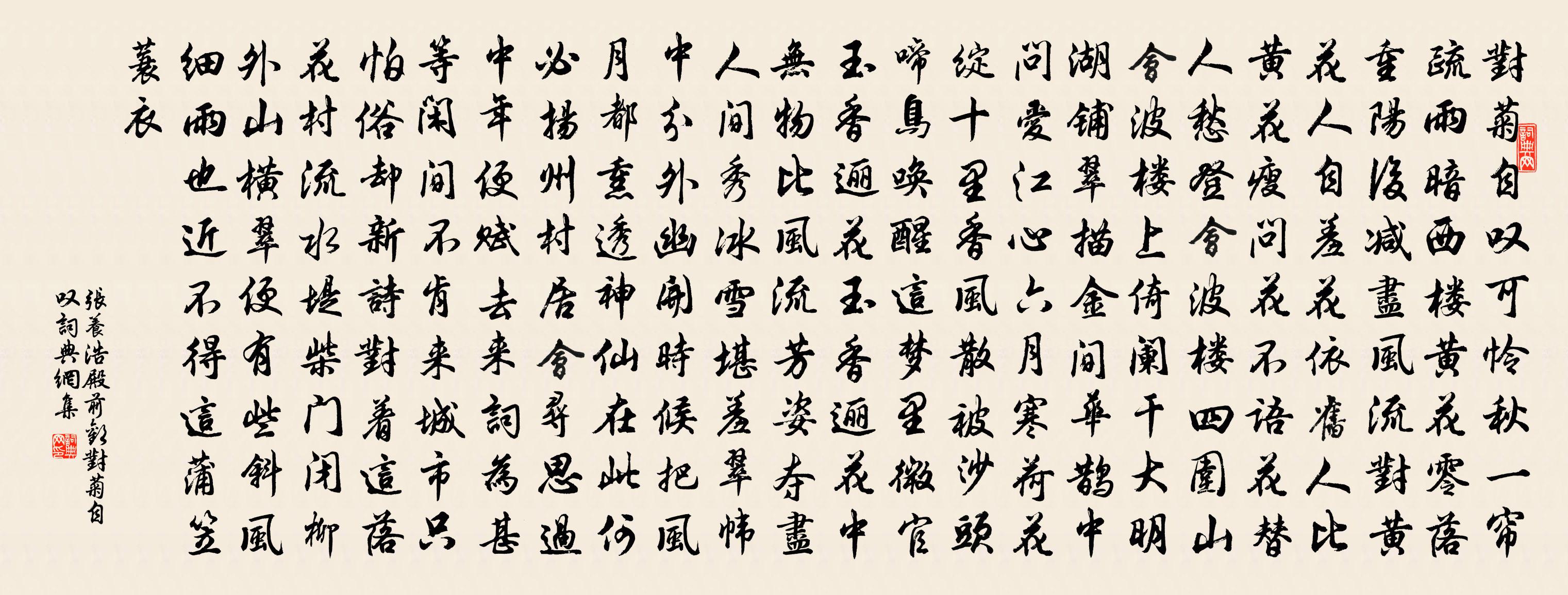 可憐秋,一簾疏雨暗西樓。黃花零落重陽後,減盡風流。對黃花人自羞,花依舊,人比黃花瘦。問花不語,花替人愁。