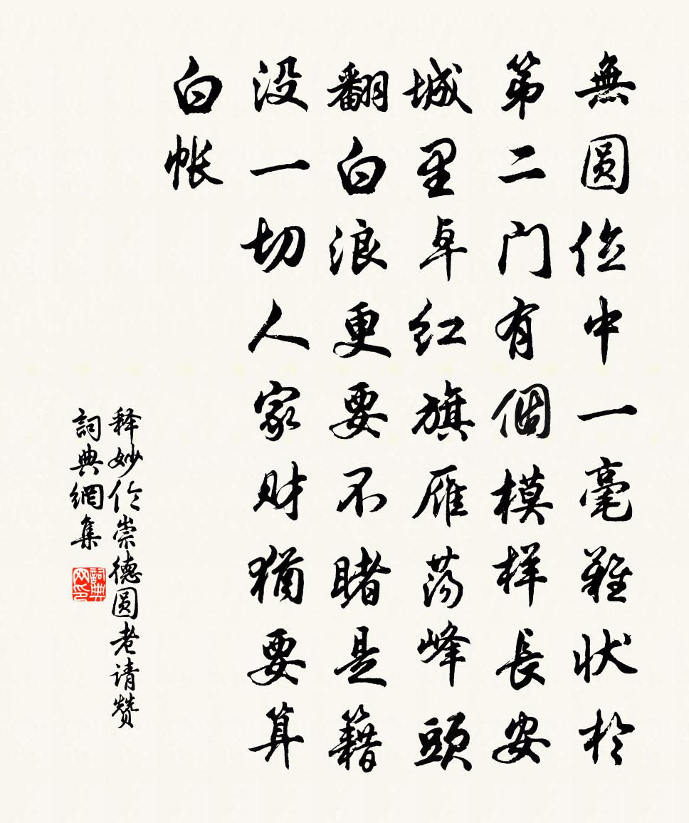 詩詞名句歷史字典書法欣賞書法字典國語詞典說文解字康熙字典古漢語字典標 題 作 者 詩 句 崇德圓老請贊作者:釋妙倫 朝代:宋代崇德圓老請贊原文無圓位中,一毫難狀。於第二門,有個模樣。長安城裡卓紅旗,雁盪峰頭翻白浪。更要不睹是籍沒一切人家財,猶要算白帳。詩詞問答問:崇德圓老請贊的作者是誰?答:釋妙倫問:崇德圓老請贊寫於哪個朝代?答:宋代釋妙倫崇德圓老請贊書法欣賞崇德圓老請贊書法作品詩詞推薦頌古釋道顏〔宋代〕嘍羅須要逞聰明,金榜何曾得掛名。捋下幞頭歸去也,莫騎驢子傍人門。聲聲慢侯善淵〔元代〕元初一性,甚處安排。虛無恍惚中來。受*成形,父精母血凝胚。迤邐胎完降誕,未成能、長大情乖。自作壞,向擊壤吟邵雍〔宋代〕擊壤三千首,行窩二十家。樂天為事業,養志是生涯。出入將如意,過從用小車。人能知此樂,何必待紛華。病癒小健戲作陸游〔宋代〕路入江村跨蹇驢,鞍前分掛兩囊書。興來到處沽新酒,不為閒愁要破除。題龍眠畫騎射拖毬戲樓鑰〔宋代〕綠楊幾枝插平沙,柔梢裊裊隨風斜。紅綃去地不及尺,錦袍壯士斫鬃射。橫磨箭鋒滿分靶,一箭正截紅綃下。前騎春深脫衣李商隱〔唐代〕睥睨江鴉集,堂皇海燕過。減衣憐蕙若,展帳動煙波。日烈憂花甚,風長奈柳何。陳遵容易學,身世醉時多。唐文權郡見前作和韻見教乃賦計三首答之程公許〔宋代〕魯國久仙去,詩偕芙蓉秋。淵淵韻金石,往往余岩丘。象賢來題輿,同聲應鳴璆。清渭發源遠,濁涇難混流。回心院蕭觀音〔遼代〕剔銀燈,須知一樣明。偏是君來生彩暈,對妾故作青熒熒。剔銀燈,待君行。送友人棄官游江左賈島〔唐代〕羨君休作尉,萬事且全身。寰海多虞日,江湖獨往人。姓名何處變,鷗鳥幾時親。別後吳中使,應須訪子真。聞夜砧白居易〔唐代〕誰家思婦秋搗帛?月苦風淒砧杵悲。八月九日正長夜,千聲萬聲無了時。應到天明頭盡白,一聲添得一莖絲。太平吟邵雍〔宋代〕身老太平間,身閒心更閒。非貴亦非賤,不飢兼不寒。有賓須置酒,無日不開顏。第一條平路,何人伴往還。次韻杜安行嘉陵春日書事十首郭印〔宋代〕聖處沉潛久,心華始發明。絕知人事繆,頓覺世緣輕。俗薄天難定,時危道不行。折腰甘五斗,無意問弓旌。換巢鸞鳳朱彝尊〔清代〕桐扣亭前。記春花落盡,才返吟鞭。鴨頭凝練浦,鵝眼屑榆錢。蘭期空約月初弦。待來不來,紅橋小船。蓬山近,靈鑒院陳郊〔宋代〕門外輪蹄去不休,誰人識向靜中游。區區名利成韁鎖,不道少年能白頭。偈頌二十五首釋普岩〔宋代〕馬頭回,牛頭沒。一字入以門,九牛曳不出。已亥雜詩 209龔自珍〔清代〕空山徙倚倦遊身,夢見城西閬苑春。一騎傳箋朱邸晚,臨風遞與縞衣人。過上湖嶺,望招賢江南北山四首楊萬里〔宋代〕一水橫拖兩岸峰,千痕萬摺碧重重。誰言老子經行處,身在江山障子中。即事王珪〔唐代〕雲日散朝陰,清江更一臨。北堂無劃積,南浦有波深。春意饒芳樹,晴光動翠岑。自慚機亦淺,勞起海鷗心。步西湖次韻徐南卿陳造〔宋代〕楊園騫絕嶺,萬象赴窺臨。坐久嵐霏潤,來時翠碧深。鶯花自佳處,魚鼓亦叢林。誰在飛埃外,芸芸付陸沈。賢者之孝二百四十首白華孝子林同〔宋代〕廉恥有微缺,須知孝未純。白華何所似,所似皎然身。名句推薦西風惡。數聲新雁,數聲殘角。黃機《憶秦娥·秋蕭索》 楊柳青青著地垂,楊花漫漫攪天飛。佚名《送別詩》 羅袂從風輕舉,愁殺採蓮女!毛文錫《應天長·平江波暖鴛鴦語》 不見又思量,見了還依舊。李之儀《謝池春·殘寒銷盡》 自古逢秋悲寂寥,我言秋日勝春朝。劉禹錫《秋詞》 田家占氣候,共說此年豐。孟浩然《田家元日》 占得杏梁安穩處,體輕唯有主人憐,堪羨好因緣。牛嶠《憶江南·銜泥燕》 臨官莫如平,臨財莫如廉。劉向《說苑·政理》 難相見,易相別,又是玉樓花似雪。韋莊《應天長·別來半歲音書絕》 清明又近也,卻天涯為客。曹組《憶少年·年時酒伴》