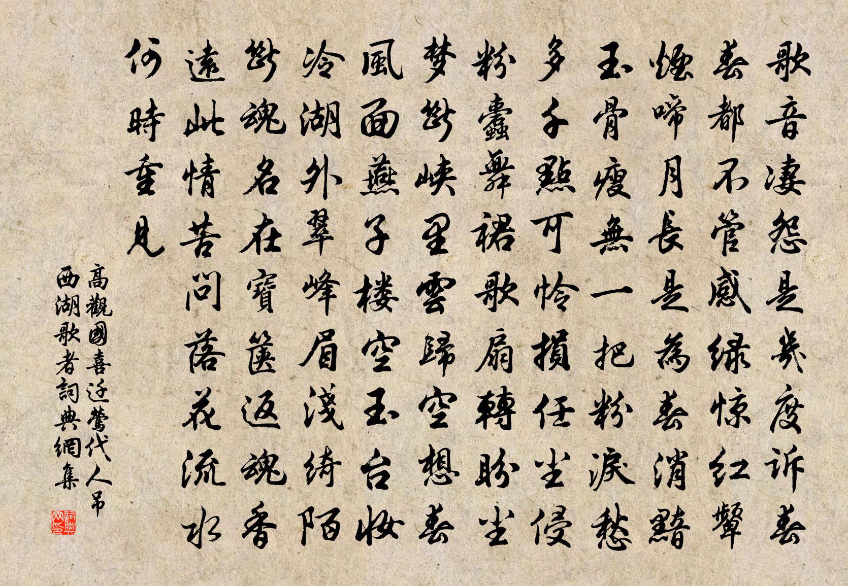 歌音悽怨。是幾度訴春,春都不管。感綠驚紅,顰煙啼月,長是為春消黯。玉骨瘦無一把,粉淚愁多千點。可憐損,任塵侵粉蠹,舞裙歌扇。