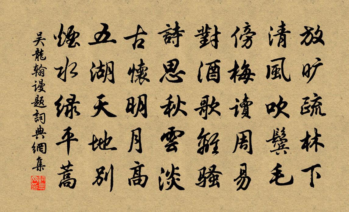 詩詞名句歷史字典書法欣賞書法字典國語詞典說文解字康熙字典古漢語字典標 題 作 者 詩 句 謾題作者:吳龍翰 朝代:宋代謾題原文放曠疏林下,清風吹鬢毛。傍梅讀周易,對酒歌離騷。詩思秋雲淡,古懷明月高。五湖天地別,煙水綠平蒿。詩詞問答問:謾題的作者是誰?答:吳龍翰問:謾題寫於哪個朝代?答:宋代吳龍翰謾題書法欣賞謾題書法作品詩詞推薦晝寢白居易〔唐代〕坐整白單衣,起穿黃草屨。朝餐盥漱畢,徐下階前步。暑風微變候,晝刻漸加數。院靜地陰陰,鳥鳴新葉樹。獨行趙侍郎看紅白牡丹因寄楊狀頭贊圖殷文圭〔唐代〕遲開都為讓群芳,貴地栽成對玉堂。紅艷裊煙疑欲語,素華映月只聞香。剪裁偏得東風意,淡薄似矜西子妝。雅稱題吉州承天院清涼軒黃庭堅〔宋代〕菩薩清涼月,游於畢竟空。我觀諸境盡,心與古人同。僧發侵眉白,桃花映竹紅。儻來尋祖意,展手似家風。古意二首蔡沈〔宋代〕種木必培根,清流必澄源。根源得其理,流末乃可言。聖賢本始務,條達蓋自然。時俗枝委求,持操空爾煩。存存雨霖鈴王安石〔宋代〕孜孜矻矻。向無明里、強作窠窟。浮名浮利何濟,堪留戀處,輪迴倉猝。幸有明空妙覺,可彈指超出。緣底事、拋題王堯章佇香亭樂雷發〔宋代〕故園荷屋傍濂溪,苦愛蓮花入夢思。今日題詩還自笑,江湖塵土鬢成絲。紅情(疏影、暗香,姜白石為梅著語,因易之曰紅情、綠意以荷花荷葉詠之)張炎〔宋代〕無邊香色。記涉江自采,錦機雲密。翦翦紅衣,學舞波心舊曾識。一見依然似語,流水遠、幾回空憶。看□□、倒次韻答潘監稅勉其小忍項安世〔宋代〕舊目潘懷縣,長憐簿官卑。清秋一搖落,綠鬢兩衰遲。今代諸孫在,遺風百世知。四聲喔激烈,九折訴嵌{嵌甘換西江月(再作)洪适〔宋代〕席上酒杯難減,鼎中藥味頻加。老人爭得臉如霞。鏡里衰容人怕。檐溜盡成冰柱,前村變卻梅花。瓊瑤破碎為行車偈頌八十七首釋慧開〔宋代〕爛柴頭,火一團。急著眼,莫顢頇,星在枰兮不在盤。偈頌一百三十六首釋惟一〔宋代〕自夏及秋,頻頻出入。送舊迎新,賓士不歇。十字街頭忽吃攧。起來拾得胡餅只。今日不辭舉似諸人,團團圓圓,和葉尚書解印二首劉克莊〔宋代〕倦入承明聽履聲,朱轓今復厭專城。湯胸太華供吟興,照眼伊川洗宦情。蓴鱠何慚高士決,琴龜不減昔賢清。未應示蔡天啟三首王安石〔宋代〕蔡子勇成癖,能騎生馬駒。銛鋒瑩鷿鵜,價重百硨磲。脫身事幽討,禪愈只晏如。劃然變軒昂,慎勿學哥舒。謝人送常州草蟲扇楊萬里〔宋代〕生怕炎天老又逢,草蟲扇子獻奇功。還將多稼亭前月,卷盡西湖柳上風。蚱蜢翅輕塗翡翠,蜻蜓腰細滴猩紅。舊時先天易吟三十首方回〔宋代〕不識第一畫,羲皇運腕初。憑空說儀象,枉著汗牛書。又題月台王炎〔宋代〕天心湖面月團圓,中著胡床坐廣寒。玉鑒照空無盡境,冰輪碾水不生瀾。搗成兔藥人難老,舞徹霓裳夜未闌。願躡壽曹大博以東憲台治新築亭館扁榜寄意垂光程公許〔宋代〕蔚藍玻璃水中天,玻璃岧嶢千萬玻璃重。樓觀聳煙霞,光景浮星虹。天上老仙伯,萬劫冰雪容。笑下金華山,長歌中山公鎮淝上宋祁〔宋代〕長鬣生氂滿帳前,甘棠載憩示優賢。簜函握節中軍府,奎字成鉤寶閣天。丹匕去尋鴻苑錄,佛花來供淨名禪。朝家偈頌一百二十三首釋祖欽〔宋代〕九龍吐水,七步周行。雲門一棒打殺,正是摩頂授記。葛藤枝蔓重生,從教遍地縱橫。開府李公挽章秦觀〔宋代〕報國封章數,論交意氣真。先朝貴公子,當代老成人。月動融尊酒,花催鄭驛賓。誰知古原上,馬鬣一朝新。戚里名句推薦微雨靄芳原,春鳩鳴何處。韋應物《東郊》 片帆西去,一聲誰噴霜竹。辛棄疾《念奴嬌·登建康賞心亭呈史致道留守》 夫賞者,所以喜眾,令士忘死也。罰者,所以正亂,令民畏上也。孫臏《孫臏兵法·威王問》 山桃紅花滿上頭,蜀江春水拍山流。劉禹錫《竹枝詞·山桃紅花滿上頭》 布衣之怒,亦免冠徒跣,以頭搶地爾。劉向《戰國策·魏四·秦王使人謂安陵君》 唯器與名,不可以假人左丘明《左傳·成公·成公二年》 雪霏霏,風凜凜,玉郎何處狂飲?魏承班《滿宮花·雪霏霏》 寫不了相思,又蘸涼波飛去。朱彝尊《長亭怨慢·雁》 父老得書知我在,小軒臨水為君開。蘇軾《送賈訥倅眉》 今日不為,明日忘貨。昔之日已往而不來矣。管仲《管子·乘馬》