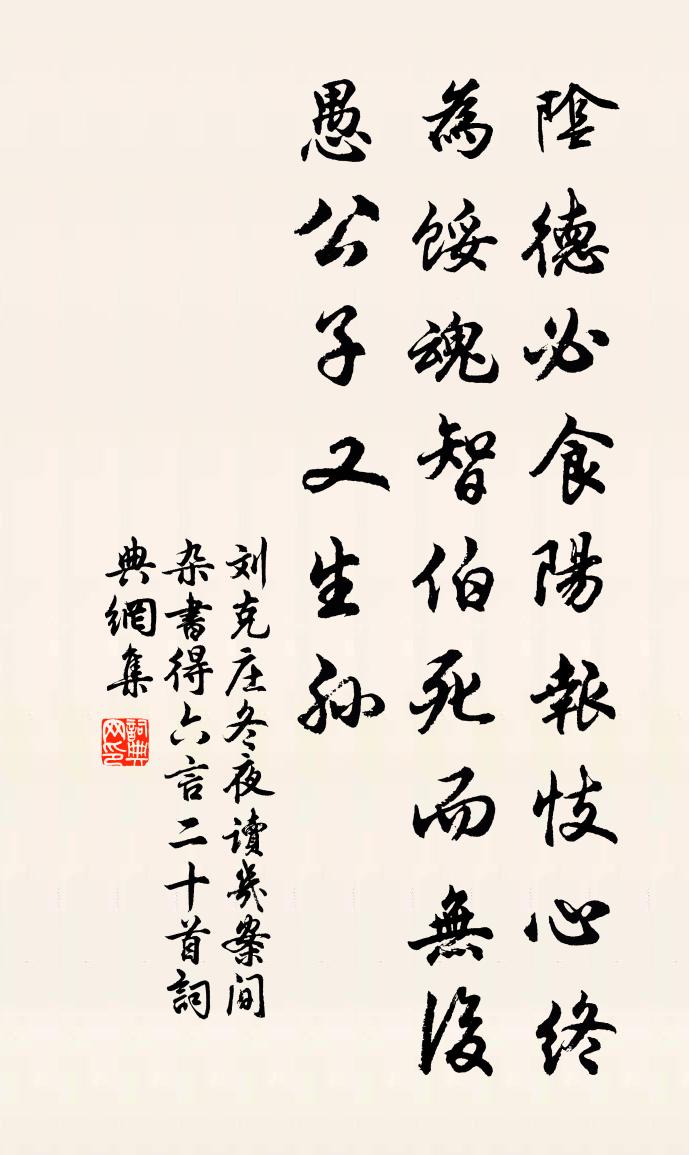 詩詞名句歷史字典書法欣賞書法字典國語詞典說文解字康熙字典古漢語字典標 題 作 者 詩 句 冬夜讀几案間雜書得六言二十首作者:劉克莊 朝代:宋代原文陰德必食陽報,忮心終為餒魂。智伯死而無後,愚公子又生孫。詩詞問答問:《冬夜讀几案間雜書得六言二十首》的作者是誰?答:劉克莊問:該詩寫於哪個朝代?答:宋代問:劉克莊的名句有哪些?答:劉克莊名句大全書法欣賞冬夜讀几案間雜書得六言二十首書法作品詩詞推薦送使廣州張九齡〔唐代〕家在湘源住,君今海嶠行。經過正中道,相送倍為情。心逐書郵去,形隨世網嬰。因聲謝遠別,緣義不緣名。七月一日出城舟中苦熱蘇軾〔宋代〕涼飆呼不來,流汗方被體。稀星乍明滅,暗水光瀰瀰。香風過蓮芡,驚枕裂魴鯉。欠伸宿酒余,起坐濯清泚。火雲奉待嚴大夫杜甫〔唐代〕殊方又喜故人來,重鎮還須濟世才。常怪偏裨終日待,不知旌節隔年回。欲辭巴徼啼鶯合,遠下荊門去鷁催。身老過南安道中陳元晉〔宋代〕火乘金伏勢方驕,天地圍爐萬物焦。那信炎蒸天六月,卻聞優渥雨三朝。頓添秋思生庭樹,頗覺春痕漲市橋。分我懷巴陵舊遊齊己〔唐代〕洞庭雲夢秋,空碧共悠悠。孟子狂題後,何人更倚樓。日西來遠棹,風外見平流。終欲重尋去,僧窗古岸頭。望仙樓晏幾道〔宋代〕小春花信日邊來,未上江樓先坼。今歲東君訊息,還自南枝得。素衣染盡天香,玉酒添成國色。一自故溪疏隔,腸寂照院李新〔宋代〕世路沉迷正厭醒,故山洗出纈龜屏。已因麗句迎門笑,更得疏篁作眼青。泥陽館賈島〔唐代〕客愁何並起,暮送故人回。廢館秋螢出,空城寒雨來。夕陽飄白露,樹影掃青苔。獨坐離容慘,孤燈照不開。送韓瀆殿院出守岳陽范仲淹〔宋代〕仕宦自飄然,君恩豈欲偏。才歸劍門道,忽上洞庭船。墜絮傷春目,春濤廢夜眠。岳陽樓上月,清賞浩無邊。織婦女蘇拯〔唐代〕伊余盡少女,一種飾螓首。徒能事機杼,與之作歌舞。歌舞片時間,黃金翻袖取。只看舞者樂,豈念織者苦。感此陪梁大諫陳察院同登蔣山吳芾〔宋代〕盡室齋心謁梵宮,願求一語卜窮通。老夫只欲歸田去,懶把前程問志公。金縷曲(古岩取後村和韻示余,如韻答之)劉辰翁〔宋代〕一笑披衣起。笑昨宵、東風似夢,韓張盧李。白髮紅雲溪上叟,不記兒孫年齒。但回首、秦亡漢駛。苦苦漁郎留不答元珍見贈孔武仲〔宋代〕汴柳氎氎綠蔽河,春城旅舍數相過。一聞高論煩襟豁,更捧新詩雅貺多。清鑒欲回荊玉價,蕪音難斷郢人歌。儒林偈頌一百零二首釋紹曇〔宋代〕高不高膚寸,低不低太華。深不深蹄涔,淺不淺溟渤。法華高低深淺,瞞諸人一點不得。諸人高低深淺,亦瞞法華雜曲歌辭。十二月樂辭。九月李賀〔唐代〕離宮散螢天似水,竹黃池冷芙蓉死。月綴金鋪光脈脈,涼苑虛庭空澹白。露花飛飛風草草,翠錦斕斑滿層道。雞人武林病中作釋寶曇〔宋代〕病闌無奈客塵嬰,百繞西湖夢不成。白髮自憐非故我,青山何事亦斗情。坡仙未死人安在,處士歸來或有盟。人物曆日許月卿〔宋代〕曆日從頭又一新,直饒燕雀喜新晴。梅花獻歲無邊景,喜鵲今朝第一聲。柳眼知時王幕綠,草心報國漢朝青。日晴淮陰張耒〔宋代〕蘆梢林葉雨蕭蕭,獨臥孤舟聽楚謠。生計飄然一搔首,西風沙上趁歸潮。句釋法平〔宋代〕夢魂不入入閒世。寄隱居士謝逸〔宋代〕先生骨相不封侯,卜居但得林塘幽。家藏玉唾幾千卷,手校韋編三十秋。相知四海孰青眼,高臥一庵今白頭。襄陽名句推薦擬把傷離情緒,待曉寒重說。納蘭性德《好事近·簾外五更風》 迴廊遠砌生秋草,夢魂千里青門道。馮延巳《菩薩蠻·迴廊遠砌生秋草》 一片閒愁,想丹青難貌柳永《尾犯·夜雨滴空階》 更可惜,雪中高樹,香篝熏素被。周邦彥《花犯·小石梅花》 一枝紅艷露凝香,雲雨巫山枉斷腸。李白《清平調·其二》 弄兒床前戲,看婦機中織鮑照《擬行路難·其六》 三五年時三五月,可憐杯酒不曾消。黃景仁《綺懷》 一簾紅雨桃花謝,十里清陰柳影斜。胡祗遹《陽春曲·春景》 得忍且忍,得耐且耐,不忍不耐,小事成災。佚名《增廣賢文·上集》 去意徊徨,別語愁難聽。周邦彥《蝶戀花·早行》
