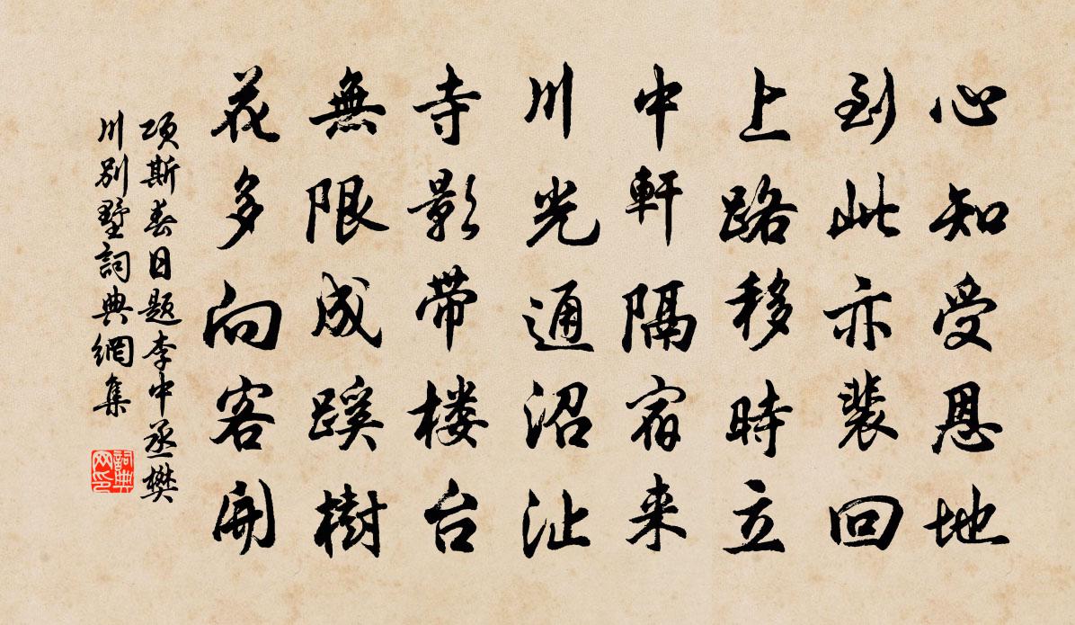 詩詞名句歷史字典書法欣賞書法字典國語詞典說文解字康熙字典古漢語字典標 題 作 者 詩 句 春日題李中丞樊川別墅作者:項斯 朝代:唐代春日題李中丞樊川別墅原文心知受恩地,到此亦裴回。上路移時立,中軒隔宿來。川光通沼沚,寺影帶樓台。無限成蹊樹,花多向客開。詩詞問答問:春日題李中丞樊川別墅的作者是誰?答:項斯問:春日題李中丞樊川別墅寫於哪個朝代?答:唐代問:春日題李中丞樊川別墅是什麼體裁?答:五律項斯春日題李中丞樊川別墅書法欣賞春日題李中丞樊川別墅書法作品注釋全唐詩:卷554-71詩詞推薦能仁翼長老寫師像求贊釋正覺〔宋代〕行腳句親,住山跡陳。默有餘味,言還失真。金髮響而出礙,玉雕文以喪純。胸中器宇,眉底精神。虎生三日食牛孤雁兒·世人作梅詩李清照〔宋代〕世人作梅詞,下筆便俗。予試作一篇,乃知前言不妄耳。藤床紙帳朝眠起,說不盡無佳思。沈香菸斷玉爐寒,伴我睡起二首黃庭堅〔宋代〕古來志士願不辱,少在朝廷多在山。寄食生涯無定止,此心長到白雲間。別秀亭五首方回〔宋代〕七載專城閒五載,賴逢此地足娛賓。高憑遠眺最佳處,□飲能吟凡幾人。晚輩漸催前輩老,來時豈料去時貧。是身奉和虢州劉給事使君三堂新題二十一詠竹洞韓愈〔唐代〕竹洞何年有,公初斫竹開。洞門無鎖鑰,俗客不曾來。經馮將軍墓陳允平〔宋代〕同山半白雲,此地葬將軍。香火空遺像,朝廷紀舊動。鐵衣懸古塔,金鉞鎮荒墳。一澗清泠水,年年生紫芹。李季允作吞雲樓索詩和總漕韻答之魏了翁〔宋代〕柵新飛觀走狐嗥,樓鶴洲鸚賀此遭。整暇旌旗登巀頁,奔波舟楫笑嗷嘈。宅中平後規摹拓,燭理明時運量高。須信病中絕句范成大〔宋代〕空里情知不著花,逢場將病當生涯。 * 軟暖無時節,夜聽蚊雷曉聽鴉。秋晨同淄川毛司馬秋九詠秋菊駱賓王〔唐代〕擢秀三秋晚,開芳十步中。分黃俱笑日,含翠共搖風。碎影涵流動,浮香隔岸通。金翹徒可泛,玉斝竟誰同。送張侍郎(張賈,時自兵侍為華州)韓愈〔唐代〕司徒東鎮馳書謁,丞相西來走馬迎。兩府元臣今轉密,一方逋寇不難平。七娘子王灼〔宋代〕花明霧暗非花霧。似春屏、短夢無憑據。夜月將來,曉燈催去。半衾餘暖空留住。情柔意密愁千縷。想一聲、雞唱偈頌四十一首釋慧暉〔宋代〕桃紅李白落空墀,天碧地青懸錦機。雲鶴出籠過鳥道,飽參密旨不傳時。同吳居安入開善四首宿省軒劉子翬〔宋代〕夜空合一寂,擾擾息萬勞。幽懷耿不寐,孤燈側殘膏。稍知山雨來,聲在橫林高。悽然卻成夢,夢泛秋江濤。和楊龍圖蘆雁屏蔡襄〔宋代〕何事高堂秋思生,野蘆寒雁畫工精。風前挺立孤根老,雲外相從去意輕。不似丹青能借色,若逢霜月定聞聲。研桑頌古九十八首釋印肅〔宋代〕東西南北,通徹交過。悟者清涼,迷者大禍。隨流入流,法真不墮。若未全提,誰敢擔何。挽中書俞侍郎二首洪咨夔〔宋代〕銓省承新渥,詞垣訪舊陰。頹波回萬折,斷岸立千尋。祗謂人猶已,那思昔異今。時清猶憤死,天地是知心。述閒陸游〔宋代〕披衣按摩罷,據榻欠伸余。香暖翻心字,茶凝出草書。客稀門每閉,意悶發重梳。賴有盆山樹,幽情得少攄。雨夜不寐觀壁間所張魏鄭公砥柱銘陸游〔宋代〕疾風三日橫吹雨,竹倒荷傾可憐汝。空堂無人夜向中,臥看床前燭花吐。壯懷耿耿誰與論,榰床老龜不能語。世間答中書詩謝靈運〔南北朝〕淒淒離人。惋乖悼己。企佇好音。傾渴行李。矧乃良朋。貽我瓊玘。久要既篤。平生盈耳。申復情言。欣嘆{牙丿梁鼓吹曲 桐柏山沈約〔南北朝〕桐柏山。淮之首。肇基帝跡。遂光區有。大震邊關。殪獯醜。農既勸。民惟阜。穗充庭。稼盈畝。迨嘉辰。{薦/名句推薦蟬鳴空桑林,八月蕭關道。王昌齡《塞下曲四首》 財以成者,扶而埋之;後得生者,而久禁之。墨子《墨子·22章 節用(下)》 父老得書知我在,小軒臨水為君開。蘇軾《送賈訥倅眉》 見肝之病,知肝傳脾,當先實脾張仲景《金匱要略·卷上·藏府經絡先後病脈證一》 世事茫茫難自料,春愁黯黯獨成眠。韋應物《寄李儋元錫》 是非只為多開口,煩惱皆因強出頭。佚名《增廣賢文·上集》 燕子飛來窺畫棟,玉鉤垂下簾旌。歐陽修《臨江仙·柳外輕雷池上雨》 信使可覆,器欲難量。周興嗣《千字文·全文》 海日生殘夜,江春入舊年。王灣《次北固山下》 年年郡縣送征人,將與遼東作丘坂。王建《遼東行》