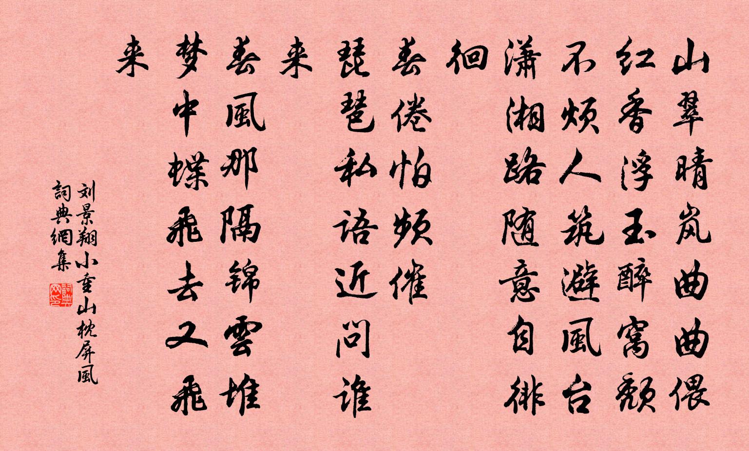 詩詞名句歷史字典書法欣賞書法字典國語詞典說文解字康熙字典古漢語字典標 題 作 者 詩 句 小重山(枕屏風)作者:劉景翔 朝代:宋代小重山(枕屏風)原文山翠晴嵐曲曲偎。紅香浮玉醉窩頹。不煩人築避風台。瀟湘路,隨意自徘徊。春倦怕頻催。琵琶私語近、問誰來。春風那隔錦雲堆。夢中蝶,飛去又飛來。詩詞問答問:小重山(枕屏風)的作者是誰?答:劉景翔問:小重山(枕屏風)寫於哪個朝代?答:宋代問:小重山(枕屏風)是什麼體裁?答:詞劉景翔小重山(枕屏風)書法欣賞小重山(枕屏風)書法作品詩詞推薦九章之三·哀郢屈原〔先秦〕皇天之不純命兮,何百姓之震愆?民離散而相失兮,方仲春而東遷。去故都而就遠兮,遵江夏以流亡。出國門而軫郭中山居方乾〔唐代〕莫見一瓢離樹上,猶須四壁在林間。沈吟不寐先聞角,屈曲登高自有山。濺石迸泉聽未足,亞窗紅果臥堪攀。公卿希夷陳先生祠堂范祖禹〔宋代〕太華朝紫清,蓮花開綠煙。嘗聞希夷隱,欲學南華仙。道與寥廓友,形隨變化遷。餐霞倚八極,御氣游九天。靜夜首尾吟邵雍〔宋代〕堯夫非是愛吟詩,詩是堯夫得意時。這意著何言語道,此情惟用喜歡追。仙家氣象閒中見,真宰功夫靜處知。不必十六夜待月海上李洪〔宋代〕月到中秋已壯觀,更看飛出海邊灘。光連貝闕鯨鯢駭,冷射蓬壺屭贔寒。萬頃銀濤俱皎潔,一輪金魄尚團欒。當年偈七首釋道顏〔宋代〕一葉落,天下秋。一塵起。大地收。鳥窠吹布毛,便有人悟去。今時學者,為甚麼卻不識自己。濁水求珠呂價〔唐代〕至寶誠難得,潛光在濁流。深沈當處晦,皎潔庶來求。綴履將還用,褰裳必更收。蚌胎應自別,魚目豈能儔。日彩和仲嚴弟暮春二絕潘良貴〔宋代〕吾生四十已侵尋,獨喜年來不動心。世事升沉君會否,人間春去落花深。竹枝劉禹錫〔唐代〕白帝城頭春草生,白鹽山下蜀江清。南人上來歌一曲,北人莫上動鄉情。乞巧詞楊維楨〔元代〕天上星重會,征西客未歸。殷勤乞方便,靈鵲度人飛。連嶺遇雨楊萬里〔宋代〕肩輿正好看山色,雨里兩窗開不得。此外只有書可觀,斜點又來濕書冊。一月秋晴一月泥,南翁此諺似可疑。山寒門有車馬客行陸機〔魏晉〕門有車馬客。駕言發故鄉。念君久不歸。濡跡涉江湘。投袂赴門塗。攬衣不及裳。拊膺攜客泣。掩淚敘溫涼。借問秋熱陸龜蒙〔唐代〕自惜秋捐扇,今來意未衰。殷勤付柔握,淅瀝待清吹。午氣朱崖近,宵聲白羽隨。總如南國候,無復婕妤悲。減字木蘭花佚名〔宋代〕春融酒困。一寸橫波千里恨。著處芳菲。蝶與鶯情醉自迷。敧雲妥翠。冷落金屏山十二。低抱琵琶。月向黃昏日又偈頌一百六十首釋宗杲〔宋代〕處處真,處處真,塵塵儘是本來人。真實說時聲不現,正體堂堂沒卻身。立春晚會呈經父孔武仲〔宋代〕侍史新從天下歸,相逢忻喜著春衣。萱芽刺土占芳節,蘭醑傾觴亂夕暉。兄弟幾人華萼聚,歲時經眼羽翰飛。東風送楊元光隨編修李秀才出守衡陽程公許〔宋代〕君到瀟湘漸迫秋,鄉關音問轉悠悠。思歸少忍煙塵息,回雁峰前莫浪愁。朝中措(九月末水仙開)王炎〔宋代〕薔薇露染玉肌膚。欲試縷金衣。一種出塵態度,偏宜月伴風隨。初疑邂逅,湘妃洛女,似是還非。只恐乘雲輕舉,適越留別譙縣張主薄申屠少府①孟浩然〔唐代〕朝乘汴河流,夕次譙縣界。②幸因西風吹,得與故人會。③君學梅福隱,余隨伯鸞邁。④別後能相思,浮雲在吳會送友人任括州沈佺期〔唐代〕青春浩無際,白日乃遲遲。胡為賞心客,嘆邁此芳時。甌粵迫茲守,京闕從此辭。茫茫理雲帆,草草念行期。紛吾名句推薦山致其高而雲雨起焉,水致其深而蛟龍生焉,君子致其道而德澤流焉。文子《文子·卷六·上德》 蓮子已成荷葉老。青露洗、蘋花汀草。李清照《怨王孫·湖上風來波浩渺》 百畝庭中半是苔,桃花淨盡菜花開。劉禹錫《再游玄都觀》 金樽清酒斗十千,玉盤珍羞直萬錢。李白《行路難·其一》 客思吟商還怯。怨歌長、瓊壺暗缺。周密《玉京秋·煙水闊》 粗繒大布裹生涯,腹有詩書氣自華。蘇軾《和董傳留別》 春日遲遲,卉木萋萋。佚名《出車》 蜂兒不解知人苦,燕兒不解說人愁。程垓《最高樓·舊時心事》 懷舊空吟聞笛賦,到鄉翻似爛柯人。劉禹錫《酬樂天揚州初逢席上見贈》 怒不過奪,喜不過予。荀子《荀子·修身》