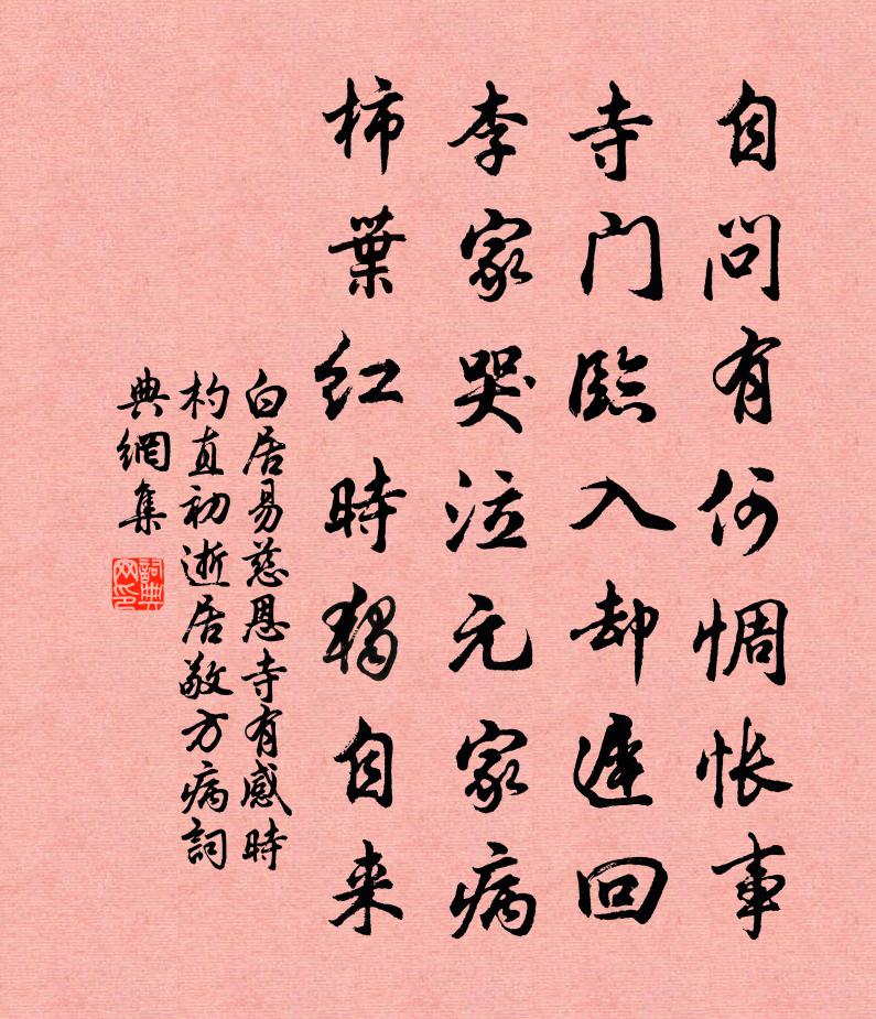 詩詞名句歷史字典書法欣賞書法字典國語詞典說文解字康熙字典古漢語字典標 題 作 者 詩 句 慈恩寺有感(時杓直初逝,居敬方病)作者:白居易 朝代:唐代原文自問有何惆悵事,寺門臨入卻遲回。李家哭泣元家病,柿葉紅時獨自來。詩詞問答問:《慈恩寺有感(時杓直初逝,居敬方病)》的作者是誰?答:白居易問:該詩寫於哪個朝代?答:唐代問:白居易的名句有哪些?答:白居易名句大全書法欣賞慈恩寺有感(時杓直初逝,居敬方病)書法作品詩詞推薦賢者之孝二百四十首丁儀子林同〔宋代〕尚自不與米,何堪大遺金。丁儀為有子,文略是誣親。送客野外始見春物萌動宋祁〔宋代〕苑路高高雪作泥,始知春信到芳蹊。綠波水暖魚腮驟,縹色陂長麥首齊。萬里碧雲隨望合,半規紅日有情低。榆牙詩一首元絳〔宋代〕閩山過盡見吳山,天載天涯五馬還。舊列未歸青瑣闥,餘生方入玉門關。林蠻迤邐平無數,星斗闌乾近可攀。回首有感趙崇嶓〔宋代〕舞罷歌停歲月深,當時勝跡盡銷沉。飛雲捲雨人爭賞,留得佳名尚到今。一剪梅·舟過吳江蔣捷〔宋代〕一片春愁待酒澆。江上舟搖,樓上簾招。秋娘渡與泰娘橋,風又飄飄,雨又蕭蕭。(渡 一作:度。橋 一作:嬌七夕楊億〔宋代〕東西燕子伯勞飛,新月如鉤玉露垂。河鼓天孫信靈匹,鵲橋星渚有佳期。穿鍼乞巧佇立久,織素成章報答遲。定與水龍吟樓枎〔宋代〕素蛾洗盡繁妝,夜深步月鞦韆地。輕腮暈玉,柔肌籠粉,緇塵斂避。霽雪留香,曉雲同夢,昭陽宮閉。悵仙園路杳黃陵題詠二首李壁〔宋代〕小哀洲北渚雲邊,二女明裝共儼然。野廟向江空寂寂,古碑無字草芊芊。東風近墓吹芳芷,落日深山哭杜鵑。猶似西園暮雪韓維〔宋代〕空園響松竹,霰雪靄霏霏。仰視長雲色,皓然同一輝。天寒鳴雁急,日暮行人稀。惟見眾小禽,啾唧滿林飛。陰風挽新安恭榮王詩虞儔〔宋代〕安僖折派慶源長,憲靖猗蘭奕葉芳。可但詞章夸華白,更餘政事說龔黃。兩宮密侍清間燕,三事榮分袞繡光。生死山中元夕吳說〔宋代〕憶昔觀燈夜,維舟天漢灣。千官環鳳輦,萬炬轉鰲山。異縣方營窟,佳辰獨掩關。悲涼追往事,華發坐來斑。句高蟾〔唐代〕君恩秋後葉,日日向人疏。頌證道歌證道歌釋印肅〔宋代〕游江海,涉山川,披雲帶雨足連天。道得亦來叉下死,三千里外為君傳。滿江紅(次盧漕高秋長短句,並呈都大)京鏜〔宋代〕才近重陽,喜風露、醞成爽氣。應料有、悲秋情緒,澹妝慵試。 * 籬邊開遍否,紫鴻塞外歸來未。但倚闌、高處此君室方岳〔宋代〕翛然數竿玉,帶以一溪水。惟我有是夫,孰能與於此。九日強至〔宋代〕霜淨乾坤闊,登高極古台。秋聲楓幾落,客眼菊三開。短髮頻看帽,寒吟間引杯。籬邊空意緒,難得白衣來。老身釋文珦〔宋代〕老身到此合稱翁,雙足蹣跚兩耳聾。聊托迂疎民世表,幸無名字到官中。生期槁木寒灰盡,性與孤猿野鶴同。去歲對酒李白〔唐代〕蒲萄酒,金叵羅,吳姬十五細馬馱。青黛畫眉紅錦靴,道字不正嬌唱歌。玳瑁筵中懷裡醉,芙蓉帳底奈君何。朱家曲歐陽修〔宋代〕行人傍衰柳,路向古河窮。桑柘田疇美,漁商市井通。薪歌晚入浦,舟子夜乘風。旅舍孤煙外,天京王氣中。山川紅樓夢十二曲——晚韶華曹雪芹〔清代〕鏡里恩情,更那堪夢裡功名!那美韶華去之何迅,再休提繡帳鴛衾。只這戴朱冠披鳳襖,也抵不了無常性命。雖說名句推薦岸容待臘將舒柳,山意沖寒欲放梅。杜甫《小至》 少年射虎名豪,等閒赤羽千夫膳元好問《水龍吟·從商帥國器獵於南陽同仲澤鼎玉賦此》 天山三丈雪,豈是遠行時。李白《獨不見》 欲窮千里目,更上一層樓。王之渙《登鸛雀樓》 歌聲未盡處,先淚零周邦彥《綺寮怨·上馬人扶殘醉》 無情燕子,怕春寒、輕失花期。晁沖之《漢宮春·梅》 自與東君作別,剗地無聊。納蘭性德《風流子·秋郊即事》 盡道隋亡為此河,至今千里賴通波。皮日休《汴河懷古二首》 雪沫乳花浮午盞,蓼茸蒿筍試春盤。蘇軾《浣溪沙·細雨斜風作曉寒》 千人之諾諾,不如一士之諤諤。司馬遷《史記·商君列傳》