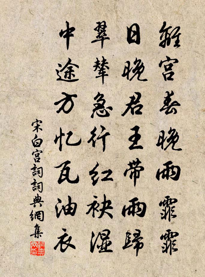 詩詞名句歷史字典書法欣賞書法字典國語詞典說文解字康熙字典古漢語字典標 題 作 者 詩 句 宮詞作者:宋白 朝代:宋代宮詞原文離宮春晚雨霏霏,日晚君王帶雨歸。翠輦急行紅袂濕,中途方憶瓦油衣。詩詞問答問:宮詞的作者是誰?答:宋白問:宮詞寫於哪個朝代?答:宋代宋白宮詞書法欣賞宮詞書法作品詩詞推薦贈都下隱者范仲淹〔宋代〕梅福隱市門,嚴平居卜肆。乃知神仙徒,非必煙霞地。異哉西山人,逍遙京洛塵。門多長者車,察脈如有神。軒皇食筍馮時行〔宋代〕錦籜初開玉色鮮,烹苞葅脯盡稱賢。絕能加飯非無補,浪說冰脾苦不便。一日偶無慵下箸,四時都有不論錢。寒儒常州郡齋六首陳襄〔宋代〕山亭側畔構山房,便是耕雲鉤月鄉。未達功名窮飲水,此生應不誤行藏。雨中登岳陽樓望君山二首黃庭堅〔宋代〕投荒萬死鬢毛斑,生入瞿塘灩澦關。未到江南先一笑,岳陽樓上對君山。滿川風雨獨憑欄,綰結湘娥十二鬟。可惜先賞牡丹寄提刑考功余靖〔宋代〕花期何事早追陪,鶯未遷喬燕未來。曲檻為逢春日暖,香苞先逐曉風開。旋邀歌舞同儕樂,卻嘆光陰急景催。可惜贈歙州妓趙嘏〔唐代〕灩灩橫波思有餘,庾樓明月墮雲初。揚州寒食春風市,看遍花枝盡不如。中渡劉子翬〔宋代〕渡南渡北是長亭,沙上行人立馬情。回首若無煙樹隔,只應猶望見高城。竇朗州見示與澧州元郎中早秋贈答命同作劉禹錫〔唐代〕鄰境諸侯同舍郎,芷江蘭浦恨無梁。秋風門外旌旗動,曉露庭中橘柚香。玉簟微涼宜白晝,金笳入暮應清商,騷人硃砂庵江天一〔明代〕曲磴千盤盡,何曾任鑿穿。本來超色相,不假幻因緣。翠滴松稍雨,嵐開嶂外天。此中饒靜解,何事問棲禪。古剎十二時頌釋文準〔宋代〕平旦寅,當人有道事須親。不聞先聖有慈訓,莫認狂痴作近鄰。寄題艾惠夫容膝軒詩李若水〔宋代〕鄉人極口夸吾友,夸道新來葺妙居。東晉風流千載後,南窗瀟灑數椽余。無腸可著猶貪酒,有眼能看肯廢書。記取四代好/宴清都程垓〔宋代〕翠幕東風早。蘭窗夢,又被鶯聲驚覺。起來空對,平階弱絮,滿庭芳草。厭厭未忺懷抱。記柳外、人家曾到。憑畫牡丹和韻二首衛宗武〔宋代〕似肋還似囷,尊號擅芳名。洛土分來種,景星流作英。紛敷為絕色,向背若含情。別久喜相對,開尊話舊盟。後漢門周都妻周曇〔唐代〕綠水雙鴛一已沈,皇天更欲配何禽。不將血涕隨霜刃,誰見朱殷未死心。送九兄僉書歸二首蔡戡〔宋代〕離別一可久,漂流不記年。昔君猶壯歲,今我亦華鬋。隔闊疑如夢,從容喜欲顛。弟兄能有幾,有此對床眠。句何麒〔宋代〕梁山韭黃妙天下,玉箸金釵盈大把。予初仕為寧德縣主簿而朱孝聞景參作尉情好甚陸游〔宋代〕白鶴峰前試吏時,尉曹詩酒樂新知。傷心忽入西窗夢,同在峬村折荔枝。止酒示圭陳起〔宋代〕一病杯中物致危,翰林何事酷耽之。酒經若果通仙道,不向青山立斷碑。紀關隴鄭剛中〔宋代〕十載三光分,號令南北阻。四達禮義鄉,限礙成蠻楚。帝王豈無真,社稷固有主。欃槍不待射,避路過河滸。職方春雪秦韜玉〔唐代〕雲重寒空思寂寥,玉塵如糝滿春朝。片才著地輕輕陷,力不禁風旋旋銷。惹砌任他香粉妒,縈叢自學小梅嬌。誰家名句推薦江皋樓觀前朝寺,秋色入秦淮。徐再思《人月圓·甘露懷古》 世上萬般哀苦事,無非死別與生離。馮夢龍《醒世恆言·卷十九》 舟遙遙以輕颺,風飄飄而吹衣。陶淵明《歸去來兮辭·並序》 昔時賢文,誨汝諄諄。佚名《增廣賢文·上集》 打算精明,自謂自計,然敗祖父之家聲者,必此人也王永彬《圍爐夜話·第十九則》 南去北來徒自老,故人稀。賀鑄《釣船歸·綠淨春深好染衣》 少年心事當拿雲,誰念幽寒坐嗚呃。李賀《致酒行》 河畔青蕪堤上柳,為問新愁,何事年年有?馮延巳《鵲踏枝·誰道閒情拋棄久》 我來圯橋上,懷古欽英風。李白《經下邳圯橋懷張子房》 思家步月清宵立,憶弟看雲白日眠。杜甫《恨別》