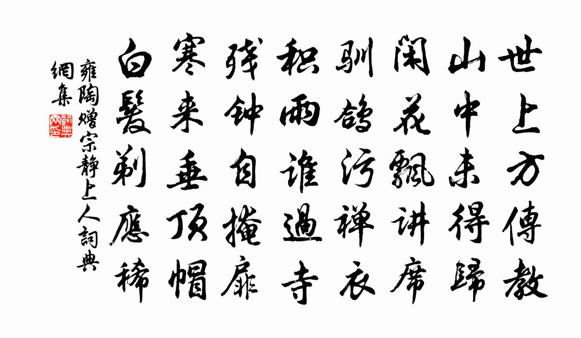 詩詞名句歷史字典書法欣賞書法字典國語詞典說文解字康熙字典古漢語字典標 題 作 者 詩 句 贈宗靜上人作者:雍陶 朝代:唐代贈宗靜上人原文世上方傳教,山中未得歸。閒花飄講席,馴鴿污禪衣。積雨誰過寺,殘鍾自掩扉。寒來垂頂帽,白髮剃應稀。詩詞問答問:贈宗靜上人的作者是誰?答:雍陶問:贈宗靜上人寫於哪個朝代?答:唐代問:贈宗靜上人是什麼體裁?答:五律雍陶贈宗靜上人書法欣賞贈宗靜上人書法作品注釋全唐詩:卷518-10詩詞推薦雜詠一百首東家女劉克莊〔宋代〕神女登徒子,微詞未必然。感襄通一夢,窺玉費三年。送元播李新〔宋代〕恩光渺渺似涪波,濕雪欺梅奈別可。斂盡寒威離兩蜀,播將春色入三河。輕裝舊橐黃金少,故國新豐美酒多。不負王彥博徐審知頻來問疾口占示之趙蕃〔宋代〕秋來瘧鬼不銷亡,令我兼旬病在床。治藥頻成問良苦,易衣終日屢炎涼。但添特色色增悲壯,那有功名憶慨慷。多每見王太丞邑事甚冗而剸劇之暇猶能過訪山館王安石〔宋代〕我看繁訟頻搔首,君富才明見亦常。尚有閒襟尋水石,更留佳句似池塘。松苗地合分高下,鳧鶴天教有短長。徐上華山楊備〔宋代〕岩屏晚樹噪寒鴉,嵐翠樓台釋子家。池面鏡光功德水,金波影里石蓮花。謝葉文思惠茶酒白玉蟾〔宋代〕先將荼醾薰酒,卻採枸杞烹茶。子謂人非土木,賢知吾豈匏瓜。發嘉州答張倅用前韻孫應時〔宋代〕主人今代岑嘉州,倦客當年馬少游。即是孤帆行萬里,空懷一日過三秋。酒邊風味春生不坐,筆底詞峽倒流。浪有趙樂道輓詩二首毛滂〔宋代〕耆舊彫零盡,歸來悲故鄉。雲山橫爽氣,杖履屬空床。蚤發名難沒,終榮德未央。芝蘭日夜長,遺範在諸郎。久客杜甫〔唐代〕羈旅知交態,淹留見俗情。衰顏聊自哂,小吏最相輕。去國哀王粲,傷時哭賈生。狐狸何足道,豺虎正縱橫。仙蛻李仲光〔宋代〕晝夜本循環,天地均此理。人生出入機,晝夜差可擬。仙家學蟬蛻,脫然遺腐胔。白骨尚珍藏,似未忘生死。偈二十二首釋洵〔宋代〕是非海里橫身入,豺虎群中放步行。自是渠儂無影跡,從教天下競頭爭。常在動用中,動用收不得。常在萬象中,胡笳十八拍第十七拍劉商〔唐代〕行盡胡天千萬里,唯見黃沙白雲起。馬飢跑雪銜草根,人渴敲冰飲流水。燕山仿佛辨烽戍,鼙鼓如聞漢家壘。努力採蓮曲齊己〔唐代〕越溪女,越江蓮。齊菡萏,雙嬋娟。嬉遊向何處,採摘且同船。浩唱發容與,清波生漪連。時逢島嶼泊,幾共鴛鴦峴山范微之〔宋代〕南□會要地,山水控雄壯。峨峨峙峴首,濃綠疊千嶂。群峰相迤邐,頑□廁□□。漢流紀東麓,汪汪□□漲。原隰次韻前人新晴三首陳著〔宋代〕院靜春深冷麝煤,怕逢花委細蒼苔。小桃卻自紅如錦,笑倚東風醉入腮。句蔡隱丘〔唐代〕整巾千嶂聳,曳履百泉鳴。點絳唇趙彥逾〔宋代〕春到皇都,日邊已覺風光麗。異人名世。獨稟陽和粹。福壽川增,行慶鴛行綴。笙歌重。幾多珠翠。拚取今宵醉。寄皎然上人韋應物〔唐代〕吳興老釋子,野雪蓋精廬。詩名徒自振,道心長晏如。想茲棲禪夜,見月東峰初。鳴鐘驚岩壑,焚香滿空虛。叨慕水調歌頭張翥〔元代〕三十九年我,老色上吟髭。生辰月宿南斗,正合退之詩。今歲兩逢正月,準算恰成四十,歲暮日斜時。臘彘剮紅玉宋次道得廣南金橘為餉且有詩因和酬梅堯臣〔宋代〕越橘如金丸,爛然已盈篋。誰傳嶺外信,尚帶霜前葉。莫嫌道路遠,得與樽俎接。主人無吝心,懷歸予敢輒。名句推薦易求無價寶,難得有心郎。魚玄機《贈鄰女 / 寄李億員外》 撥雪尋春,燒燈續晝。暗香院落梅開後。毛滂《踏莎行·元夕》 只有天在上,更無山與齊寇準《詠華山》 月黑見漁燈,孤光一點螢。查慎行《舟夜書所見》 九月九日眺山川,歸心歸望積風煙。盧照鄰《九月九日玄武山旅眺》 白雲回望合,青靄入看無。王維《終南山》 執手相看淚眼,竟無語凝噎。柳永《雨霖鈴·寒蟬淒切》 積善三年,知之者少,為惡一日,聞於天下。房玄齡《晉書·帝紀·第一章》 一年滴盡蓮花漏。碧井酴酥沈凍酒。毛滂《玉樓春·己卯歲元日》 擬泛煙中片葉,但兩湖佳處,任風吹泊徐燦《念奴嬌·西湖雨感次素庵韻》