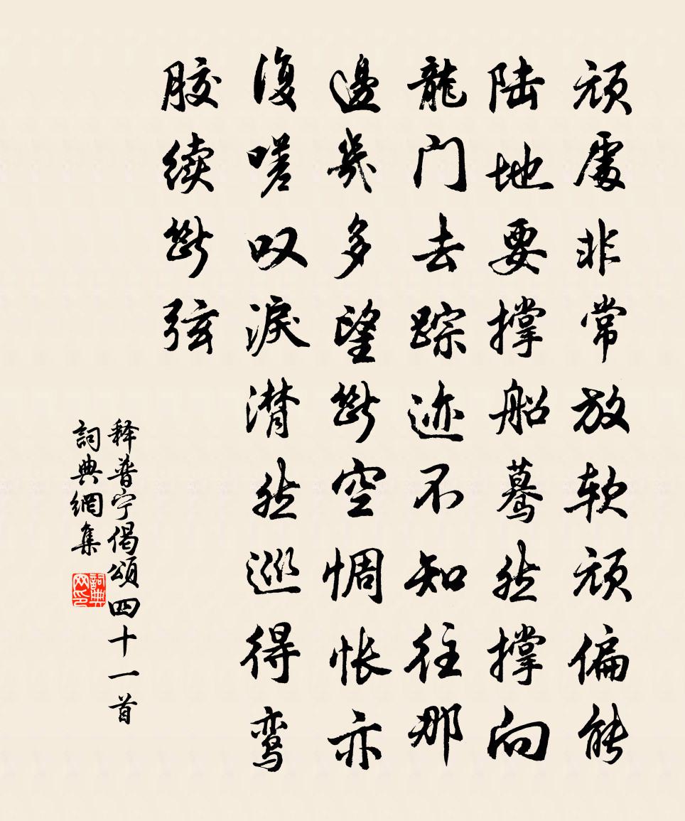 詩詞名句歷史字典書法欣賞書法字典國語詞典說文解字康熙字典古漢語字典標 題 作 者 詩 句 偈頌四十一首作者:釋普寧 朝代:宋代偈頌四十一首原文頑處非常放軟頑,偏能陸地要撐船。驀然撐向龍門去,蹤跡不知往那邊。幾多望斷空惆悵,亦復嗟嘆淚潸然,巡得鸞膠續斷弦。詩詞問答問:偈頌四十一首的作者是誰?答:釋普寧問:偈頌四十一首寫於哪個朝代?答:宋代釋普寧偈頌四十一首書法欣賞偈頌四十一首書法作品詩詞推薦雜興十二首方回〔宋代〕人固有倒行,天亦有逆施。膾肝富且壽,沴氣乃至茲。歲旱茂稊稗,夜暗號鴞鴟。正卯宜一律,遇塗姑巽辭。麟經索莫張耒〔宋代〕索莫歸未得,閒雲還滿空。愁吟對寒月,不睡到晨鐘。衣喜初冬寄,書憐手自封。何當聽夜雪,暖酒夜爐紅。泗州僧伽塔蘇軾〔宋代〕我昔南行舟擊汴,逆風三日沙吹面。舟人共勸禱靈塔,香火未收旗腳轉。回頭頃刻失長橋,卻到龜山未朝飯。至人句王琪〔宋代〕萬壑松聲山雨過,一川花氣水風生。春雨吳融〔唐代〕霏霏漠漠暗和春,冪翠凝紅色更新。寒入膩裘濃曉睡,細隨油壁靜香塵。連雲似織休迷雁,帶柳如啼好贈人。別有三月乙巳來賦鹽萬歲鄉且搜獼匿賦之家晏飯此黃庭堅〔宋代〕飛廉決雲開白日,頓撼天地萬竅號。挼挱桃李欲淨盡,乞與遊絲百尺高。何司業和屋字詩見詒次韻奉酬喻良能〔宋代〕亦好園林富松竹,愛山堂上書連屋。恨無妙語為題品,空對奇峰有十六。先生佳句落泉石,杜詩韓筆端能續。有如送葉味道赴南宮陳文蔚〔宋代〕聖世宗儒重設料,名公碩德總搜羅。近年底事摧頹甚,士氣都比斬喪多。憂世情詞常懇惻,喜君事業久研磨。不才題金山妙高堂楊萬里〔宋代〕金山未到時,羨渠奄有萬里之長江。金山既到子,長江不見只見千步廊。老夫平生不奈事,點檢風光難可意。老僧趙仲瑜小景二首陳某〔宋代〕遠水望不極,斷雲低復連。青山秋樹屋,野渡夕陽船。幽思滄洲上,歸心白雁前。異鄉非隱地,聊欲寄林泉。戴氏樓名折桂來覓詩賦二十八字舒邦佐〔宋代〕秋入高樓風露涼,疑從月里送清香。五枝高折非難事,問取燕山竇十郎。與因典座釋正覺〔宋代〕胸中行腳事分明,親見芙蓉綴晚英。黑馬踏霜元不跡,白魚吹水了無聲。投機曾弄無須鎖,出手相扶折腳鐺。去米念奴嬌(坐上和何司戶)王之望〔宋代〕堂堂七尺,懍一時人物,孤映三蜀。閒雅風流豪醉後,猶有臨邛遺俗。十載虞庠,一官楚塞,雅操凌寒玉。江山千立夏明日行園無客五首方回〔宋代〕葺圃疏畦日荷鋤,六旬老叟尚何圖。臥床迫夏猶氈褥,宴幾經春只藥爐。群竊花枝相侮易,合攜竹杖與驅除。千金韓祠三首劉克莊〔宋代〕萊相竹今供戌卒,武侯柏亦付胡兒。南來獨有昌黎木,神物千年尚護持。寄懷楚和尚二首貫休〔唐代〕吾師師子兒,而復貌瑰奇。何得文明代,不為王者師。鐵盂湯雪早,石炭煮茶遲。謾有參尋意,因循到亂時。跳躑已亥雜詩 106龔自珍〔清代〕西來白浪打旌旗,萬舶安危總未知。寄語瞿塘江上賈,收帆好趁順風時。郊行感懷林季仲〔宋代〕竹光野色淨祠堂,古木千章儼在傍。矯矯先生竟何在,痴兒猶認石為羊。食酥二首曾幾〔宋代〕貢包分自浙西東,函谷金城在眼中。泛酒煎茶俱愜當,滿前臘雪化春風。續作永昭陵輓詞五首歐陽修〔宋代〕王者居尊本無外,由來天下以為家。六龍白日乘雲去,何用金錢買道車。名句推薦阿婆還似初笄女,頭未梳成不許看。袁枚《遣興》 豈曰無衣?與子同袍。佚名《秦風·無衣》 力勝貧,謹勝禍,慎勝害,戒勝災。劉向《說苑·談叢》 瘦影自臨春水照,卿須憐我我憐卿。馮小青《怨》 仁也者,人也。合而言之,道也。孟子《孟子·盡心章句下·第十六節》 橫戈從百戰,直為銜恩甚。李白《塞下曲六首》 知君慣度祁連城,豈能愁見輪台月。岑參《送李副使赴磧西官軍》 鳥雀呼晴,侵曉窺檐語。周邦彥《蘇幕遮·燎沉香》 傷心莫問前朝事,重上越王台。倪瓚《人月圓·傷心莫問前朝事》 師之所處,荊棘生焉。大軍之後,必有凶年。老子《老子·道經·第三十章》