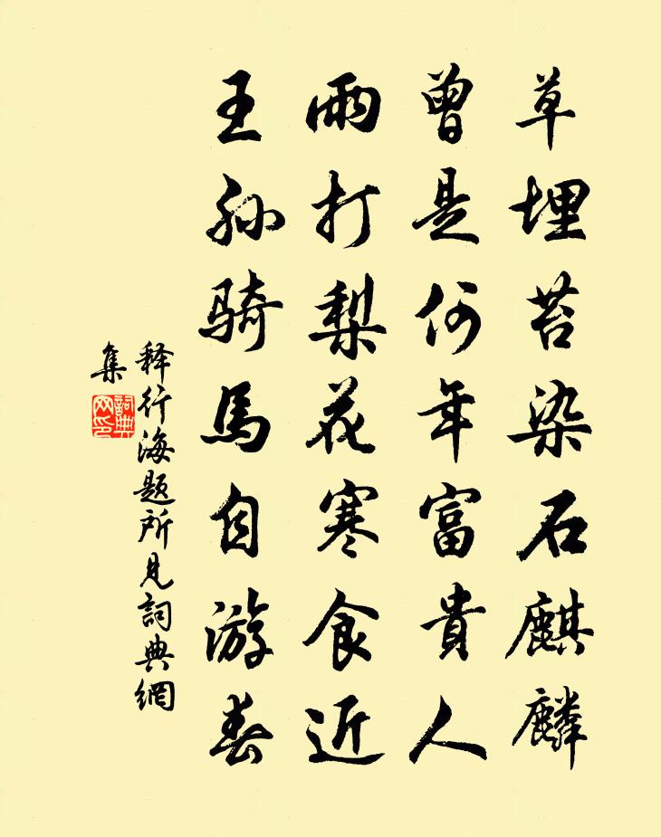 詩詞名句歷史字典書法欣賞書法字典國語詞典說文解字康熙字典古漢語字典標 題 作 者 詩 句 題所見作者:釋行海 朝代:宋代題所見原文草埋苔染石麒麟,曾是何年富貴人。雨打梨花寒食近,王孫騎馬自遊春。詩詞問答問:題所見的作者是誰?答:釋行海問:題所見寫於哪個朝代?答:宋代釋行海題所見書法欣賞題所見書法作品詩詞推薦和紀參軍服散得益詩謝朓〔南北朝〕金液稱九轉。西山歌五色。煉質乃排雲。濯景終不測。雲英誰可餌。且駐羲和力。能令長卿臥。暫故遇真識。脫京口定變難文天祥〔宋代〕老兵中變意差池,倉卒呼來朽索危。若使阿婆真一吼,目生隨後悔何追。送薛弁歸河東岑參〔唐代〕薛侯故鄉處,五老峰西頭。歸路秦樹滅,到鄉河水流。看君馬首去,滿耳蟬聲愁。獻賦今未售,讀書凡幾秋。應過寒食相將諸子游翟得園十詩楊萬里〔宋代〕三月風光一歲無,杏花欲過李花初。柳絲自為春風舞,竹尾如何也學渠。再賦春寒方回〔宋代〕已近江南煮酒天,單衣時節更重綿。女郎鬥草頻呵手,老子看花剩聳肩。歸燕迎風簾外語,新鵝怯水岸問眠。雪如四望亭觀荷花姚勉〔宋代〕面面湖光面面風,可人最是白芙蓉。分明飛下雙雙鷺,才到花邊不見蹤。似曾詩譚嗣同〔清代〕同住蓮花證四禪,空然一笑是橫闐。惟紅法雨偶生色,被黑罡風吹墮天。大患有身無相定,小言破道遣愁篇。年來梁州令疊韻/梁州令晁補之〔宋代〕田野閒來慣。睡起初驚曉燕。樵青走掛小簾鉤,南園昨夜,細雨紅芳遍。平蕪一帶煙光淺。過盡南歸雁。俱遠。憑端午帖子太上皇帝閣周必大〔宋代〕三紀躋民壽域中,艾人桃印本何功。如今坐享無窮報,幾看龜巢蓮葉紅。題湯柏紀程文劉克莊〔宋代〕詔書選後宮,眾女競媒致。拂鏡濃畫眉,臨風高綰髻。朝猶東鄰居,夕已金屋貴。彼姝絕代姿,綽約乘雲氣。箴史題洪和觀靜齋五邁〔宋代〕蠻觸當戰沖,蚌鶩據爭境。相持無了期,復命終歸靜。人事告紛拿,世態異炎冷。遠抱異俗觀,照以清明景。餘生疾邪詩二首趙壹〔兩漢〕其一河清不可恃,人命不可延。順風激靡草,富貴者稱賢。文籍雖滿腹,不如一囊錢。伊優北堂上,骯髒倚門邊。好事近 寒夜張翥〔元代〕門外晚風生,鼓角城頭欲動。霜月滿天如水,漸夜深寒重。幽人擁被醉模糊,無愁也無夢。只有些兒心上,怕梅花山居詩釋延壽〔宋代〕棲真境界太玄鄉,靜見吾宗不可量。好句只憑詩斷送,閒緣唯遣道消亡。雨絲雲織經條密,煙素風抽細縷長。竟敢茶花二首蘇轍〔宋代〕黃櫱春芽大麥粗,傾山倒谷采無餘。久疑殘枿陽和盡,尚有幽花霰雪初。耿耿清香崖菊淡,依依秀色嶺梅如。經冬襄陽第五文天祥〔宋代〕十年殺氣盛,百萬攻一城。賊臣表逆節,胡騎忽縱橫。讀田光傳李遠〔唐代〕秦滅燕丹怨正深,古來豪客盡沾襟。荊卿不了真閒事,辜負田光一片心。明道親享先農十首佚名〔宋代〕將躬黛耜,先陟靈壇。嘉玉量幣,樂光禮殫。神既至止,福亦和安。千斯積詠,萬國多嘆。解語花楊 * 〔宋代〕星橋夜度,火樹宵開,燈月光交射。翠檐銅瓦。相輝映、隱隱絳霞飄下。風流艷雅。向柳陌、纖纖共把。筵宴時、王母望闕致語口號方岳〔宋代〕曉蹕初催上壽班,東風連夜致人間。九重春醉金鸞殿,萬歲聲幽碧玉環。大地山河年穀熟,太平日月羽書閒。明朝名句推薦十年離亂後,長大一相逢。李益《喜見外弟又言別》 燕子飛來窺畫棟,玉鉤垂下簾旌。歐陽修《臨江仙·柳外輕雷池上雨》 來是春初,去是春將老。曾允元《點絳唇·一夜東風》 君子少思長,則學;老思死,則教;有思窮,則施也。荀子《荀子·法行》 已訝衾枕冷,復見窗戶明。白居易《夜雪》 九州生氣恃風雷,萬馬齊喑究可哀。龔自珍《己亥雜詩·其二百二十》 食者,國之寶也;兵者,國之爪也墨子《墨子·05章 七患》 自笑堂堂漢使,得似洋洋河水,依舊只流東陳亮《水調歌頭·送章德茂大卿使虜》 妖嬈艷態,妒風笑月,長殢東君。李清照《慶清朝·禁幄低張》 從來幽怨應無數?鐵馬金戈,青冢黃昏路。納蘭性德《蝶戀花·出塞》