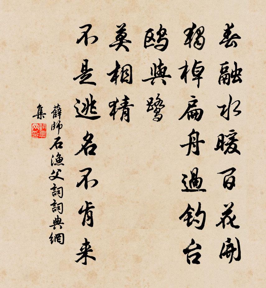 詩詞名句歷史字典書法欣賞書法字典國語詞典說文解字康熙字典古漢語字典標 題 作 者 詩 句 漁父詞作者:薛師石 朝代:宋代漁父詞原文春融水暖百花開,獨棹扁舟過釣台。鷗與鷺,莫相猜,不是逃名不肯來。詩詞問答問:漁父詞的作者是誰?答:薛師石問:漁父詞寫於哪個朝代?答:宋代薛師石漁父詞書法欣賞漁父詞書法作品詩詞推薦僧道暉疏泉疊石種松竹梅有詩求和次韻戴栩〔宋代〕松下煮茶冰折玉,梅梢掛衲蘚黏綠。莫侵石塢竹邊行,行處明年減新竹。青山道文同〔宋代〕冥冥青山道,叢木含古煙。遠客事行役,未晚不敢前。乳虎正養子,採食大路邊。但顧已所急,其誰辨愚賢。滾繡球楊巽齋〔宋代〕琢玉英標不染塵,光涵月影愈清新。青皇宴罷呈餘技,拋向東風展轉頻。金陵十二釵又副冊——襲人曹雪芹〔清代〕枉自溫柔和順,空雲似桂如蘭。堪羨優伶有富,誰知公子無緣。徐制準輓辭方回〔宋代〕紛紜鐘鼎誤公卿,孰與山林保令名。不共鵠袍爭舉業,早令熊轡紹詩聲。人間倏忽驚興廢,物外從容了死生。何限次韻酬喻工部雪中見懷張鎡〔宋代〕坐厭增冰地,遙思勝熱城。忘名全道用,遠俗養詩情。枕病憐幽獨,心交阻合併。晴春開徑在,自斷學淵明。上縉雲段使君貫休〔唐代〕清畏人知人盡知,縉雲三載得宣尼。活民刀尺雖無象,出世文章豈有師。術氣芝香粘瓮榼,雲痕翠點滿旌旗。今朝九日阻雨簡高侍御(時與高公近鄰)皎然〔唐代〕江上重雲起,何曾裛□塵。不能成落帽,翻欲更摧巾。素髮閒依枕,黃花暗待人。且應攜下價,芒屨就諸鄰。和衡守宋安序送行詩文天祥〔宋代〕玉立湘西第一州,丹梯小為岳雲留。東風城郭人行樂,春日旌旗公出遊。便趁綈香摩碧漢,莫嫌繡影涴清流。兩君惜奴嬌王之道〔宋代〕甚麽因緣,恰得一年相聚。和閏月、更無剩數。說著分飛,背面偷彈玉箸。好去。記取許時言語。舊愛新人,後夜夜合花(和李浩季良牡丹)晁補之〔宋代〕百紫千紅,占春多少,共推絕世花王。西都萬家俱好,不為姚黃。謾腸斷巫陽。對沈香、亭北新妝。記清平調,詞陌上花三首蘇軾〔宋代〕游九仙山,聞里中兒歌陌上花,父老雲,吳越王妃每歲春必歸臨安,王以書遺妃曰:“陌上花開,可緩緩歸矣。”南歌子陳克〔宋代〕愛日烘晴書,輕寒護曉霜。小春庭院繞天香。仙風珊珊來自、五雲鄉。庭下芝蘭秀,壺中日月長。要看發綠與瞳方梅雨五絕范成大〔宋代〕雨霽雲開池面光,三年魚苗如許長。小荷拳拳可包鮓,晚日照盤風露香。重題釣台吳錫疇〔宋代〕不向雲台戀故袍,清風固自釣台高。渭川八十年煙雨,豈是漁竿把不牢。讀江南諸公詩晁公溯〔宋代〕吟盡江南草木春,只今台閣有詩人。漢廷安用滄浪句,容我持竿詠白苹。百字令 月夜過七里灘厲鶚〔清代〕秋光今夜,向桐江,為寫當年高躅。風露皆非人世有,自坐船頭吹竹。萬籟生山,一星在水,鶴夢疑重續。孥音遙過則上人庵釋正覺〔宋代〕歸來蘿蔦掛煙蓑,釣月耕雲倦也那。山上山下吞佛語,溪東溪西牧牛歌。廿年樹耳亡疑著,一個拳頭得用麽。做盡江口有懷二首白玉蟾〔宋代〕丹楓偷落風無覺,白鷺微行魚不知。兩地南樓今夜月,一般清皎百般思。卜運算元佚名〔宋代〕雲雨陽台夢不成。名句推薦當事者迷,旁觀者清。佚名《增廣賢文·下集》 昔別君未婚,兒女忽成行杜甫《贈衛八處士》 黃河萬里觸山動,盤渦轂轉秦地雷。李白《西嶽雲台歌送丹丘子》 雙燕飛來,陌上相逢否?撩亂春愁如柳絮。馮延巳《鵲踏枝·幾日行云何處去》 凡音者,產乎人心者也。呂不韋《呂氏春秋·紀·季夏紀》 九日悲秋不到心。鳳城歌管有新音。晏幾道《鷓鴣天·九日悲秋不到心》 常恐秋節至,焜黃華葉衰。佚名《長歌行》 高山仰止,景行行止。佚名《車舝》 風也蕭蕭,雨也蕭蕭,瘦盡燈花又一宵。納蘭性德《採桑子·誰翻樂府淒涼曲》 憶對中秋丹桂叢。花在杯中。月在杯中。辛棄疾《一剪梅·中秋元月》