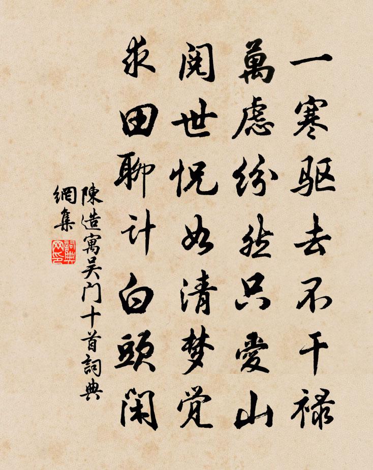 詩詞名句歷史字典書法欣賞書法字典國語詞典說文解字康熙字典古漢語字典標 題 作 者 詩 句 寓吳門十首作者:陳造 朝代:宋代寓吳門十首原文一寒驅去不乾祿,萬慮紛然只愛山。閱世怳如清夢覺,求田聊計白頭閒。詩詞問答問:寓吳門十首的作者是誰?答:陳造問:寓吳門十首寫於哪個朝代?答:宋代陳造寓吳門十首書法欣賞寓吳門十首書法作品詩詞推薦江村釋文珦〔宋代〕古樹兩三株,人家四散居。草檐經雨爛,沙路過潮虛。漁罷籬懸網,耕歸壁掛鋤。相呼命鄰叟,農隙課兒書。福昌雜詠五首張耒〔宋代〕東望川原拱別都,漢唐冠蓋已兵墟。地橫嵩少雄中夏,天險轘轅困萬夫。宮殿荒涼興廢恨,山河慘澹戰爭余。登臨東籬雜題陸游〔宋代〕南陌歸雖人,東籬興又新。無求覺身貴,好儉失家貧。引水常終日,栽花又過春。桃源不須覓,已是葛天民。和王弱翁七首彭龜年〔宋代〕霜螯百鎰重,人世一身多。我意已悽慘,如君風味何。春間小詩書趙壁追錄之朱槔〔宋代〕自得春風信,開懷待此花。余寒固艱棘,今夕雪斜斜。頌古十九首釋慧暉〔宋代〕庵主當年用得親,衲僧眼裡要生筋。趙州舌有龍泉劍,開口等閒疑 * 。履道會飲邵雍〔宋代〕眾人之所樂,所樂唯囂塵。吾友之所樂,所樂唯清芬。清芬無鼓吹,直與太古鄰。太古者靡佗,和氣常絪紜。里閈感詠十解寄呈楊安撫白玉蟾〔宋代〕玉女鳴珂佩,投壺不憶題。劉安無復傲,殿殿叩星扉。北門覆舟山道中范成大〔宋代〕苒苒霜風掠弊貂,簿書塵外訪漁樵。林煙色淡如蒙雨,塘水痕深似落潮。雁字江天聞塞管,梅梢山路欠溪橋。騎驢如夢令·纖月黃昏庭院納蘭性德〔清代〕纖月黃昏庭院,語密翻教醉淺。知否那人心?舊恨新歡相半。誰見?誰見?珊枕淚痕紅泫。華下司空圖〔唐代〕日炙旱雲裂,迸為千道血。天地沸一鑊,竟自烹妖孽。堯湯遇災數,災數還中輟。何事奸與邪,古來難撲滅。次韻沈信臣游龍焙韓元吉〔宋代〕武夷仙人厭塵埃,金鞭白馬飛崔嵬。丹砂已就不可識,尚有瑤草分靈栽。千花剪巧綴密露,秀色不待春風催。東溪述仙詩曹植〔魏晉〕游將升雲煙。赴連州途經洛陽諸公置酒相送張員外賈…率爾酬之劉禹錫〔唐代〕謫在三湘最遠州,邊鴻不到水南流。如今暫寄樽前笑,明日辭君步步愁。謝亭送別徐渾〔唐代〕勞歌一曲解行舟,紅葉青山水急流。日暮酒醒人已遠,滿天風雨下西樓。題日涉園吳芾〔宋代〕幽園足佳趣,散策日經行。歲久禽魚熟,人來自不驚。次馮子容主簿信州築居韻曾幾〔宋代〕聞君卜居水雲鄉,欲往從之各異方。屋角樹陰傾老蓋,溪南山色過浮梁。薰風自在翻書葉,梅雨相欺敗堵牆。長鋏和太學趙鴻博士歸蔡中李頻〔唐代〕得祿從高第,還鄉見後生。田園休問主,詞賦已垂名。掃壁前題出,開窗舊景清。遙知賢太守,致席日邀迎。贈山月道士姚勉〔宋代〕山高月小赤壁游,夢中道士鶴掠舟。當時此鶴是君否,猶愛山月懸高秋。夜深萬籟寂不囂,金波行空爛將流。劃然已亥雜詩 208龔自珍〔清代〕女牆百雉亂紅酣,遺愛真同召伯甘。記得花陰文讌屢,十年春夢寺門南。名句推薦睡起覺微寒。梅花鬢上殘。李清照《菩薩蠻·風柔日薄春猶早》 勿言草卉賤,幸宅天池中沈約《詠新荷應詔》 天行健;君子以自強不息。佚名《易傳·象傳上·乾》 人之命在天,國之命在禮荀子《荀子·強國》 巧而好度,必節;勇而好同,必勝;知而好謙,必賢。荀子《荀子·仲尼》 萬里歸來顏愈少,微笑,笑時猶帶嶺梅香。蘇軾《定風波·南海歸贈王定國侍人寓娘》 星稀河影轉,霜重月華孤。張孝祥《臨江仙·試問梅花何處好》 莫笑他人老,終須還到老。佚名《增廣賢文·上集》 數回細寫愁仍破,萬顆勻圓訝許同杜甫《野人送朱櫻》 粽包分兩髻,艾束著危冠。陸游《乙卯重五詩》