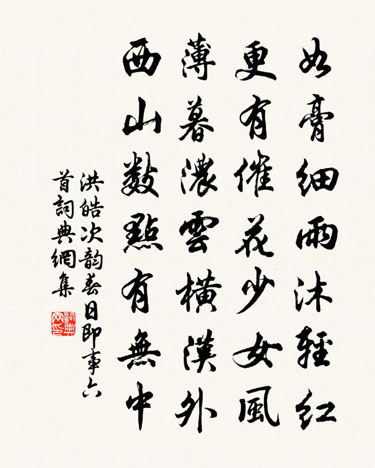 詩詞名句歷史字典書法欣賞書法字典國語詞典說文解字康熙字典古漢語字典標 題 作 者 詩 句 次韻春日即事六首作者:洪皓 朝代:宋代次韻春日即事六首原文如膏細雨沐輕紅,更有催花少女風。薄暮濃雲橫漢外,西山數點有無中。詩詞問答問:次韻春日即事六首的作者是誰?答:洪皓問:次韻春日即事六首寫於哪個朝代?答:宋代洪皓次韻春日即事六首書法欣賞次韻春日即事六首書法作品詩詞推薦點絳唇曹勛〔宋代〕石洞清寒,柳煙吹散松風靜。日華光映。翠水環雲徑。道境多閒,不是人間景。談清淨。道師歌詠。花轉雲房影。客夜不寐四首陳造〔宋代〕清樽黃卷交期絕,芋火前頭老懶殘。賴有平生短檠在,一燈明滅伴更闌。題曾氏山園十一詠梅沼張栻〔宋代〕寒梅只自芳,野水有餘清。山空歲雲暮,妙意相發明。和提刑千葉梅韓維〔宋代〕擢玉自成超俗格,施朱不學入時妝。莫將羅幕輕遮護,從放樽前自在香。餞劉恭父二首徐元傑〔宋代〕割鐙難留乘馬東,花枝爭看裊長紅。袞衣空使斯民戀,綠竹誰歌入相同。訴衷情(春情)仲殊〔宋代〕楚江南岸小青樓。樓前人艤舟。別來後庭花晚,花上夢悠悠。山不斷,水空流,謾凝眸。建康宮殿,燕子來時,多送韓子華歐陽修〔宋代〕嗟我久不見韓子,如讀古書思古人。忽然相逢又數日,笑語反不共一樽。諫垣屍居職業廢,朝事汲汲勞精神。子華早行孔文仲〔宋代〕客興謂已旦,出視見落月。瘦馬入荒陂,霜花重如雪。海風吹萬里,兩耳凍幾脫。歲晏已苦寒,近北尤凜洌。況當送嚴明府入關謁黎京兆皎然〔唐代〕春日異秋風,何為怨別同。潮回芳渚沒,花落晝山空。旅候聞嘶馬,殘陽望斷鴻。應思右內史,相見直城中。留藍溪驛羅時用〔宋代〕寂寥孤館白日靜,酣睡有魔那得降。扣戶故人風動竹,齕萁羸馬浪翻江。飛殘蝙蝠燈留壁,啼盡棲鴉日到窗。堪笑秋日汴河客舍酬友人(一作汴州客舍有酬)羅隱〔唐代〕梁宋追游早歲同,偶然違別事皆空。年如流水催何急,道似危途動即窮。醉舞且欣連夜月,狂吟還聚上樓風。煩君刑曹再賦二絕句彌佳不得不報晁說之〔宋代〕不肯將身入八關,判司雖屈勝如閒。漢庭富貴人何限,畢竟文章屬小山。冬晚對雪憶胡處士王邵〔唐代〕寒更傳唱晚,清鏡覽衰顏。隔牖風驚竹,開簾雪滿山。灑空深巷靜,積素廣庭閒。借問袁安舍,翛然尚閉關。故端明尚書汪公輓詞二首韓元吉〔宋代〕未冠登華選,高文動漢廷。持身嚴榘席,慮世炳丹青。庶府咨沿革,諸儒風典型。空嗟廊廟略,不上鼎彝銘。和胡鼓院郊台致齋即事楊簡〔宋代〕聯篇傑作大音稀,雲朵低垂向巧枝。鈍學久嗟人去嗟,痴腸一任句來遲。斷無錦向詩中織,俁有春從筆底滋。盡日追和老杜江上王之道〔宋代〕獨坐日將夕,淒淒風雨秋。寒燈照孤屋,欹榻擁疏裘。身世槐安國,功名蜃化樓。歸歟老居士,蹤跡繼浮休。居室姜特立〔宋代〕居室要須存野意,不求輪奐炳丹青。王侯第宅他崇貴,麋鹿山林我性靈。點絳唇 呈絡濱、筠溪二老張元乾〔宋代〕清夜沉沉,暗蛩啼處檐花落。乍驚簾幕,香繞屏山角。堪恨歸鴻,情似秋雲薄。書難托,盡交寂寞,忘了前時約。緣識宋太宗〔宋代〕崑崙山上玉樓前。五色祥光混紫煙。景物不同人世界,群仙時醉臥花眠。瀟湘八景詩江天暮雪張經〔宋代〕江上雪紛紛,風寒天已暮。中有泛舟人,興盡迷歸路。名句推薦笑指吾廬何處是?一池荷葉小橋橫。陳繼儒《浣溪沙·初夏夜飲歸》 淚濕羅巾夢不成,夜深前殿按歌聲。白居易《後宮詞》 從心所欲,不逾矩。孔子弟子《論語·為政篇》 好問則裕,自用則小佚名《尚書·商書·仲虺之誥》 從善如登,從惡如崩司馬光《資治通鑑·魏紀·魏紀三》 處富貴之地,要知貧賤的痛癢;當少壯之時,須念衰老的辛酸。洪應明《菜根譚·概論》 北風捲地白草折,胡天八月即飛雪。岑參《白雪歌送武判官歸京》 隔座送鉤春酒暖,分曹射覆蠟燈紅。李商隱《無題·昨夜星辰昨夜風》 自奉必須儉約,宴客切勿流連。朱柏廬《朱子家訓·全文》 金槳木蘭船,戲采江南蓮。劉孝威《採蓮曲·金槳木蘭船》