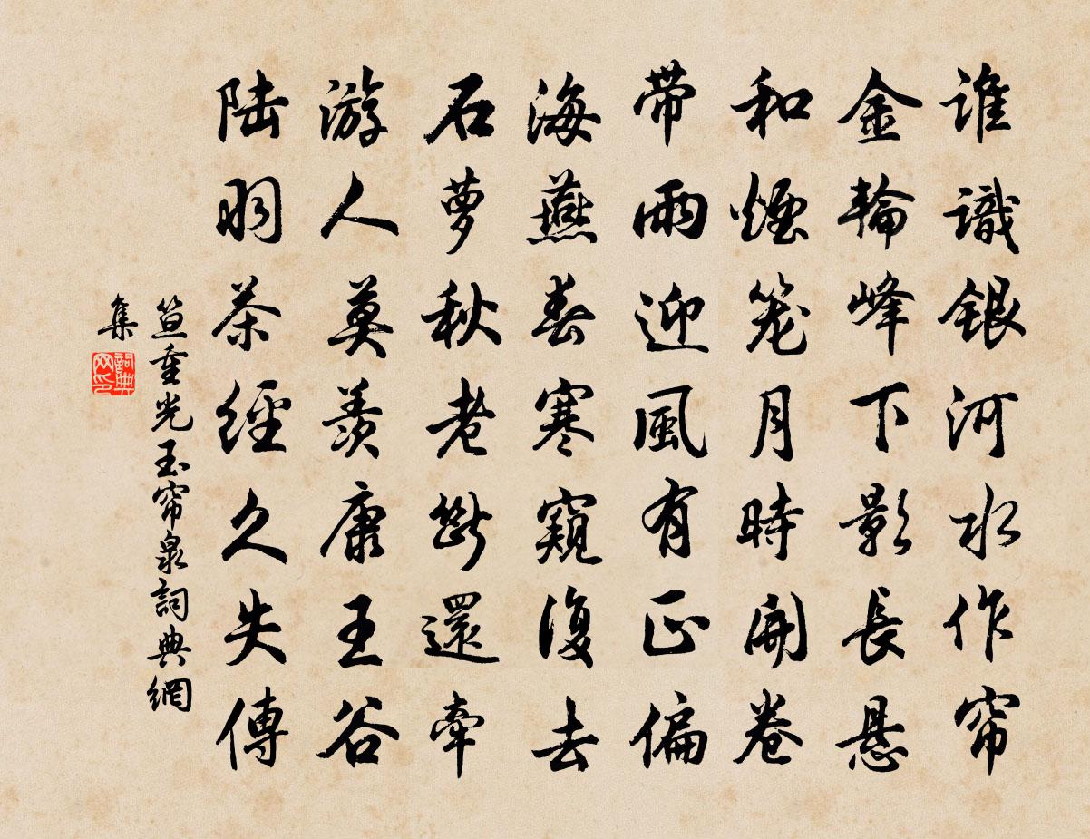 詩詞名句歷史字典書法欣賞書法字典國語詞典說文解字康熙字典古漢語字典標 題 作 者 詩 句 玉簾泉作者:笪重光 朝代:清代玉簾泉原文誰識銀河水作簾,金輪峰下影長懸。和煙籠月時開卷,帶雨迎風有正偏。海燕春寒窺復去,石蘿秋老斷還牽。遊人莫羨康王谷,陸羽茶經久失傳。詩詞問答問:玉簾泉的作者是誰?答:笪重光問:玉簾泉寫於哪個朝代?答:清代笪重光玉簾泉書法欣賞玉簾泉書法作品詩詞推薦次韻陽行先游招隱蘇頌〔宋代〕古屋蕭森數十間,禪扉幽寂叩常關。少微處士遺塵遠,靈鷲高僧得地間。穿石到池泉滴滴,磨崖生蘚字斑斑。山林頌古十四首雙林入滅釋可湘〔宋代〕覆水難收滿竺峰,如何臨死更摩胸。說無說有成生滅,並付春風一夢中。送徐仲洪尉南安八首彭龜年〔宋代〕手弓皆是虎狼才,巡徼寧無去復來。倏去倏來無滯跡,蝗螟雖過不為災。送徐棲霞周真一〔宋代〕顧我慚稱十高士,與君同是兩閒人。君今獨向名山去,說與歸雲我問津。次弟觀為陳子得納婦別李親家陳著〔宋代〕馬頭姻締熱相尋,誰識清交舊紱簪。澤底李無門望態,村中陳有世婚心。別來得見百罹後,坐到忘言兩意深。醉里踏雲行 師父贈譚仙詞曰,張公吃酒李公來,馬鈺〔元代〕豁豁洋洋,詳詳審審。仙家出語何須恁。山侗自揣一鰲,金鱗晃日如新錦。雲水逍遙,身心恣任。欲為上士相爭甚舍北閒望作六字絕句陸游〔宋代〕潘岳一篇秋興,李成八幅寒林。舍北偶然倚杖,盡見古人用心。綺羅香(席間代人賦情)張炎〔宋代〕候館深燈,遼天斷羽,近日音書疑絕。轉眼傷心,慵看剩歌殘闋。才忘了、還著思量,待去也、怎禁離別。恨只恨華亭百詠西林許尚〔宋代〕林外初晴後,斜陽滿芰荷。頻來指靈鷲,此去路無多。句程大昌〔宋代〕有底滑稽堪羨處,金蓮燭里話窮酸。問法釋雲岫〔宋代〕乾陀國裹舊城河,遙憶河邊棗樹花。白象系來年代遠,榮枯今日事如何。歲暮道情二首白居易〔唐代〕壯日苦曾驚歲月,長年都不惜光陰。為學空門平等法,先齊老少死生心。半舊青衫半白頭,雪風吹面上江樓。禪功題道夫東征錄釋寶曇〔宋代〕老來氣味覺深穩,餘子但知聲擊撞。煙雲合千態萬狀,意氣吞五湖三江。如聞日觀眇天下,俯視坎井非吾邦。丈夫將離宣城寄吳正仲梅堯臣〔宋代〕吳均花詩語多奇花揭,苦倩花鴛鴦謝明花月。昭亭川上此禽閒,為寄吳郎我西發。西歸千里浮輕舟,夜觀蟾光逆水金剛隨機無盡頌知見不生分第三十一釋印肅〔宋代〕真如實不如,萬法了無依。鍾中無鼓響,不墮往來機。春望張耒〔宋代〕鳥去晴雲外,帆歸芳草邊。平淮分綠野,春樹接低天。殘枾寒余燒,新青雨後田。年來千里目,容易淚雙懸。龜山崇壽院陳岩〔宋代〕白雲起處著招提,一嶺嵯峨眾嶺低。多少山間好風景,人來先看蔣公題。賣花聲·立春黃景仁〔清代〕獨飲對辛盤,愁上眉彎。樓窗今夜且休關。前度落紅流到海,燕子銜還。書貼更簪歡,舊例都刪。到時風雪滿千山浣溪沙(和陳相之題煙波圖)周紫芝〔宋代〕水上鳴榔不繫船。醉來深閉短篷眠。潮生潮落自年年。一尺鱸魚新活計,半蓑煙雨舊衣冠。廟堂空有畫圖看。自贊慶成長老請釋子益〔宋代〕怡山頂不露,上有通天竅。事事總不知,虛明肯自照。個樣{三若}苴川僧,如何描邈得就。慶成訐露人前,早是名句推薦四寸之管無當,必不滿也。授官、予爵、出祿不以功,是無當也。商鞅《商君書·靳令》 望時而待之,孰與應時而使之。荀子《荀子·天論》 今年元夜時,月與燈依舊。歐陽修《生查子·元夕》 地白風色寒,雪花大如手。李白《嘲王歷陽不肯飲酒》 樓前綠暗分攜路,一絲柳、一寸柔情。吳文英《風入松·聽風聽雨過清明》 嘆年光過盡,功名未立,書生老去,機會方來。劉克莊《沁園春·夢孚若》 讀書好處心先覺,立雪深時道已傳。袁枚《隨園詩話·卷三》 去年米貴闕軍食,今年米賤大傷農。杜甫《歲晏行》 明月出天山,蒼茫雲海間。李白《關山月》 樓倚霜樹外,鏡天無一毫。杜牧《長安秋望》