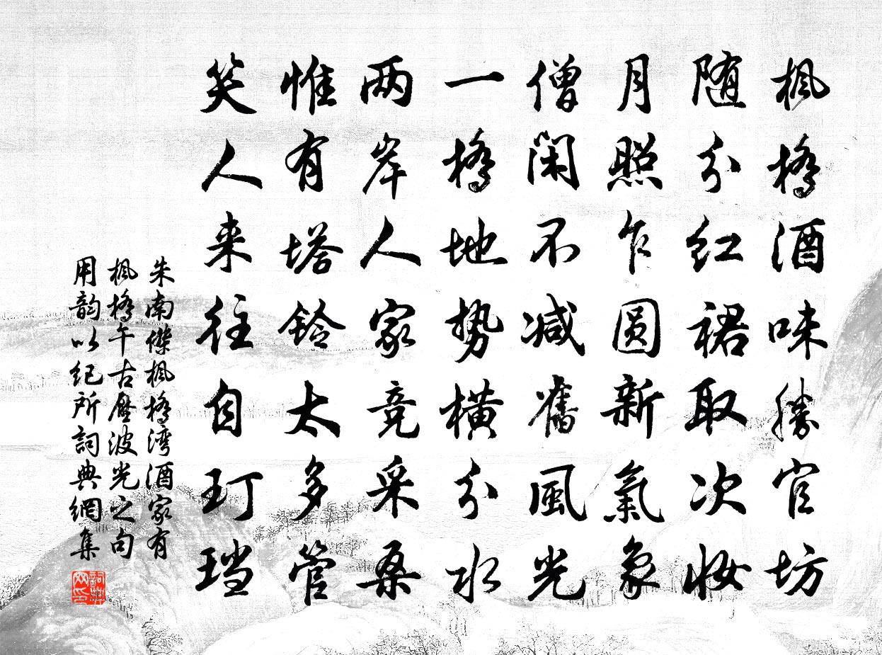 詩詞名句歷史字典書法欣賞書法字典國語詞典說文解字康熙字典古漢語字典標 題 作 者 詩 句 楓橋灣酒家有楓橋午古壓波光之句用韻以紀所作者:朱南傑 朝代:宋代原文楓橋酒味勝官坊,隨分紅裙取次妝。月照乍圓新氣象,僧閒不減舊風光。一橋地勢橫分水,兩岸人家競採桑。惟有塔鈴太多管,笑人來往自玎璫。詩詞問答問:《楓橋灣酒家有楓橋午古壓波光之句用韻以紀所》的作者是誰?答:朱南傑問:該詩寫於哪個朝代?答:宋代書法欣賞楓橋灣酒家有楓橋午古壓波光之句用韻以紀所書法作品詩文賞析【原題】:楓橋灣酒家有楓橋午古壓波光之句用韻以紀所見詩詞推薦途次大梁雪中奉天平令狐相公書問兼…形於短篇以申仰謝劉禹錫〔唐代〕遠守宦情薄,故人書信來。共曾花下別,今獨雪中回。紙尾得新什,眉頭還暫開。此時同雁鶩,池上一徘徊。句蘇泂〔宋代〕更無人為作招魂。峽山寺張士遜〔宋代〕峽寺一停橈,新秋暑乍消。幽懷徒易釋,肥遁固難招。翠擬千峰活,紅分數葉凋。優遊虛歲月,何以報清朝。句吳光〔宋代〕笛弄一聲橫釣艇,月明千里上層樓。上知府石太尉二首魏野〔宋代〕陝城天險枕河湄,茆土真風勝暫知。雲霧雖頻沾虎節,雪霜全未染虬髭。白霓放作軍中練,紅袖行為帳下旗。公暇嘉禾百詠馬塘涇張堯同〔宋代〕疑著風波惡,民謠亦畏人。築塘成堰後,斬馬祭河神。題蔡氏叢桂堂魏了翁〔宋代〕誰銜鷲峰種,托根蔡氏堂。勿夸郄林枝,未說燕山芳。君看湘江上,千載留晶光。但當護根本,歲晚搴幽香。頌古十一首釋智鑒〔宋代〕土面灰頭不染塵,華街柳巷樂天真。金雞唱曉瓊樓夢,一樹華開浩劫春。宮詞王珪〔唐代〕夜深獨倚欄乾角,玉笛橫吹弄月明。餘響度雲無處覓,人間聞得兩三聲。望太華贈盧司倉陶翰〔唐代〕行吏到西華,乃觀三峰壯。削成元氣中,傑出天河上。如有飛動色,不知青冥狀。巨靈安在哉,厥跡猶可望。方此賀新郎黃人傑〔宋代〕曉色收梅雨。玉衡高、寒杓插午,月生銀浦。一片祥光橫碧落,幻出新晴院宇。擁閬苑、擎香天女。簇引飛仙來瑞東歸留別幕中同舍孫應時〔宋代〕相從樂復樂,別離良獨難。傳觴秉明燭,起舞清夜闌。一醉何足辭,百年能幾歡。後會渺何許,相思江月寒。再因公事到駱口驛白居易〔唐代〕今年到時夏雲白,去年來時秋樹紅。兩度見山心有愧,皆因王事到山中。徑山出鄉舟中寄二偈示眾釋鹹傑〔宋代〕三冬水上打鞦韆,百尺竿頭棹釣船。寄語滿堂龍象眾,無勞掘地覓青天。點絳唇·醉漾輕舟秦觀〔宋代〕醉漾輕舟,信流引到花深處。塵緣相誤,無計花間住。煙水茫茫,千里斜陽暮。山無數,亂紅如雨,不記來時路。它山樓鑰〔宋代〕素霓橫臥作雷吼,日射細鱗銀雪光。安得此身如白鷺,修然終日在梅梁。菩薩蠻·柳花飛處鶯聲急牛嶠〔唐代〕柳花飛處鶯聲急,晴街春色香車立。金鳳小簾開,臉波和恨來。今宵求夢想,難到青樓上。贏得一場愁,鴛衾誰並孟子天民陳普〔宋代〕皇天賦予各成形,萬理兼該備自身。所謂天民非有別,能全所賦以為人。夏旱四首劉克莊〔宋代〕吾聞曲禮當凶歲,諸大夫安敢食粱。婢臛香芹羹過美,水車聲畔不能嘗。寄績溪陳明府張喬〔唐代〕古邑猿聲里,空城只半存。岸移無舊路,沙漲別成村。鼓角喧京口,江山盡汝濆。六朝興廢地,行子一銷魂。名句推薦今夕復何夕,共此燈燭光。杜甫《贈衛八處士》 織女牽牛送夕陽,臨看不覺鵲橋長。德容《七夕二首·其二》 修竹傍林開,喬松倚岩列。德隱《新秋晚眺》 近重陽、偏多風雨,絕憐此日暄明。姚雲文《紫萸香慢·近重陽》 我軍青坂在東門,天寒飲馬太白窟。杜甫《悲青坂》 女也不爽,士貳其行。士也罔極,二三其德。佚名《氓》 茶之筍者,竽爛石沃土,長四、五寸,若薇蕨始抽,凌露采焉。陸羽《茶經·三之造》 畫圖恰似歸家夢,千里河山寸許長。辛棄疾《鷓鴣天·送元濟之歸豫章》 傷情處,高城望斷,燈火已黃昏。秦觀《滿庭芳·山抹微雲》 錦帶吳鉤,征思橫雁水。吳文英《荔枝香近·送人游南徐》