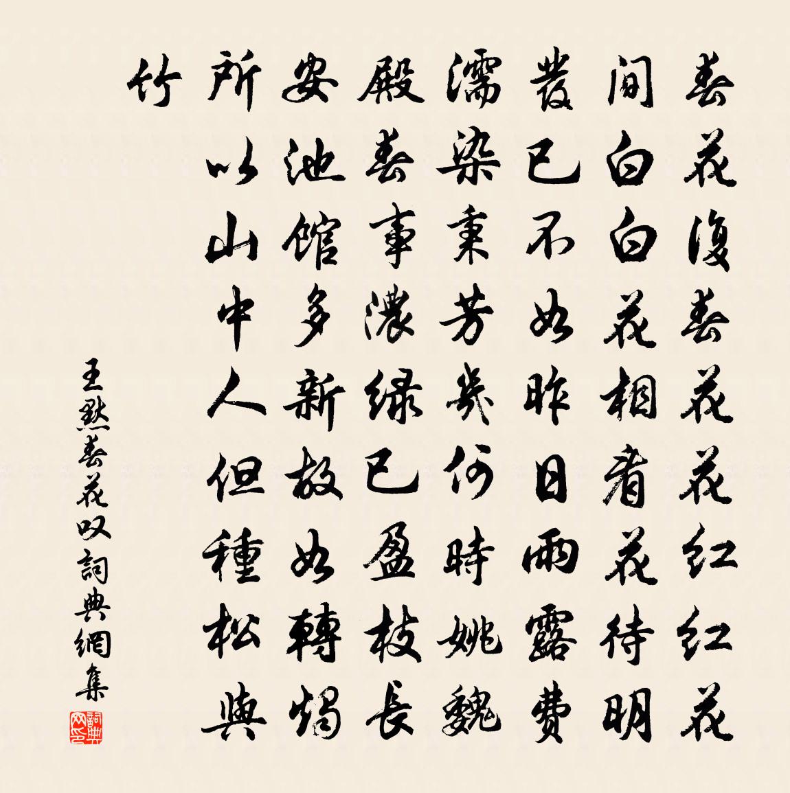 詩詞名句歷史字典書法欣賞書法字典國語詞典說文解字康熙字典古漢語字典標 題 作 者 詩 句 春花嘆作者:王默 朝代:宋代春花嘆原文春花復春花花,紅紅花間白白花。相看花待明發,已不如昨日。雨露費濡染,秉芳幾何時。姚魏殿春事,濃綠已盈枝。長安池館多,新故如轉燭。所以山中人,但種松與竹。詩詞問答問:春花嘆的作者是誰?答:王默問:春花嘆寫於哪個朝代?答:宋代王默春花嘆書法欣賞春花嘆書法作品詩詞推薦挽故楊叔強承事詞郭印〔宋代〕家事毋關我,心君日日休。陰功歸子息,賢德視交遊。彝鼎千年古,圖書一室幽。榮封胡不早,只許到郊丘。偈頌一百二十三首釋崇岳〔宋代〕五月端午,薦福直舉不會,諸方書符呪土。風從虎兮雲從龍,千妖百怪自潛蹤。登樓絕句和者甚多又從而用韻擇其可錄者錄之戴復古〔宋代〕小樓題了又還題,一段風流在水西。白鳥飛來知鄉背,青山元自有高低。寓蓬萊館陸游〔宋代〕朱門高柳畫橋南,掠面風埃喜解驂。霽日偶逢春盎盎,野人不慣屋潭潭。堂中剩喜簪裾集,樓上時聞鼓角酣。明發賀昭國從叔員外轉本曹郎中李洞〔唐代〕苔砌塔陰濃,朝回尚叫蛩。粟征山縣欠,官轉水曹重。燈照樓中雨,書求海上峰。詩家無驟顯,一一古人蹤。答李成季李復〔宋代〕出川錯莫不逢春,京洛空多滿馬塵。李渤請歸聊見志,魯褒著論久知神。懷沙曾愧垂綸客,擊磬興嗟荷蕢人。向老昨日侍巾缽飯於天寧蒙示佳什謹次韻陳與義〔宋代〕朱門未知禪悅義,富不期奢奢自至。二韮雖寒故是公,萬羊賈禍徒封衛。我公居塵不染塵,便隨一缽遺甘辛。出家西江月(秋香閣)曹冠〔宋代〕仙掌初零玉露,清商乍肅金飈。迴環高閣桂香飄。元自廣寒移到。絳蠟銀蟾輝映,綸巾鶴氅逍遙。賞心樂事醉良宵客觀余孝經感測而有作張九成〔宋代〕古人文瑩理,後人工作文。文工理愈暗,紙札何紛紛。君看六藝學,天葩吐奇芬。詩書分體制,禮樂造乾坤。千歧睡覺偶吟白居易〔唐代〕官初罷後歸來夜,天欲明前睡覺時。起坐思量更無事,身心安樂復誰知?學詩吟十首方回〔宋代〕我愛真西山,讀書有甲記。首論天命性,豈可不論氣。我愛魏鶴山,周易輯集義。濂洛十七家,一貫六十四。有寂鄭轂補闕山松張蠙〔唐代〕心將積雪欺,根與白雲離。遠寄僧猶憶,高看鶴未知。影交新長葉,皴匝舊生枝。多少同時種,深山不得移。半山寺三首楊萬里〔宋代〕霜松雪竹老重尋,南盪東陂水自深。鳳去宅存誰與住,不如作寺免傷心。春日郊外王珪〔唐代〕十里煙郊書景和,春間流水綠生波。樓前人意望無盡,柳上風光來最多。雨歇隴雲猶漭瀁,草薰村燕自經過。匆匆頌十玄談心印釋印肅〔宋代〕呼為心印早虛言,滿目真如自現交。十二時中無不應,金鶯頻道柳含煙。沖虛宮陸游〔宋代〕林館松門白晝扃,驂鸞人去已千齡。基存舊宅樓台古,地有遺丹草木靈。滿洞曉雲春釀雨,一池秋水夜涵星。 * 贈暹侄蘇泂〔宋代〕祖世青氈遠,關門鬢欲絲。猶欣諸子侄,愛覓老夫詩。貧賤端由此,文章安用為。勉哉勤所業,須有中興時。和三四弟韻方岳〔宋代〕清明乍佳游,適與元巳並。但有松葉醪,寧須杏花餳。漁逢半篙綠,煙雨涵幽情。緬懷蘭亭人,高冢亦已平。空餘黃葵蘇軾〔宋代〕弱質困夏永,奇姿蘇曉涼。低昂黃金杯,照耀初日光。檀心自成暈,翠葉森有芒。古來寫生人,妙絕誰似昌。晨妝將別巫峽,贈南卿兄瀼西果園四十畝杜甫〔唐代〕苔竹素所好,萍蓬無定居。遠遊長兒子,幾地別林廬。雜蕊紅相對,他時錦不如。具舟將出峽,巡圃念攜鋤。正月名句推薦淡中交耐久,靜里壽延長。王永彬《圍爐夜話·第一一六則》 冷冷水向橋東去。漠漠雲歸溪上住。劉鎮《玉樓春·東山探梅》 以身教者從,以言教者訟。范曄《後漢書·列傳·第五鍾離宋寒列傳》 寒更承夜永,涼夕向秋澄。駱賓王《送別》 良藥苦口利於病,忠言逆耳利於行。宋濂、王褘《元史·列傳·卷五十五》 玉露凋傷楓樹林,巫山巫峽氣蕭森杜甫《秋興八首·其一》 酒已都醒,如何消夜永!周邦彥《關河令·秋陰時晴漸向暝》 思婦高樓上,當窗應未眠。徐陵《關山月》 寒蟬鳴處,回首斜陽暮。趙彥端《點絳唇·途中逢管倅》 人生天地間,忽如遠行客。佚名《青青陵上柏》