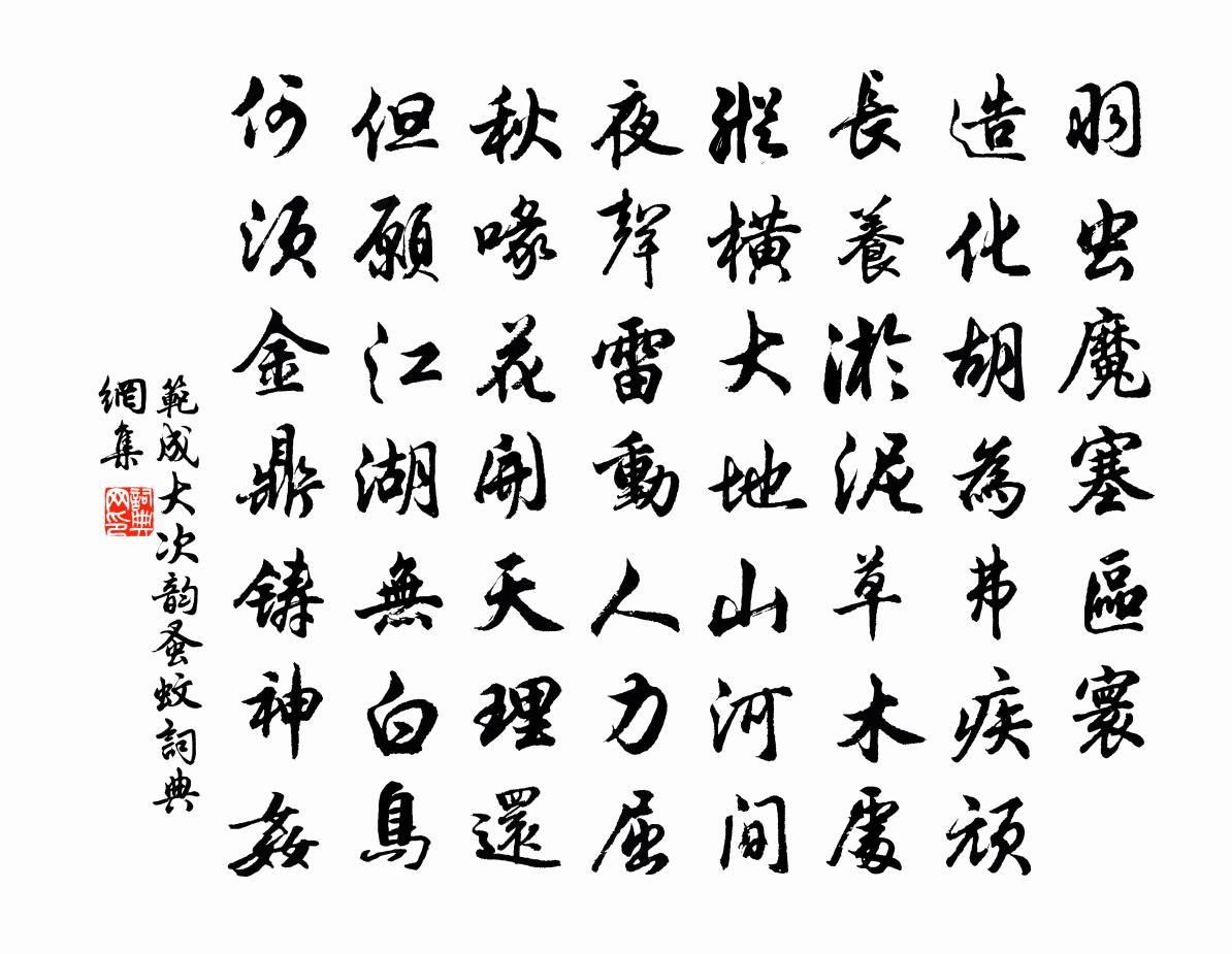 詩詞名句歷史字典書法欣賞書法字典國語詞典說文解字康熙字典古漢語字典標 題 作 者 詩 句 次韻蚤蚊作者:范成大 朝代:宋代次韻蚤蚊原文羽蟲ㄠ魔塞區寰,造化胡為弗疾頑。長養淤泥草木處,縱橫大地山河間。夜聲雷動人力屈,秋喙花開天理還。但願江湖無白鳥,何須金鼎鑄神奸?詩詞問答問:次韻蚤蚊的作者是誰?答:范成大問:次韻蚤蚊寫於哪個朝代?答:宋代問:范成大的名句有哪些?答:范成大名句大全范成大次韻蚤蚊書法欣賞次韻蚤蚊書法作品詩詞推薦題家信後高選〔宋代〕十載殷勤訓子情,禮闈今幸占微名。彤庭策獻三千字,鵬海風摶九萬程。帽插宮花瓊宴罷,身沾仙露賜衣榮。瞻雲乙酉歲自蜀隨計趁試不及李洞〔唐代〕客臥涪江蘸月廳,知音喚起進趨生。寒梅折後方離蜀,臘月圓前未到京。風卷壞亭羸仆病,雪糊危棧蹇驢行。文昌再和雪韻鄭清之〔宋代〕司冬已窮造父力,寒機墮指曉猶織。長安貴人金屋嬌,琉璃屏下方偃息。穿窗入幕兒女笑,喚作楊花元不識。明珠龜堂一隅開窗設榻為小憩之地陸游〔宋代〕栟櫚薝蔔障斜陽,旋置臨階八尺床。小展窗扉無大費,略加苫蓋有餘涼。老來愈覺歲時速,夢裹不知途路長。試問詠史·五都矜財雄鮑照〔南北朝〕五都矜財雄,三川養聲利。百金不市死,明經有高位。京城十二衢,飛甍各鱗次。仕子彯華纓,遊客竦輕轡。明星蝶戀花歐陽修〔宋代〕一掬天和金粉膩。蓮子心中,自有深深意。意密蓮深秋正媚。將花寄恨無人會。橋上少年橋下水。小棹歸時,不語偈頌五十一首釋道沖〔宋代〕古釋迦不先,今彌勒不後。禮拜燒香一線通,從教笑破衲僧口。既絕湖得順風頃刻已見弁山二首趙蕃〔宋代〕五日陰霾鬭不開,步行湖觜看帆來。只言命有窮年厄,豈料風能今日回。自是人心分順逆,枉於造物示嫌猜。篷窗別皖口王安石〔宋代〕浮煙漠漠細沙平,飛雨濺濺嫩水生。異日不知來照影,更添華發幾千莖。游精思題觀主山房孟浩然〔唐代〕誤入桃源里,初憐竹逕深。方知仙子宅,未有世人尋。舞鶴過閒砌,飛猿嘯密林。漸通玄妙理,深得坐忘心。送智齊師出峽王灼〔宋代〕齊師成都來,春風掀竹笠。自雲十五年,參學事未畢。得錢買小舟,湖南尋佛日。胸中有此老,如飯不下嗌。誓竭無題三首陳造〔宋代〕浪出嗟何補,歸來樂有餘。山川付不借,天地托蘧廬。酒熟聊呼客,鉤垂不在魚。平生棲遁意,政用蓋迂疎。秋日溪上徐寶之〔宋代〕行盡苔階碧甃長,早秋風味入思量。蕙香半在空堂夢,荷雨多於別岸涼。獨夜玉弦知寂寞,舊愁湘月記微茫。採江泰伯廟迎享送神辭三章龔頤正〔宋代〕車兮載旃,舟兮揚帆,鼓咽咽兮君當還。君肯來兮尚盤桓,我心煢煢兮其無端,君不我留兮下土囂煩。福我吳人兮賦未見君子憂心靡樂八韻寄李載黃庭堅〔宋代〕紛紛車馬客,如集市人博。彼雖有求來,我但快一噱。忽逢堳學子,時亦撼關鑰。何當攜手期,濠上得魚樂。踏莎行 詠宦途無定王哲〔元代〕名路求高,宦途無定。一來一去緣心性。稍知分守得優遊,能通止足參賢聖。莫使偏頗,須存直正。花開須是依時嘉樹韓維〔宋代〕殘芳不入眼,愛此嘉樹秀。青雲重欲垂,翠幄遠相鬥。輕涼迎早夏,繁影亂清晝。茲日更徘徊,聊攜一樽酒。鄰園花成欲具旬會病未果二首王洋〔宋代〕矯春意謂已堅牢,次第千林散錦袍。恐有天魔妒妍好,遽連風雨作粗豪。偈頌十七首釋師範〔宋代〕舊歲即新歲,新年即舊年。要知新歲歲,元是舊年年。次徐徑坂衡陽使君韻示林敬則趙汝騰〔宋代〕千分岡頭一振衣,共嗟鳳德臥郊扉。近鋤蕭艾知天意,會見朝陽露欲晞。名句推薦誠知此恨人人有,貧賤夫妻百事哀。元稹《遣悲懷三首·其二》 國將興,必貴師而重傅,貴師而重傅,則法度存。荀子《荀子·大略》 舊時王謝堂前燕,飛入尋常百姓家。劉禹錫《烏衣巷》 蘭生幽谷,不為莫服而不芳。舟在江海,不為莫乘而不浮。君子行義,不為莫知而止休。劉安及其門客《淮南子·說山訓》 幸非一人,專固害。來俊臣《羅織經·治下卷第三》 才過清明,漸覺傷春暮。李冠《蝶戀花·春暮》 輕輕飛動,把賣花人搧過橋東王和卿《醉中天·詠大蝴蝶》 遙看孟津河,楊柳郁婆娑。佚名《折楊柳歌辭五首》 不覺碧山暮,秋雲暗幾重。李白《聽蜀僧濬彈琴 / 聽蜀僧浚彈琴》 先拂商弦后角羽,四郊秋葉驚摵摵。李頎《聽董大彈胡笳聲兼寄語弄房給事》