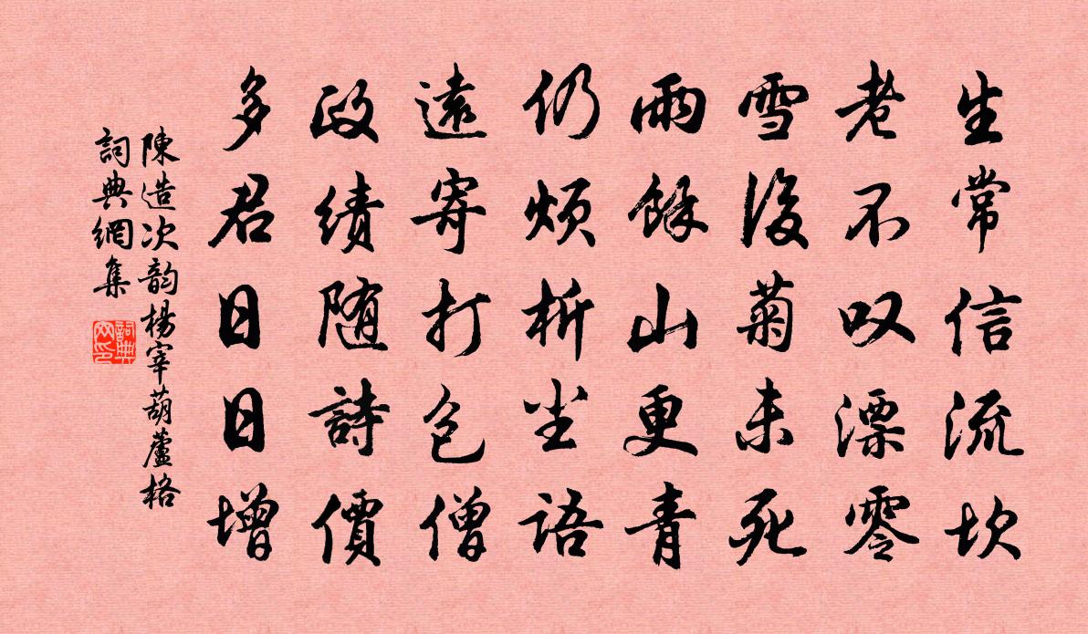 詩詞名句歷史字典書法欣賞書法字典國語詞典說文解字康熙字典古漢語字典標 題 作 者 詩 句 次韻楊宰葫蘆格作者:陳造 朝代:宋代次韻楊宰葫蘆格原文生常信流坎,老不嘆漂零。雪後菊未死,雨餘山更青。仍煩析塵語,遠寄打包僧。政績隨詩價,多君日日增。詩詞問答問:次韻楊宰葫蘆格的作者是誰?答:陳造問:次韻楊宰葫蘆格寫於哪個朝代?答:宋代陳造次韻楊宰葫蘆格書法欣賞次韻楊宰葫蘆格書法作品詩詞推薦信國魯夫人輓詩二首陳元晉〔宋代〕曾是王珪坐上人,孰知孟母德無鄰。長懷就養板輿日,一笑能回縣春天。詩感棘風知痛苦,歌翻薤露亦酸辛。送車呈何縣丞趙蕃〔宋代〕古屋無多客掛包,占風政類鳥居巢。誰能故賦感不遇,亦莫空書廣絕交。開闔屢搖塵戶牡,{戛中加冖}磨時裊竹寄西山勤道人林逋〔宋代〕天竺山深桂子丹,白猿啼在白雲間。死生不出千門事,坐臥無如一室閒。誰伴錫痕過寂歷,自憑茶色對孱顏。忘機飯西湖兜率寺袁說友〔宋代〕風爐煮餅梵王家,一日平湖十里賒。遊子政須供杖屨,老僧應有痼煙霞。絕知咳唾新珠玉,想見冰霜繞齒牙。我恨書謝文靖東山圖王銍〔宋代〕山如出繭眉,溪似縈風帶。雅意樂溪山,安用攜粉黛。煙雲無定姿,姝麗有真態。謝公經世心,遇物何顯晦。鐘鼎題練省元壁華岳〔宋代〕腳債嗟猶欠,心朋喜偶逢。溪聲含客怒,山色為誰濃。古樹晴搖蓋,殘蟬晚帶鍾。莫辭一樽酒,明日是吳儂。贈防江卒六首 其二劉克莊〔宋代〕壯士如駒出渥窪,死眠牖下等蟲沙。老儒細為兒郎說,名將皆因戰起家。贈定上人趙汝鐩〔宋代〕談禪皆是病,參請不須忙。且看諸尊宿,相傳甚藥方。不顯名大檀越請偈釋慧遠〔宋代〕單提直指若為參,貝葉靈文滿寶函。無我無人無壽者,塵塵剎剎是瞿曇。離京留題蔣店姚勉〔宋代〕合門傳旨放朝參,歸覲親庭曉整驂。葵藿丹心猶戀戀,五雲繚繞望宮南。鳳棲梧馬鈺〔元代〕物外逍遙修九九。慕樂清貧,寂淨無中有。不謁侯門常內守。脫離天地人三彀。子午門封真卯酉。 * 青龍,對鳳初冬快晴陪宣卿叔夏遊石頭庵過三生藏窮深極胡寅〔宋代〕仰止春風潑黛山,亦應秋色兩難攀。祗嫌痼疾煙霞上,且愛陶鎔水石間。詩品二十四則。雄渾司空圖〔唐代〕大用外腓,真體內充。返虛入渾,積健為雄。具備萬物,橫絕太空。荒荒油雲,寥寥長風。超以象外,得其環中。雨小人相凌王洋〔宋代〕負擔相隨笑同,不分強習弱便相攻。若無三尺齊民律,曠野何人是長雄。採桑曲閻爾梅〔清代〕種桑人家十之九,連綠不斷陰千畝。年年相戒桑熟時,畏人盜桑晨暮守。前年災水去年旱,私債官租如火鍛。今春句錢惟濟〔宋代〕庭下焚香連宿霧,林間鳴佩起棲鸞。題雲峰齊雲閣示住山思達二絕胡寅〔宋代〕舒捲高低晴復陰,澹然無滓亦無心。不知底處相齊得,且倚危欄一散襟。洗然弟竹亭孟浩然〔唐代〕吾與二三子,平生結交深。俱懷鴻鵠志,昔有鶺鴒心。逸氣假毫翰,清風在竹林。達是酒中趣,琴上偶然音。雪天元稹〔唐代〕故鄉千里夢,往事萬重悲。小雪沉陰夜,閒窗老病時。獨聞歸去雁,偏詠別來詩。慚愧紅妝女,頻驚兩鬢絲。至後承元煇見和複次韻書病中近況十首方回〔宋代〕曾被卑辭誤,吾嘗笑綺園。共欺蛇帝醉,不保橘奴根。病起晴冰破,禪悠凍石溫。向來腐餘夢,拂拭了無痕。名句推薦籬落疏疏一徑深,樹頭花落未成陰。楊萬里《宿新市徐公店》 寒泉貯、紺壺漸暖,年事對、青燈驚換了。吳文英《花犯·謝黃復庵除夜寄古梅枝》 是以知天欲人相愛相利,而不欲人相惡相賊。墨子《墨子·04章 法儀》 日落波平。愁損辭鄉去國人。朱敦儒《採桑子·彭浪磯》 自與東君作別,剗地無聊。納蘭性德《風流子·秋郊即事》 近重陽、偏多風雨,絕憐此日暄明。姚雲文《紫萸香慢·近重陽》 心生,種種魔生;心滅,種種魔滅。吳承恩《西遊記·第十三回》 望時而待之,孰與應時而使之。荀子《荀子·天論》 脫鞍暫入酒家壚,送君萬里西擊胡岑參《送李副使赴磧西官軍》 曾經滄海難為水,除卻巫山不是雲。元稹《離思五首·其四》