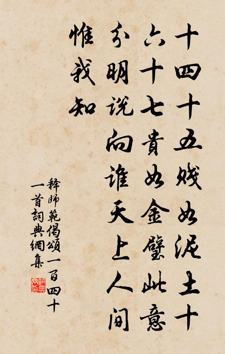 詩詞名句歷史字典書法欣賞書法字典國語詞典說文解字康熙字典古漢語字典標 題 作 者 詩 句 偈頌一百四十一首作者:釋師範 朝代:宋代偈頌一百四十一首原文十四十五,賤如泥土。十六十七,貴如金璧。此意分明說向誰,天上人間惟我知。詩詞問答問:偈頌一百四十一首的作者是誰?答:釋師範問:偈頌一百四十一首寫於哪個朝代?答:宋代釋師範偈頌一百四十一首書法欣賞偈頌一百四十一首書法作品詩詞推薦自嘆三首文天祥〔宋代〕疾病連三次,形容落九分。幾成白宰相,誰識故將軍。暗坐羞紅日,閒眠想白雲。蒼蒼竟何意,未肯喪斯文。秋雨陸游〔宋代〕秋晚兼旬雨,雨晴當有霜。頗思游近縣,亦已戒輕裝。珍鯗披綿美,寒醅撥雪香。菊花常歲有,所喜及重陽。頌魏二翁〔宋代〕我今入山,避此囂煩。衛以卒史,聘以達官。豈易我樂,物外靖閒。養真存氣,七返九還。金丹既就,遂陟仙壇。楊柳枝詞九首劉禹錫〔唐代〕塞北梅花羌笛吹,淮南桂樹小山詞。請君莫奏前朝曲,聽唱新翻楊柳枝。南陌東城春早時,相逢何處不依依?桃紅楊花樓鑰〔宋代〕野芳庭草是生涯,老去只宜閒在家。幾日惜春留不住,小鬟為我拾楊花。送犢鼻褌與任敦夫李新〔宋代〕任翁何為窮,一性共癖左。不妄取芥粒,甘似西山餓。短褐結郭絲,犢鼻詎穿絲破。當時北阮貧,矯枉幾太過。肯題花光梅十首一枝橫出王柏〔宋代〕踏雪尋香幾度吟,吟詩那得似花人。水村雲壑抽身出,月掛疎籬別有春。兀庵釋紹曇〔宋代〕身同枯木倚寒岩,鑠盡玄微沒許般。只麽守些獃怛怛,從教壁倒與籬丹。曉出城東陸游〔宋代〕渺渺長江下估船,亭亭孤塔隱蒼煙。不堪異縣蕭條地,更遇初寒慘澹天。巾褐已成歸有約,簞瓢未足去無緣。包羞孟浩然墓羅隱〔唐代〕數步荒榛接舊蹊,寒江漠漠草淒淒。鹿門黃土無多少,恰到書生冢便低。茭白許景迂〔宋代〕翠葉森森劍有棱,柔條忪甚比輕冰。江湖若借秋風便,好與蓴鱸伴季鷹。西園堂榭落成種植畢工偶成口號十首呈參政張周麟之〔宋代〕小豀深樹鹿呦呦,野鶴無聲蕙帳幽。風月滿亭供笑語,依然不減醉翁游。淨明齋方岳〔宋代〕山徑留雲雨未乾,松聲長共澗聲寒。青鞋莫踏蒼苔破,借與秋崖半日看。桐廬道中楊萬里〔宋代〕肩輿唑睡茶力短,野堠無文山路長。鴉鵲聲歡人不會,枇杷一樹十分黃。論語絕句一百首張九成〔宋代〕仁智從來不可分,動中機向靜中存。自然形體難增損,不要猶添斧鑿痕。題中南佛塔寺溫庭筠〔唐代〕鳴泉隔翠微,千里到柴扉。地勝人無欲,林昏虎有威。澗苔侵客屨,山雪入禪衣。桂樹芳陰在,還期歲晏歸。菩薩蠻陳允平〔宋代〕杏花枝上鶯聲嫩。鳳屏倦倚人初困。金獸莫添香。香濃情轉傷。雲沉歸雁杳。綠漲江南草。獨倚夕陽樓。雙帆何處同沈守勸農十首陳造〔宋代〕沉炷茶鐺且翠微,歸軒何惜小逶迤。晴天璧月今宵好,待得金波泛夜時。詠史詩沛宮胡曾〔唐代〕漢高辛苦事干戈,帝業興隆俊傑多。猶恨四方無壯士,還鄉悲唱大風歌。秋日游昆明池詩江總〔隋代〕靈沼蕭條望。遊人意緒多。終南雲影落。渭北雨聲過。蟬噪金堤柳。鷺飲石鯨波。珠來照似月。織處寫成河。此時名句推薦日暖桑麻光似潑,風來蒿艾氣如薰。蘇軾《浣溪沙·軟草平莎過雨新》 起望衣冠神州路,白日銷殘戰骨。辛棄疾《賀新郎·用前韻送杜叔高》 志不可不高,志不高,則同流合污,無足有為矣王永彬《圍爐夜話·第三十則》 辭之待骨,如體之樹骸;情之含風,猶形之包氣。劉勰《文心雕龍·風骨》 游女帶花偎伴笑,爭窈窕,競折團荷遮晚照。李珣《南鄉子·乘彩舫》 士雖有學,而行為本焉。墨子《墨子·02章 修身》 花徑不曾緣客掃,蓬門今始為君開。杜甫《客至》 乃知兵者是兇器,聖人不得已而用之。李白《戰城南》 待羔兒、酒罷又烹茶,揚州鶴。辛棄疾《滿江紅·和范先之雪》 山驛淒涼,燈昏人獨寢。陸游《清商怨·葭萌驛作》