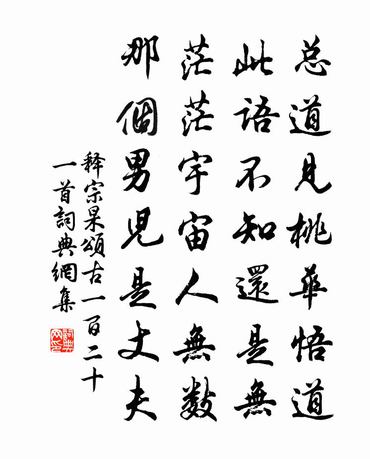 詩詞名句歷史字典書法欣賞書法字典國語詞典說文解字康熙字典古漢語字典標 題 作 者 詩 句 頌古一百二十一首作者:釋宗杲 朝代:宋代頌古一百二十一首原文總道見桃華悟道,此語不知還是無。茫茫宇宙人無數,那個男兒是丈夫。詩詞問答問:頌古一百二十一首的作者是誰?答:釋宗杲問:頌古一百二十一首寫於哪個朝代?答:宋代釋宗杲頌古一百二十一首書法欣賞頌古一百二十一首書法作品詩詞推薦和榮安中二絕王灼〔宋代〕醉來不入少年場,只欲問途何有鄉。耽酒玉川貧徹骨,傾空將鼻觀到糟床。水亭陸游〔宋代〕莫道山翁老病侵,靜中理得舊傳琴。朝來有喜君知否:雨展芭蕉二尺心。感興六首李白〔唐代〕瑤姬天帝女,精彩化朝雲。宛轉入宵夢,無心向楚君。錦衾抱秋月,綺席空蘭芬。茫昧竟誰測,虛傳宋玉文。洛浦和董伯玉不向東山久韻吳芾〔宋代〕我暫出山去,常憂蕙帳空。聞君東山樂,愛君古人風。日暮君不來,碧雲蔽高穹。凌晨戒僮僕,駕言將租東。論語絕句一百首張九成〔宋代〕要之恐懼常修省,乃是吾心所必然。君子如雲止三畏,又何終日卻乾乾。滿庭芳 贈小胡村李姑馬鈺〔元代〕姑姑修煉,聽予重告。先要斷除煩惱。擒捉心猿意馬,休使返倒。如同男兒決裂,莫躊躇、更休草草。速下手,仗松李嶠〔唐代〕鬱郁高岩表,森森幽澗陲。鶴棲君子樹,風拂大夫枝。百尺條陰合,千年蓋影披。歲寒終不改,勁節幸君知。次韻陸務觀送行二首周必大〔宋代〕蓬閣虛生白,蘭台汗殺青。英游迷歲月,神武動風霆。遷擢恩頻忝,黔黎困未醒。空希范蠡去,羞對浙江亭。鵲踏枝/蝶戀花佚名〔宋代〕故里山遙春靄碧。為想繁枝,清夢何曾息。縲帶霜英人不摘。紛紛日暮飄絪席。休抱離腸憑酒力。只有輕紈,依約同陳郎中游南塘金君卿〔宋代〕廣輪三萬里聲明,四海謳歌號太平。恭已愛慈同漢景,息民寬厚似周成。九郊上帝天和應,載饗明堂孝意精。惟有田家 其二華岳〔宋代〕農夫日炙面如煤,絲婦繅成雪一堆。早早安排了官稅,莫教耆長上門催。句處默〔唐代〕太平時節無人看,雪刃閒封滿匣塵。,客意五首陳舜俞〔宋代〕況復淹旅泊,情多秋亦悲。寒雲欲垂野,疏葉不藏梨。斷梗逐流水,歸禽投好枝,徘徊古原上,應有夕陽知。游龍門分題十五首上山歐陽修〔宋代〕躡蹻上高山,探險慕幽賞。初驚澗芳早,忽望岩扉敞。林窮路已迷,但逐樵歌響。山雨何紹基〔清代〕短笠團團避樹枝。初涼天氣野行宜。溪雲到處自相聚,山雨忽來人不知。馬上衣巾任沾濕,村邊瓜豆也離披。新晴秋日田園雜興范成大〔宋代〕探梅公子款柴門,枝北枝南總未春;忽見小桃紅似錦,卻疑儂是武陵人。減字木蘭花王觀〔宋代〕壽星明久。壽曲高歌沉醉後。壽燭榮煌。手把金爐爇壽香。滿斟壽酒。我意殷勤來祝壽。問壽如何。壽比南山福更仙人橋石刻方暹〔宋代〕鄉村十里少人家,手掬清泉嚼細茶。洞口春深卻無酒,故人相贈以桃花。【正宮】小梁州_春夜張可久〔元代〕春夜玉簫吹斷鳳釵分,瘦損真真。小詞空制錦回文,孤眠恨,翠被寶香溫。【麼】故人一去無音信,望蓬萊隔幾重贈鄒德年王洋〔宋代〕短檠三尺照座隅,眵昏兩目頭不梳。丈夫功業務廣大,安用事此牛尾書。多求舊聞助器識,欲駕萬里須舟輿。要堅名句推薦美人贈我錦繡段,何以報之青玉案。張衡《四愁詩》 又疑瑤台鏡,飛在青雲端。李白《古朗月行》 前村後壟桑柘深,東鄰西舍無相侵。貫休《春晚書山家屋壁二首》 綠槐煙柳長亭路,恨匆忙分離去。惠洪《青玉案·綠槐煙柳長亭路》 欲心難厭如溪壑,財物易盡若漏卮。程登吉《幼學瓊林·卷三·人事》 綠竹入幽徑,青蘿拂行衣。李白《下終南山過斛斯山人宿置酒》 大嫂采芙蓉,溪湖千萬重。李白《湖邊採蓮婦》 登舟望秋月,空憶謝將軍。李白《夜泊牛渚懷古》 朔方正月雪澌澌,單于策馬至京西沈約《昭君辭》 野雲萬里無城郭,雨雪紛紛連大漠。李頎《古從軍行》
