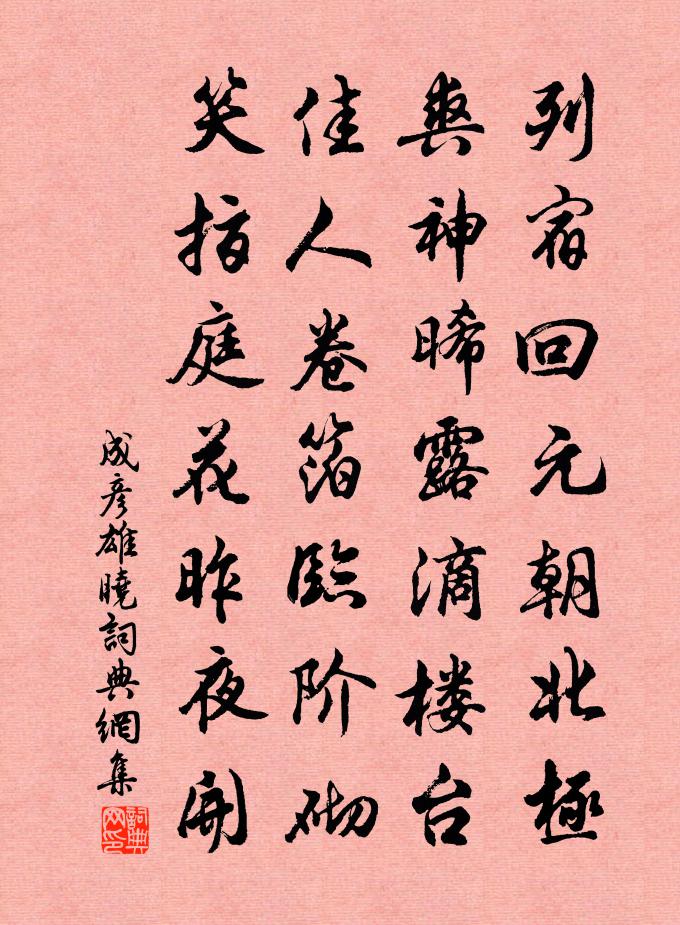 詩詞名句歷史字典書法欣賞書法字典國語詞典說文解字康熙字典古漢語字典標 題 作 者 詩 句 曉作者:成彥雄 朝代:唐代曉原文列宿回元朝北極,爽神晞露滴樓台。佳人卷箔臨階砌,笑指庭花昨夜開。詩詞問答問:曉的作者是誰?答:成彥雄問:曉寫於哪個朝代?答:唐代問:曉是什麼體裁?答:七絕成彥雄曉書法欣賞曉書法作品注釋全唐詩:卷759-12詩詞推薦毗陵太平寺畫水呈王君保使君戴復古〔宋代〕何人筆端有許力,捲來一片瀟湘碧。摩挲老眼看不真,怪見層波涌虛壁。天慶觀中雙黑龍,物色雖殊妙處同。能將二十七日泛舟偶成吳芾〔宋代〕小舟游漾小池中,偶與吾人笑語同。好把釣竿煙雨里,一蓑放我作漁翁。應庵師祖贊釋崇岳〔宋代〕虎口裡轉身,拳頭上捏怪。胡亂三十年,起東山正派。不知過犯彌天大。哀文鼎趙蕃〔宋代〕海內忘形獨漢中,幾回日暮憶江東。不惟吾子傷形影,我亦交遊不太窮。憶王孫 漁者善住〔元代〕悠悠長是白雲間。猿鳥漁樵共往還。倚個喬松看遠山。少機關。世上送徐群宰望江邵謁〔唐代〕古人力文學,所務安疲甿。今人力文學,所務惟公卿。大賢重邦本,屈跡官武城。勸民勤機杼,自然國用並。但見和酬郎簽判殿丞釋重顯〔宋代〕向國心存了了身,大方無外且同塵。江城早晚重相見,解笑宗雷十八人。石照勸農晚歸有雨虞儔〔宋代〕疎林拂拂見旌旗,短鐙翩翩度翠微。十里好山供客醉,一犁春雨勸農歸。水流花出紅成隊,麥雨天連綠打圍。投老次德先韻魏了翁〔宋代〕二氣同一根,本體浩兮淵。可見川上逝,未發心下泉。真機亡停息,果剝根長鮮。定理亡將迎,塵境地自偏。形神寄趙元歸併屬元默三首趙蕃〔宋代〕默也未識面,向來曾予書。由來幾兄弟,絕嘆每乖疏。見說長沙驛,猶遲古寺車。差池今再矣,佇立又何如。偈頌七十八首釋正覺〔宋代〕一雨一晴,底事分明。六塵昏擾,世界崢嶸。一心虛泊,萬法齊平。出得氣是你鼻孔,覷得破是你眼睛。有緣不是永王東巡歌·其十一李白〔唐代〕試借君王玉馬鞭,指揮戎虜坐瓊筵。南風一掃胡塵靜,西入長安到日邊。宿峽市楊雯〔宋代〕人煙正搖落,樓笛頗清圓。老樹依山驛,東風上峽船。江湖萬里外,燈火十年前。世路能令老,吾生且醉眠。吊魏敏功贈住庵通老王之道〔宋代〕一別異生死,三年能幾時。埋玉不可見,拱木徒興悲。通老奉香火,坐閱歲月移。圓頗點飛霜,夷曠真吾師。送竹几與謝秀才蘇軾〔宋代〕平生長物擾天真,老去歸田只此身。留我同行木上坐,贈君無語竹夫人。但隨秋扇年年在,莫斗瓊枝夜夜新。堪笑送陸協律赴端州賈至〔唐代〕越井人南去,湘川水北流。江邊數杯酒,海內一孤舟。嶺嶠同仙客,京華即舊遊。春心將別恨,萬里共悠悠。緣識宋太宗〔宋代〕年年柳與韶光契,春風便作開花便。黃鶯到處不絕聲,嫩葉芽新生翡翠。代王侍郎送程尚書赴信州三首張嵲〔宋代〕化龍陂迥照旌旗,懷玉峰高緩馬羈。地接鄉關猶晝錦,人從國老借元龜。一州如斗何勞者,六契約風要在茲。此去游靈岩寺韋應物〔唐代〕始入松路永,獨忻山寺幽。不知臨絕檻,乃見西江流。吳岫分煙景,楚甸散林丘。方悟關塞眇,重軫故園愁。聞鍾送從翁東川弘農尚書幕李商隱〔唐代〕昔帝回沖眷,維皇惻上仁。三靈迷赤氣,萬匯叫蒼旻。刊木方隆禹,陛陑始創殷。夏台曾圮閉,汜水敢逡巡。拯溺名句推薦勝人者有力,自勝者強。老子《老子·道經·第三十三章》 人家見生男女好,不知男女催人老。王建《短歌行》 梅花雪,梨花月,總相思。張惠言《相見歡·年年負卻花期》 牧童歸去橫牛背,短笛無腔信口吹。雷震《村晚》 復值接輿醉,狂歌五柳前。王維《輞川閒居贈裴秀才迪》 終日望君君不至,舉頭聞鵲喜。馮延巳《謁金門·風乍起》 山下孤煙遠村,天邊獨樹高原。王維《田園樂七首·其五》 居上不驕,為下不倍。國有道,其言足以興;國無道,其默足以容。子思《中庸·第二十七章》 悔既往之失,亦要防將來之非。洪應明《菜根譚·概論》 不明察,不能燭私。韓非及後人《韓非子·孤憤》