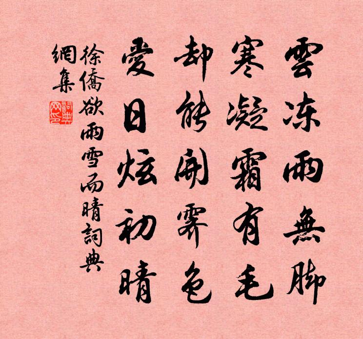 詩詞名句歷史字典書法欣賞書法字典國語詞典說文解字康熙字典古漢語字典標 題 作 者 詩 句 欲雨雪而晴作者:徐僑 朝代:宋代欲雨雪而晴原文雲凍雨無腳,寒凝霜有毛。卻能開霽色,愛日炫初晴。詩詞問答問:欲雨雪而晴的作者是誰?答:徐僑問:欲雨雪而晴寫於哪個朝代?答:宋代徐僑欲雨雪而晴書法欣賞欲雨雪而晴書法作品詩詞推薦夢行小益道中陸游〔宋代〕棧雲零亂馱鈴聲,驛樹輪囷樺燭明。清夢不知身萬里,只言今夜宿葭萌。宿田家唐彥謙〔唐代〕落日下遙峰,荒村倦行履。停車息茅店,安寢正鼾睡。忽聞扣門急,雲是下鄉隸。公文捧花柙,鷹隼駕聲勢。良民驀山溪(亳社寄文潛舍人)晁補之〔宋代〕蘭台仙史,好在多情否。不寄一行書,過西風、飛鴻去後。功名心事,千載與君同,只狂飲,只狂吟,綠鬢殊非舊金陵雜興二百首蘇泂〔宋代〕州衙三面接秦淮,臨水朱門一半開。卻是浙中無此景,江鷗飛舞入城來。反初秦觀〔宋代〕昔年淮海未,邂逅安期生。記我有靈骨,法當游太清。區中緣未斷,方外道難成。一落世間網,五十換嘉平。夜參書適陸游〔宋代〕心清絕欲早,才薄去官多。月下時閒釣,雲邊每浩歌。野堂青草覆,山市白驢過。也有成功處,新降百萬魔。甲子春過浙和周去華韻五絕史堯弼〔宋代〕遲回獨立湘江頭,湘江無情空自流。擬呼妃子弄雲瑟,一瀉胸中千斛愁。如夢令許有壬〔元代〕火榻只宜春早。紙張不知天曉。枕上問山童,門外雪深多少。休掃。休掃。收拾老夫茶灶。夢方孚若二首劉克莊〔宋代〕仙鬼微茫果是非,不如遼鶴有歸期。鑄成范蠡何嗟及,繡作平原未必知。歌扇舞裙風雨散,野田荒草古今悲。可憐慶元二年恭上太皇太后皇太后太上皇帝太上皇佚名〔宋代〕父尊母親,天涵地育。燕我翼子,景命有僕。得名得壽,如金如玉。子孫千億,成其厚福。雜曲歌辭。夜寒吟鮑溶〔唐代〕九衢金吾夜行行,上宮玉漏遙分明。霜飆乘陰掃地起,旅鴻迷雪繞枕聲,遠人歸夢既不成。留家惜夜歡心發,羅幕夫人閣四首韓維〔宋代〕重錦褰妝幕,請羅換舞衣。釵頭雙燕子,先向社前飛。酬河南節度使賀蘭大夫見贈之作高適〔唐代〕高閣憑欄檻,中軍倚旆旌。感時常激切,於己即忘情。河華屯妖氣,伊瀍有戰聲。愧無戡難策,多謝出師名。秉鉞依韻和胡使君書事范仲淹〔宋代〕都督再臨橫海鎮,集仙遙輟內朝班。清風又振東南美,好夢多親咫尺顏。坐嘯樓台凌皓月,行春鼓吹入青山。太平帆游山張又新〔唐代〕漲海嘗從此地流,千帆飛過碧山頭。君看深谷為陵後,翻覆人間未肯休。端硯六絕陳宓〔宋代〕一段無瑕真萬金,臨窗忽見洗塵心。中間方寸君知否,便是仙家綠綺琴。江湖偉觀山亭二首葉茵〔宋代〕軟紅塵外聳嵯峨,題品先曾屬老坡。立腳愈高天愈闊,靜看舟揖駕風波。江水羅椅〔宋代〕江雲粘水濕西風,冷落汀洲起夜鴻。甚欲吟秋少才思,不如岸北岸南楓。憶江南·宿雙林禪院有感納蘭性德〔清代〕心灰盡、有發未全僧。風雨消磨生死別,似曾相識只孤檠,情在不能醒。搖落後,清吹那堪聽。淅瀝暗飄金井葉,廣陵詩權德輿〔唐代〕廣陵實佳麗,隋季此為京。八方稱輻湊,五達如砥平。大旆映空色,笳簫發連營。層台出重霄,金碧摩顥清。交馳名句推薦人悄悄,簾外月朧明。岳飛《小重山·昨夜寒蛩不住鳴》 淮南皓月冷千山,冥冥歸去無人管。姜夔《踏莎行·自沔東來》 況故人新擁,漢壇旌節。辛棄疾《滿江紅·漢水東流》 三春白雪歸青冢,萬里黃河繞黑山。柳中庸《征人怨 / 征怨》 北風吹白雲,萬里渡河汾。蘇頲《汾上驚秋》 見肝之病,知肝傳脾,當先實脾張仲景《金匱要略·卷上·藏府經絡先後病脈證一》 紅深綠暗徑相交,抱暖含芳披紫袍。溫庭筠《寒食日作》 孤飛一片雪,百里見秋毫。李白《觀放白鷹二首》 不忘故鄉,仁也;不戀本土,達也。房玄齡《晉書·列傳·第三章》 縱被春風吹作雪,絕勝南陌碾成塵。王安石《北陂杏花》