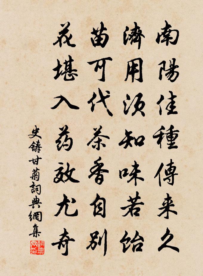 詩詞名句歷史字典書法欣賞書法字典國語詞典說文解字康熙字典古漢語字典標 題 作 者 詩 句 甘菊作者:史鑄 朝代:宋代甘菊原文南陽佳種傳來久,濟用須知味若飴。苗可代茶香自別,花堪入藥效尤奇。詩詞問答問:甘菊的作者是誰?答:史鑄問:甘菊寫於哪個朝代?答:宋代史鑄甘菊書法欣賞甘菊書法作品詩詞推薦張子真楊政光吳德夫追路湘源賦此心別張栻〔宋代〕驅車出嚴關,觸熱歸路長。一雨群物蘇,吾行亦清涼。灕水自南去,湘流正洋洋。眷言二三友,跋馬勤送將。蕭然頌古三十三首釋師觀〔宋代〕叉手進前,寂子不會。 * 活人,好個三昧。這般阿師,叢林殃害。白雲盡處是青山,行人更在青山外。飲馬長城窟行陳琳〔魏晉〕飲馬長城窟,水寒傷馬骨。往謂長城吏,慎莫稽留太原卒!官作自有程,舉築諧汝聲!男兒寧當格鬥死,何能怫鬱揚州敘游賀鑄〔宋代〕迷藏九曲屬樵耕,野草閒花故有情。廢苑春風遽如許,隔江山色可憐生。新聲度曲復誰道,古井酌泉聊獨清。杜紫溧水道中回寄子肅玉汝並屬李晦庵八首趙蕃〔宋代〕李孫兩詞伯,我爾乃學子。輩行雖不同,趣操要相似。歲寒松柏知,春風謝桃李。次韻張參議送行項安世〔宋代〕君王菲食繼唐虞,北望中原憶故墟。嗟我懷人無憚遠,參卿軍事且煩渠。急須把酒澆天口,早與歸朝說地輿。湖水句釋曉瑩〔宋代〕詩成聊疥壁。浣溪沙·春到青門柳色黃馮延巳〔唐代〕春到青門柳色黃,一梢紅杏出低牆。鶯窗人起未梳妝。繡帳已闌離別夢,玉爐空裊寂寥香。閨中紅日奈何長。田家四時梅堯臣〔宋代〕荒村人自樂,頗足平生心。朝飯露葵熟,夜舂雲谷深。采山持野斧,射鳥入煙林。誰見秋成事,愁蟬復怨碪。飲牡丹高斯得〔宋代〕尚記年時醉我賓,抽簪起舞坐生春。誰呼七七逡巡手,重視三三夢幻身。獨樂園中老居士,沉香亭北謫仙人。吾今讀正觀政要楊萬里〔宋代〕拔士新豐逆旅中,懷賢鴨綠水波東。酒頃一斗鳶肩客,醋設三杯羊鼻公。送宿州李明允都官宋祁〔宋代〕省帳香殘捲夕紅,名郎去守日圍東。組垂丈二腰章貴,騎擁千餘使幕雄。弭節亭皋鄉梓近,貫都河溜客魚通。朞年禪人並化主寫真求贊釋正覺〔宋代〕默默有得,靈靈無依。妙窮出沒,照徹離微。萬像齊收一印,三昧遍在群機。而今恁麽相隨去,終日如愚不我違。寄裴起居姚合〔唐代〕千官曉立爐煙里,立近丹墀是起居。彩筆專書皇帝語,書成幾卷太平書。山中四首釋圓悟〔宋代〕雅懷無所拘,偶行度前崗。長松發佳色,澄潭閟幽光。而我亦何幸,於此得相羊。低頭心語口,茲游那可忘。何叔宜求頌釋印肅〔宋代〕十力功高誰履踐,叔宜重叩普庵門。玄玄眾妙靈知有,自肯唯心聞不聞。時信金剛通佛慧,情忘想盡合乾坤。夜月次韻胡景參制機見壽二首陳著〔宋代〕南風吹笠走長須,一軸新詩一幅書。虎榜陳人有韓愈,鶴山佳婿得肩吾。行年八十死將似,求活須臾計已疏。慚愧挽戴主簿劉宰〔宋代〕妙年筆勢已飛揚,便合收功翰墨場。黃甲未容登上第,青衫聊用慰高堂。一同簿領棠猶在,三逕歸來菊未荒。下榻悼羅隱歸仁〔唐代〕一著讒書未快心,幾抽胸臆縱狂吟。管中窺豹我猶在,海上釣鰲君也沈。歲月盡能消憤懣,寰區那更有知音。長安依韻和希深雨後見過小池梅堯臣〔宋代〕碧池新雨後,清興一何賒。有客過顏巷,無貧以阮家。白醪聊泛蟻, * 未開花。既至休辭醉,君其奈歲華。名句推薦遇酒且呵呵,人生能幾何!韋莊《菩薩蠻·勸君今夜須沈醉》 何當擊凡鳥,毛血灑平蕪。杜甫《畫鷹》 寂寞尊前席上,唯愁海角天涯。李清照《轉調滿庭芳·芳草池塘》 遠路應悲春晼晚,殘霄猶得夢依稀。李商隱《春雨》 滿載一船秋色,平鋪十里湖光。張孝祥《西江月·阻風山峰下》 富貴非榮,富貴而利濟於世者為榮。王永彬《圍爐夜話·第三一則》 擊楫中流,曾記淚沾裳李好古《江城子·平沙淺草接天長》 酌酒會臨泉水,抱琴好倚長松。王維《田園樂七首·其七》 君王選玉色,侍寢金屏中。李白《怨歌行》 騁望因高雲外盡,鄉關回首愧煙蘿。石茂華《九月九日登長城關》