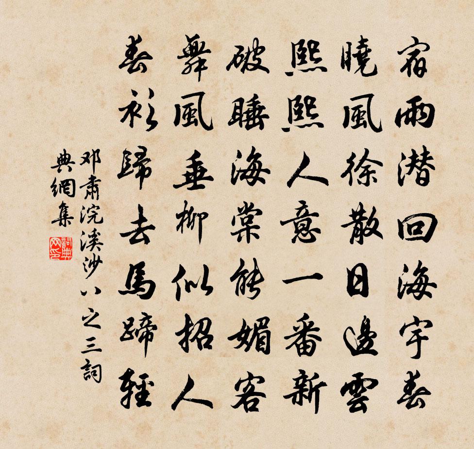 詩詞名句歷史字典書法欣賞書法字典國語詞典說文解字康熙字典古漢語字典標 題 作 者 詩 句 浣溪沙(八之三)作者:鄧肅 朝代:宋代浣溪沙(八之三)原文宿雨潛回海宇春。曉風徐散日邊雲。熙熙人意一番新。破睡海棠能媚客,舞風垂柳似招人。春衫歸去馬蹄輕。詩詞問答問:浣溪沙(八之三)的作者是誰?答:鄧肅問:浣溪沙(八之三)寫於哪個朝代?答:宋代問:浣溪沙(八之三)是什麼體裁?答:詞鄧肅浣溪沙(八之三)書法欣賞浣溪沙(八之三)書法作品詩詞推薦採桑曲武衍〔宋代〕粉光薄薄髻雲垂,葉滿湘籠獨步時。女伴未來歸未得,水邊閒照插花枝。雜興顧逢〔宋代〕檐雀啾啾無歇時,幾回銜食餒雛歸。羽毛長得完全後,子母東西各自飛。和主司王起(一作和主司酬周侍郎)樊驤〔唐代〕滿朝簪發半門生,又見新書甲乙名。孤進自今開道路,至公依舊振寰瀛。雲飛太華清詞著,花髮長安白屋榮。忝受南鄉子劉秉忠〔元代〕遊子繞天涯。才離蠻煙又塞沙。歲歲年年寒食里,無家。尚惜飄零看落花。閒客臥煙霞。應笑勞生鬢早華。驚破石醉桃源/阮郎歸周邦彥〔宋代〕冬衣初染遠山青。雙絲雲雁綾。夜寒袖濕欲成冰。都緣珠淚零。情黯黯,悶騰騰。身如秋後蠅。若教隨馬逐郎行。行路難和鮮于大夫子駿晁補之〔宋代〕贈君珊瑚夜光之角枕,玳瑁明月之雕床。一繭秋蟬之麗縠,百和更生之寶香。穠華紛紛白日暮,紅顏寂莫無留芳。題四仙像陸游〔宋代〕曾看四岳薦虞鰥,閱歲三千一瞬間。歸臥青山孤絕處,白驢常伴白雲閒。還通上人卷王之道〔宋代〕格清詞苦與誰論,攜繞錢塘給事墳。所得豈容人繼和,朗吟應被鶴聽聞。月輪冷照千岩雪,霞片輕裝萬疊雲。投向歌張祜〔唐代〕一夜列三清,聞歌曲阜城。雪飛紅燼影,珠貫碧雲聲。皓齒嬌微發,青蛾怨自生。不知新弟子,誰解囀喉輕。贈禪僧馬戴〔唐代〕弟子人天遍,童年在沃洲。開禪山木長,浣衲海沙秋。振錫搖汀月,持瓶接瀑流。赤城何日上,鄙願從師游。重答汝州李六使君見和憶吳中舊遊五首白居易〔唐代〕為憶娃宮與虎丘,玩君新作不能休。蜀箋寫出篇篇好,吳調吟時句句愁。洛下林園終共住,江南風月會重遊。[先滄洲白鷺軒五首汪炎昶〔宋代〕雲影天光匝釣磯,氈毳微展雪毛衣。不知妙得天然趣,只道驚人意欲飛。驀山溪姬翼〔元代〕平生懶散,不識閒煩惱。蝸舍但容身,更誰問、瑤台瓊島。比鄰縱有,三兩野人家,忘取捨,絕將迎,門外何曾到乙酉夏述懷二絕劉宰〔宋代〕水邊舟子競招招,陌上車塵晚更囂。祗有幽人無個事,藉花深處弄輕橈。拜趙端齋墓有感而書陳著〔宋代〕流俗滔滔逐亂塵,典刑卓卓老宗臣。山川在眼孤忠淚,風雨無家一夢身。及奠生芻吾已晚,忍看宿草自成春。方來詠梅釋文珦〔宋代〕萬木凋零盡,知經幾度霜。獨余冰玉質,薰得夢魂香。影入清泉唐,聲傳畫角長。每因春爛漫,惆悵失孤芳。春日醴泉杜明府承恩五品宴席上賦詩岑參〔唐代〕鳧舄舊稱仙,鴻私降自天。青袍移草色,朱綬奪花然。邑里雷仍震,台中星欲懸。吾兄此棲棘,因得賀初筵。感事朱槔〔宋代〕元規負康濟,徒手嬰群雄。兵從歷陽來,無地逃奸鋒。誰乎死社稷,千載一卞公。英風與義氣,建立萬江東。訪鄒滿字溪上顧夢遊〔清代〕言尋居士家,薄暮清溪道。荒原鳥獨飛,寒木雲相抱。入室聞疏鍾,開門見秋潦。落葉坐來多,清風時一掃。臨桂令以薦當趨朝置酒召客戲作二十八字遣六張嵲〔宋代〕雙鳧舊作朝天計,一鶚新收薦士書。不惜持杯相暖熱,白頭慈母最憐渠。名句推薦蠟炬風搖簾不下,竹影半牆如畫。項鴻祚《清平樂·池上納涼》 畫虎畫皮難畫骨,知人知面不知心。佚名《增廣賢文·上集》 莊生曉夢迷蝴蝶,望帝春心托杜鵑。李商隱《錦瑟》 結髮為夫妻,恩愛兩不疑。蘇武《留別妻》 以少總多,情貌無遺矣。劉勰《文心雕龍·物色》 儉則傷事,侈則傷貨管仲《管子·乘馬》 有美一人,清揚婉兮。佚名《野有蔓草》 吟懷未許老重陽,霜雪無端入鬢長。序燈《九日吳山宴集值雨次韻》 倒言反事以嘗所疑。韓非及後人《韓非子·內儲說上七術》 救人須救急,施人須當厄。馮夢龍《醒世恆言·卷十》