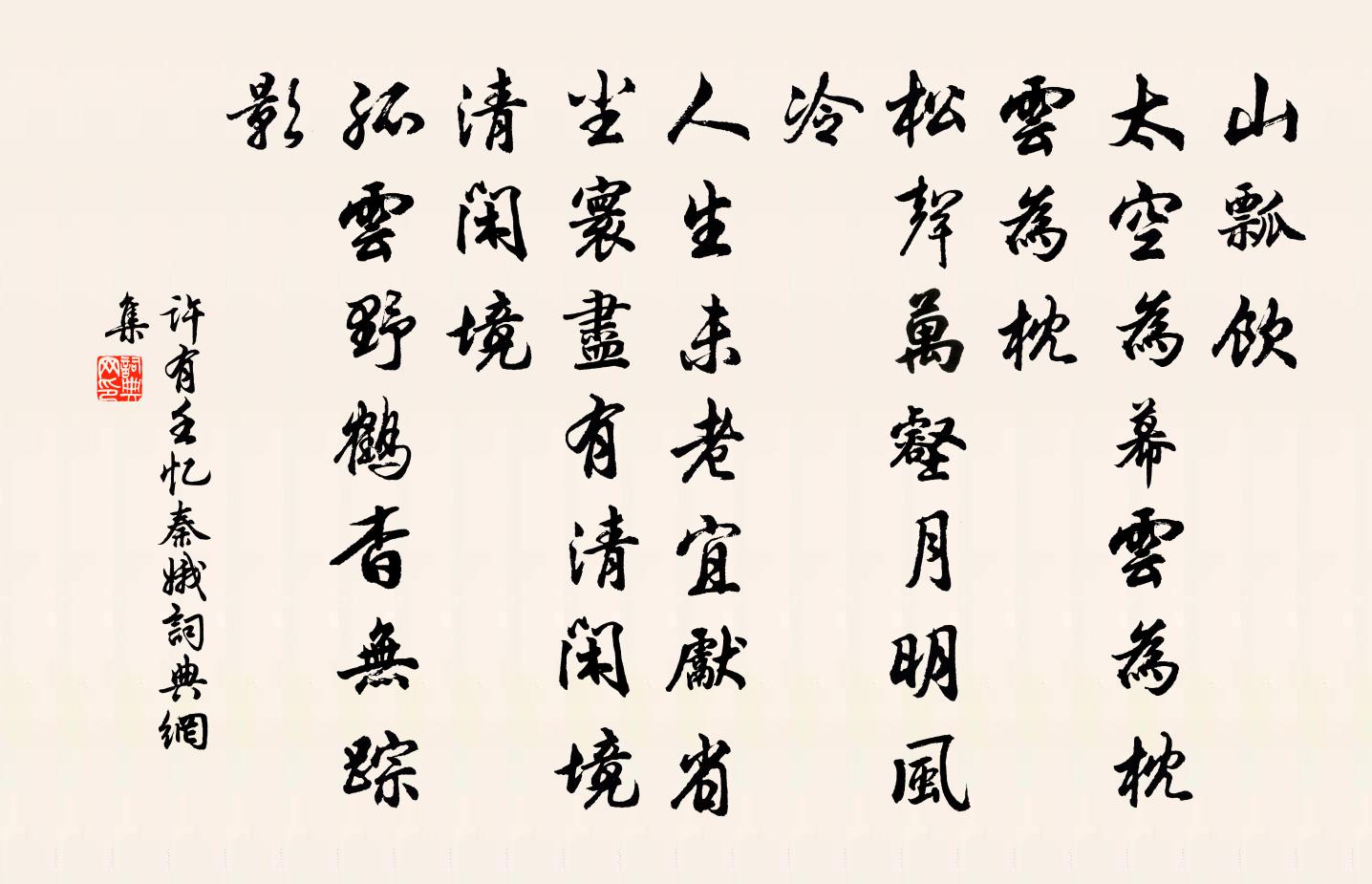 詩詞名句歷史字典書法欣賞書法字典國語詞典說文解字康熙字典古漢語字典標 題 作 者 詩 句 憶秦娥作者:許有壬 朝代:元代憶秦娥原文山瓢飲。太空為幕云為枕。云為枕。松聲萬壑,月明風冷。人生未老宜先省。塵寰盡有清閒境。清閒境。孤雲野鶴,杳無蹤影。詩詞問答問:憶秦娥的作者是誰?答:許有壬問:憶秦娥寫於哪個朝代?答:元代問:憶秦娥是什麼體裁?答:詞許有壬憶秦娥書法欣賞憶秦娥書法作品詩詞推薦山中早春司馬光〔宋代〕山木欣欣意,春光次第催。欹巾望歸雁,伏檻聽新雷。岩靜聞冰折,巢空喜燕來。澗花從寂寞,亦向草堂開。董侍郎生日三首魏了翁〔宋代〕紫氣飛騫一馬驄,當年輕下五雲東。詩書意味江都相,琴鶴規模清獻公。長嘯驅風靜秋戍,精神喚雨作年豐。列城台城路/齊天樂仇遠〔宋代〕畫樓西送斜陽下,不隨逝波東去。野曠莎長,山空木短,零落紅衣南浦。游雲路阻。便魂斷蒼梧,怨弦誰鼓。空采雨後集湖上陸游〔宋代〕野水交流自滿畦,芳池新漲恰平堤。花藏密葉多時在,鶯占高枝盡日啼。繡袂竇裙催結束,金尊翠杓共提攜。白頭玉樓春佚名〔宋代〕天上雙星歡迤邐。報導一門雙喜。果慶雙弧矢,雙桂連芳,雙璧光華起。看取他時雙彩戲。雙墮號、機雲才子。更題北山松軒趙企〔宋代〕萬木有榮謝,此松無盛衰。蘿闌秋韻起,棋罷午陰移。般匠雇不雇,秦君知未知。亭亭高節在,看取雪霜時。和始平公夢中有懷歸之念作詩始得兩句而寤因司馬光〔宋代〕元宰撫洪鈞,四海可熏灼。至人養天真,視此猶嬰縛。出入金鼓威,寤寐琴樽樂。乃知伊呂心,未始忘丘壑。句仇遠〔宋代〕風雨不出戶,兒孫共讀書。春半久雨走筆五首方回〔宋代〕耳焦發禿四肢枯,年近非熊異壯圖。見識漸高詩□□,精神常好酒相扶。地輿茂育元非有,天宇空虛不是無。自笑有人示山水畫卷以為元暉作求詩戴表元〔宋代〕硯山山下小於菟,文彩斕斑今亦無。一塢亂雲濃似漆,春風吹夢過西湖。平沙雁落王之道〔宋代〕雨余湖水吞遙空,前山宿霧開溟濛。坐看雁陣落沙觜,欲下復起摩蒼穹。寒蘆飛花秋色老,亂撲客衣紛不掃。肅肅贈張繪秘教九題詩壁林逋〔宋代〕數題留粉堵,還勝在屏風。坐讀棋慵下,眠看酒恰中。僧房秋色冷,山驛晚陽紅。更有棲遲句,家徒一畝宮。讀孟郊集貫休〔唐代〕東野子何之,詩人始見詩。清刳霜雪髓,吟動鬼神司。舉世言多媚,無人師此師。因知吾道後,冷淡亦如斯。句章得象〔宋代〕一麾遠在百蠻中。千尋練掛雙流瀑。雪中觀客夜博趙汝鐩〔宋代〕積雪深一尺,堆瓊迷山扉。豪客夜排闥,挑燈紅爐圍。成梟呼五白,轉勝賞四緋。舉觴無不釂,寒深酒力微。姑置早起貫休〔唐代〕夜坐還早起,寂寥多病身。神清尋夢在,香極覺花新。樹露繁於雨,溪雲動似人。又知何處客,軋軋轉征輪。【南呂】一枝花 嘲僧佚名〔元代〕七寶羅漢身,八難觀音像。玉樓巢翡翠,誰教你金殿鎖鴛鴦?簫寺里蝶亂蜂狂,玉溪館青樓巷,緣得五台山傅粉郎再和前韻本欲創亭以獲時而止胡寅〔宋代〕不因修築廢農時,欲以仁心翊化基。野草從來豐可藉,量陂元自渺無湄。登臨有愜三檛鼓,衰病多慚一斗卮。獨喜日暮繫舟仲並〔宋代〕新晴不受短篷遮,系纜持觴一太嗟。柳岸蕭條難駐客,茅檐安穩不如家。百年有幾欲華發,今日無多已暮鴉。五世同陳宰黃簿游靈山八首宰雲吾輩可謂忙裡偷閒陳造〔宋代〕一代無為翁,雅志屬丘壑。至今玉雪句,為山鎮不若。生平嵇生龍,何時令威鶴。弔古但三嘆,九原如可作。名句推薦楊柳陰陰細雨晴,殘花落盡見流鶯。武元衡《春興》 遙憐故園菊,應傍戰場開。岑參《行軍九日思長安故園》 相思記取,愁絕西窗夜雨。韓元吉《薄倖·送安伯弟》 春日游,杏花吹滿頭。韋莊《思帝鄉·春日游》 上有好者,下必有甚焉者矣。孟子《孟子·滕文公章句上·第二節》 年年郡縣送征人,將與遼東作丘坂。王建《遼東行》 傷心莫語,記那日旗亭,水嬉散盡,中酒阻風去。納蘭性德《摸魚兒·午日雨眺》 何日歸家洗客袍?銀字笙調,心字香燒。蔣捷《一剪梅·舟過吳江》 兩岸荔枝紅,萬家煙雨中。李師中《菩薩蠻·子規啼破城樓月》 今日清明節,園林勝事偏。賈島《清明日園林寄友人》