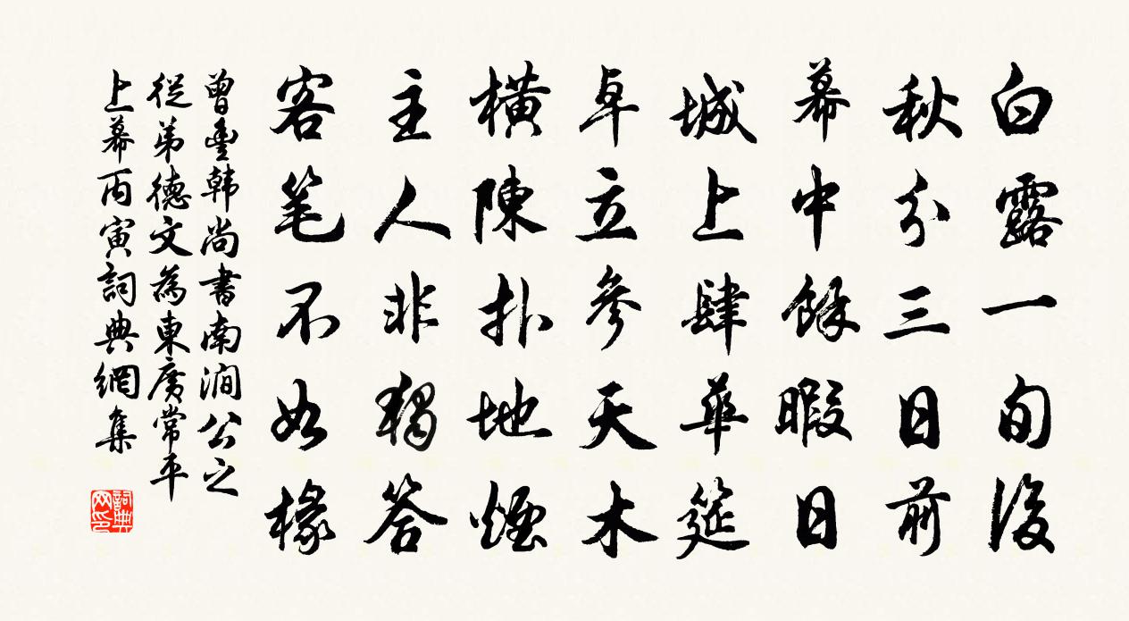 詩詞名句歷史字典書法欣賞書法字典國語詞典說文解字康熙字典古漢語字典標 題 作 者 詩 句 韓尚書南澗公之從弟德文為東廣常平上幕丙寅作者:曾豐 朝代:宋代原文白露一旬後,秋分三日前。幕中餘暇日,城上肆華筵。卓立參天木,橫陳撲地煙。主人非獨答,客筆不如椽。詩詞問答問:《韓尚書南澗公之從弟德文為東廣常平上幕丙寅》的作者是誰?答:曾豐問:該詩寫於哪個朝代?答:宋代書法欣賞韓尚書南澗公之從弟德文為東廣常平上幕丙寅書法作品詩文賞析【原題】:韓尚書南澗公之從弟德文為東廣常平上幕丙寅八月上旬護印迎新使長李監丞先五日會客於翼然亭余與焉賦三詩詩詞推薦謁金門(春早湖山)韓淲〔宋代〕春尚早。春入湖山漸好。人去人來雖未老。酒徒猶恨少。梅落桃開煙島。日日更吹香草。一片芳心拚醉倒。冷雲藏春中泛舟楊憑〔唐代〕仙郎歸奏過湘東,正值三湘二月中。惆悵滿川桃杏醉,醉看還與曲江同。杜鵑花方乾〔唐代〕未問移栽日,先愁落地時。疏中從間葉,密處莫燒枝。郢客教誰探,胡蜂是自知。周回兩三步,常有醉鄉期。與高畫生陳宓〔宋代〕衰顏不似十年前,今日重模一惘然。擬向滄洲寄塵跡,憑君歸報小蓬仙。淳熙七年端午帖子詞皇后合六首崔敦詩〔宋代〕玉燕垂符小,珠囊結艾青。更將長命縷,侵曉奉慈庭。挽李自玉趙必象〔宋代〕醫至猶言疾可為,酸風吹訃落茅茨。典型諸老凋零盡,一束生芻雨涕垂。題楚州聖井並贈主僧張耒〔宋代〕古佛勝妙力,一泓常湛然。禱祈供眾欲,守護賴師賢。清碧晨齋罷,秋登寶供前。自憐多病質,時許挹清泉。鄭寺丞鄧山長來訪林中區仕衡〔宋代〕喧傳彩鷁下江乾,村北村南稚子看。呼酒咄嗟欣有客,住山寥落幸無官。不慚居士新藤帽,亦醉田家老瓦盆。君愛游山陸游〔宋代〕九十衰翁心尚孩,幅巾隨處一悠哉!偶扶拄杖登山去,卻喚孤舟過渡來。酒市擁途觀嵬峨,僧廬借榻寄咍台。吾生再次韻送張守陳造〔宋代〕唾壺聲里晚涼輕,風自虛徐月自傾。詩好要從知者道,格高今識古人情。三熏誰定分膏馥,十襲吾方守詛盟。預恐眼疾王禹偁〔宋代〕古人功業甘無分,往聖詩書合有緣。何事病來花滿眼,只將簡策枕頭眠。恩封渭南伯唐詩人趙嘏為渭南尉當時謂之趙渭陸游〔宋代〕老向人間久倦遊,君恩乞與渭川秋。虛名定作陳驚坐,好句真慚趙倚樓。棧豆十年沾病馬,煙波萬里著浮鷗。就封聞正叔與客過趙園歡飲戲成小詩司馬光〔宋代〕吾廬寂寞類荒村,但有林間鳥雀喧。不似楚家多樂事,笙歌拾得醉鄰園。上元前大雪即晴楊萬里〔宋代〕臘前三日巳奇絕,年後六花仍作團。才定忽斜偏有思,欲消還凍不勝寒。且留大地萬銀屋,要伴青天孤玉盤。今歲挽姚君二首吳芾〔宋代〕處心心無愧,持身德有常。施恩周里閈,植福遍僧坊。入戶書盈室,開樽客滿堂。清芬傳後葉,看取桂枝芳。梅胡仲弓〔宋代〕天地有生意,驗之陽氣回。所以霜雪中,春風先及梅。送別任龍圖史才〔宋代〕江上飛檣高數尋,西風客路思難禁。三千奏議曾經國,十萬兵屯已屬心。官驛疏梅春意足,楚天孤鶩曉煙沉。閩南行香子王吉昌〔元代〕震乙情柔,酷愛庚金。角商和、律應清音。木人鼓掌,石女調琴。顯巧施仁,勤行義,道情深。二物相融,互動浮七十九吟十首劉克莊〔宋代〕業緣在東震旦國,參禮遍南贍部州。欠明眼人與談道,就圓機士語九流。早秋寄題天竺靈隱寺賈島〔唐代〕峰前峰後寺新秋,絕頂高窗見沃洲。人在定中聞蟋蟀,鶴從棲處掛獼猴。山鍾夜渡空江水,汀月寒生古石樓。心憶名句推薦春日遲遲春草綠,野棠開盡飄香玉。李洞《繡嶺宮詞》 一種相思,兩處閒愁。李清照《一剪梅·紅藕香殘玉簟秋》 芙蓉金菊斗馨香。天氣欲重陽。晏殊《訴衷情·芙蓉金菊斗馨香》 玉樓金闕慵歸去,且插梅花醉洛陽朱敦儒《鷓鴣天·西都作》 晝夜蔽日月,冬夏共霜雪。謝靈運《登廬山絕頂望諸嶠》 小時不識月,呼作白玉盤。李白《古朗月行》 酒闌更喜團茶苦,夢斷偏宜瑞腦香。李清照《鷓鴣天·寒日蕭蕭上瑣窗》 蚤是傷春夢雨天,可堪芳草更芊芊。韋莊《長安清明》 不應取法。不應取非法。鳩摩羅什譯《金剛經·正信希有》 知者行之始。行者知之成。王陽明《傳習錄·卷上·門人陸澄錄》