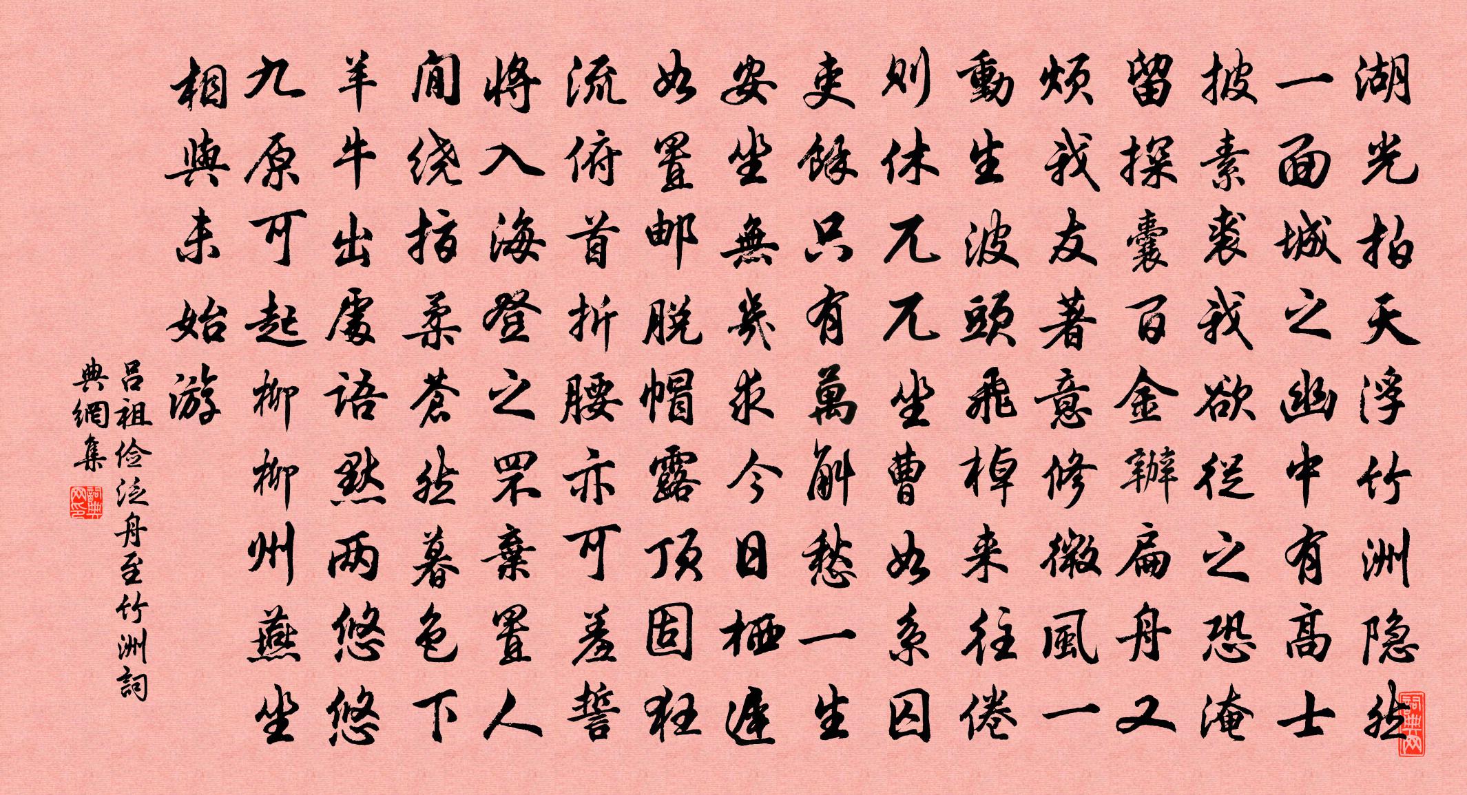詩詞名句歷史字典書法欣賞書法字典國語詞典說文解字康熙字典古漢語字典標 題 作 者 詩 句 泛舟至竹洲作者:呂祖儉 朝代:宋代泛舟至竹洲原文湖光拍天浮竹洲,隱然一面城之幽。中有高士披素裘,我欲從之恐淹留。探囊百金辦扁舟,又煩我友著意修。微風一動生波頭,飛棹來往倦則休。兀兀坐曹如繫囚,吏余只有萬斛愁。一生安坐無幾求,今日棲遲如置郵。脫帽露頂固狂流,俯首折腰亦可羞。誓將入海登之罘,棄置人閒繞指柔。蒼然暮色下羊牛,出處語默兩悠悠。九原可起柳柳州,燕坐相與未始游。詩詞問答問:泛舟至竹洲的作者是誰?答:呂祖儉問:泛舟至竹洲寫於哪個朝代?答:宋代呂祖儉泛舟至竹洲書法欣賞泛舟至竹洲書法作品詩詞推薦嘉州張俞〔宋代〕城分二江急,樹入九峰開。地隔犍牂繞,人從楚蜀來。出關經華岳寺,訪法華雲公岑參〔唐代〕野寺聊解鞍,偶見法華僧。開門對西嶽,石壁青稜層。竹徑厚蒼苔,松門盤紫藤。長廊列古畫,高殿懸孤燈。五月臨江仙辛棄疾〔宋代〕憶醉三山芳樹下,幾層風韻忘懷。黃金顏色五花開。味如廬橘熟。貴似荔枝來。聞道商山餘四老,橘中自釀秋醅。賦黃香梅絕句八首正月二十三作時築樓居將就李壁〔宋代〕方琮分潤作幽姿,一點檀心說向誰。正使持來供鼎事,輸他雪外兩三枝。賀新郎佚名〔宋代〕鸞鳳初成匹。想桃源、劉郎仙女,新歡稠密。昨夜文星從天降,孕作凡器質。卻正屬、梅黃時日。三九良辰佳氣藹湖上王同祖〔宋代〕偶出城來日未西,百花叢底草萋萋。遊人過盡歸來晚,行過蘇公十里堤。寄傅君倚同年黃庭堅〔宋代〕有情清江水,東下投豫章。故人江上居,不寄書一行。相思對明月,談笑如清光。向風長嘆息,孤雁起寒塘。傾寫和李雁湖晚春即事八首吳泳〔宋代〕丰神玉雪更清溫,胸次涵濡七澤吞。聞道晚年偏好易,手探月窟足天根。次韻葉茵〔宋代〕生涯老巾衾,清處更清吟。舊事即新夢,今人非古心。意行雙謝屐,道在一陶琴。誰解無各利,其中有淺深。詠竹月張玉孃〔宋代〕幽幽萬籟竹千竿,涼夜宜從自裹看。翠節參差訴玉兔,金波晃洋浴青鶯。半檐蒼月催詩思,一徑寒輝醒醉魂。吹徹水調歌頭(紅梅)曹冠〔宋代〕造物巧鍾賦,新臘報花期。江梅清瘦,只是潔白逞芳姿。我欲超群絕類,故學仙家繁杏,穠艷映橫枝。朱粉膩香臉出真陽峽十首楊萬里〔宋代〕江楓新染綠衣衫,知費春風幾杷藍。道是春光在桃李,試除桃李盡教參。贊水月觀音釋法薰〔宋代〕現自在端嚴相,起利他悲憫心。水茫茫,月沉沉。眾生無盡,我顧方興。曉起復昏,泯去來今。正月十六夜大雪次張守諸公二首陳造〔宋代〕詩款鈴齋到即通,細工時肯博粗工。政聲已獨當時步,人士飫觀前輩風。未分清新命開府,可能簡遠盡安豐。譚間贈嗣直弟頌十首黃庭堅〔宋代〕江南十兄弟,長被時一共。夢時各自境,獨與君同夢。春日即事陳深〔宋代〕忽忽春將晚,幽窗趣亦佳。山峰時入座,野鼠畫緣階。俗事何能已,浮生信有涯。莊書讀一尺,聊復散幽懷。夢黃衣童子歌李豫〔唐代〕中五之德方峨峨,胡胡呼呼何奈何。題石室山王寧所居(罷官學道)秦系〔唐代〕白雲知所好,柏葉幸加餐。石鏡妻將照,仙書我借看。鳥來翻藥碗,猿飲怕魚竿。借問檐前樹,何枝曾掛冠。詞笑令(十首並詩·①王昭君)秦觀〔宋代〕詩曰:漢宮選女適單于。明妃斂袂登氈車。玉容寂寞花無主,顧影低回泣路隅。行行漸入陰山路。目送征鴻入雲去和樂天初授戶曹喜而言志元稹〔唐代〕王爵無細大,得請即為恩。君求戶曹掾,貴以祿奉親。聞君得所請,感我欲沾巾。今人重軒冕,所重華與紛。矜誇名句推薦相攜及田家,童稚開荊扉。李白《下終南山過斛斯山人宿置酒》 亂鴉三四點,愁坐話無憀。陳維崧《臨江仙·寒柳》 人不通今古,馬牛如襟裾。佚名《增廣賢文·上集》 多私者不義,揚言者寡信。戴聖《大戴禮記·文王官人第七十二》 牆外行人,牆裡佳人笑。蘇軾《蝶戀花·春景》 任你官清似水,難逃吏滑如油。馮夢龍《醒世恆言·卷二十》 船動湖光灩灩秋,貪看年少信船流。皇甫松《採蓮子·船動湖光灩灩秋》 春宵苦短日高起,從此君王不早朝。白居易《長恨歌》 雨後雙禽來占竹,秋深一蝶下尋花。文同《北齋雨後》 長江一帆遠,落日五湖春。劉長卿《餞別王十一南遊》