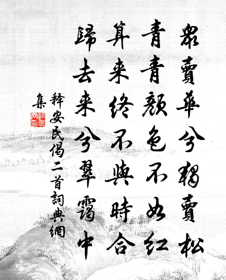詩詞名句歷史字典書法欣賞書法字典國語詞典說文解字康熙字典古漢語字典標 題 作 者 詩 句 偈二首作者:釋安民 朝代:宋代偈二首原文眾賣華兮獨賣松,青青顏色不如紅。算來終不與時合,歸去來兮翠靄中。詩詞問答問:偈二首的作者是誰?答:釋安民問:偈二首寫於哪個朝代?答:宋代釋安民偈二首書法欣賞偈二首書法作品詩詞推薦夜坐章甫〔宋代〕枕簟遲遲睡,軒窗一一開。市收人語寂,江迥水風來。熠耀明衣袂,嬋娟到酒杯。新涼兒女健,促織已相催。子初全溪作李商隱〔唐代〕全溪不可到,況復盡余醅。漢苑生春水,昆池換劫灰。戰蒲知雁唼,皺月覺魚來。清興恭聞命,言詩未敢回。和池州陳教授韻二首吳芾〔宋代〕人物今誰似此郎,合居嚴近贊垂裳。未將事業先諸老,且把文章變一方。今日杏壇風似魯,向來鐵硯志如桑。會看五月十一日夜且半夢從大駕親征盡復漢唐故地陸游〔宋代〕五月十一日,夜且半,夢從大駕親征,盡復漢、唐故地。見城邑人物繁麗,云:西涼府也。喜甚,馬上作長句,未句杜抑之〔宋代〕雷霆真自地中出,河漢莫從天上翻。雪中雪坡十憶姚勉〔宋代〕倚空銀管立嵯峨,看雪須登窣堵波。一覽瓊田三萬頃,分明掌上見山河。釋老六言十首劉克莊〔宋代〕惠能鐵葉漆布,瞿曇金棺茶毗。若道老君不死,未知秦失吊誰。和不禱趙希逢〔宋代〕艱難險阻謾曾經,有惠終輸有福人。邈爾大鈞休致問,澹然方寸自能神。早知造物難僥倖,何似虛懷任屈伸。但看泛淮陳師道〔宋代〕冬暖仍初日,潮回更下風。鳥飛雲水裡,人語櫓聲中。平野容回顧,無山會有終。倚檣聊自逸,吟嘯不須工。偈頌八十七首釋慧開〔宋代〕死心室內,移身移步。日日香燈,朝朝話墮。稽首齊安王,鐵蛇橫大道。次韻答和甫盧泉水三首黃庭堅〔宋代〕盧泉之木百尺長,下蔭泉色如木蒼。蘋風荷雨灑面涼,倒影搖盪天滄浪。網登錦鱗蒲荇香,何以貫之柳與楊。古來春晚雜興陸游〔宋代〕寂寂野人家,柴扉傍水斜。僧分晨缽筍,客共午甌茶。燕戶添新土,蛛絲罥落花。悠然便終日,惟此送年華。上元夜效小庾體陳子昂〔唐代〕三五月華新。遨遊逐上春。相邀洛城曲。追宴小平津。樓上看珠妓。車中見玉人。芳宵殊未極。隨意守燈輪。( 野菊史鑄〔宋代〕塞郊露蕊疏仍小,瘦地霜枝細且長。境僻人稀誰與采,馬蹄贏得踐余香。句劉昭禹〔唐代〕句向夜深得,心從天外歸。(見《紀事》)危樓聊側耳,高柳又鳴蟬。(《秋日登樓》,見《吟窗雜錄》)蘚色圍奉和景仁西湖泛舟司馬光〔宋代〕滿船歌吹拂春灣,天外晴霞水底斑。誰信飛觴臨綺席,獨能回首望青山。東門車馬匆匆別,西洛風煙寂寂閒。疊石惠政橋孫應鳳〔宋代〕百仞崖邊有此橋,地平路穩玉聰驕。惠而知政今如此,拈起橋名問國僑。喜涼亭吳機〔宋代〕小亭新築藕花邊,為愛陂塘五月天。最好一番風雨過,瓊珠無數落清泉。太湖詩三宿神景宮皮日休〔唐代〕古觀岑且寂,幽人情自怡。一來包山下,三宿湖之湄。況此深夏夕,不逢清月姿。玉泉浣衣後,金殿添香時。客省贈盧沙彌小師姚合〔唐代〕怕見世間事,削頭披佛衣。年小未受戒,會解如老師。天與出家腸,一食齋不飢。麻履踏雪路,與馬不肯騎。嫌我名句推薦翠葉吹涼,玉容消酒,更灑菇蒲雨。姜夔《念奴嬌·鬧紅一舸》 借問江潮與海水,何似君情與妾心?白居易《浪淘沙·借問江潮與海水》 金絡青驄白玉鞍,長鞭紫陌野遊盤。萬楚《驄馬》 目之於色也,有同美焉。孟子《孟子·告子章句上·第七節》 想當年,金戈鐵馬,氣吞萬里如虎。辛棄疾《永遇樂·京口北固亭懷古》 月落烏啼霜滿天,江楓漁火對愁眠。張繼《楓橋夜泊 / 夜泊楓江》 不足於行者,說過;不足於信者,誠言。荀子《荀子·大略》 無端嫁得金龜婿,辜負香衾事早朝。李商隱《為有》 西施越溪女,出自薴蘿山。李白《西施 / 詠薴蘿山》 田園寥落干戈後,骨肉流離道路中。白居易《望月有感》