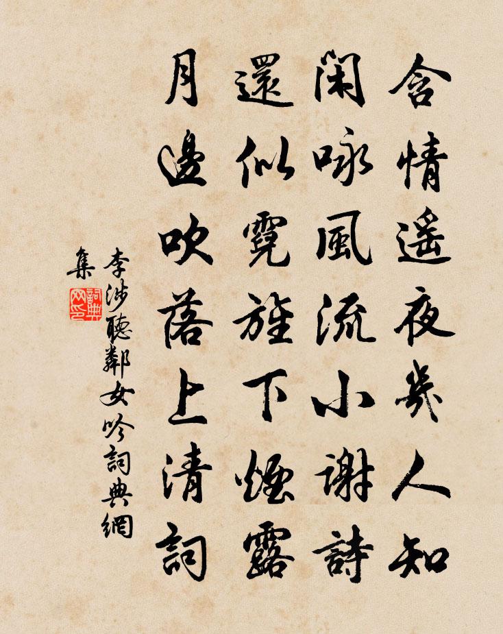 詩詞名句歷史字典書法欣賞書法字典國語詞典說文解字康熙字典古漢語字典標 題 作 者 詩 句 聽鄰女吟作者:李涉 朝代:唐代聽鄰女吟原文含情遙夜幾人知,閒詠風流小謝詩。還似霓旌下煙露,月邊吹落上清詞。詩詞問答問:聽鄰女吟的作者是誰?答:李涉問:聽鄰女吟寫於哪個朝代?答:唐代問:聽鄰女吟是什麼體裁?答:七絕李涉聽鄰女吟書法欣賞聽鄰女吟書法作品注釋全唐詩:卷477-68詩詞推薦贈張君馬廷鸞〔宋代〕世間草隸是雲礽,汲冢深埋喚不譍。五百年間徐騎省,一千年後李陽冰。李朝議輓詞二首范祖禹〔宋代〕美行商山老,高年渭水翁。政留循吏跡,家有古人風。操幾門庭在,安車裡巷空。子孫皆孝養,餘慶自無窮。題泰山仁安殿壁王奕〔宋代〕大極何年庭帝孫,中居岱嶽鎮乾坤。三年余載昭明代,七十二君來至尊。魯甸齊邱雄地勢,秦松漢柏護天門。兵塵次韻靖州貢士鹿鳴宴二首魏了翁〔宋代〕鳴春。敢將愚見酬佳贈,原子深思勿語人。相和歌辭。長門怨裴交泰〔唐代〕自閉長門經幾秋,羅衣濕盡淚還流。一種蛾眉明月夜,南宮歌管北宮愁。宿東亭曉興白居易〔唐代〕溫溫土爐火,耿耿紗籠燭。獨抱一張琴,夜入東齋宿。窗聲度殘漏,簾影浮初旭。頭養曉梳多,眼昏春睡足。負暄望蓬萊 寄桃林口王都監王丹桂〔元代〕華宗士,清譽久聞傳。邂逅相逢青嶂里,盤桓共坐玉泉邊。談論契真詮。從別後,再會得無緣。切恐靈機迷 * ,牡丹菊史鑄〔宋代〕本是秋香九黃,假為國色百花王。待殘擬把酥煎啖,莫采芳英泛酒觴。秋夕釋昭符〔宋代〕又是聽猿吟,如何恨更深。每因多病日,減卻少年心。凍鶴連崖雪,愁人半夜碪。故園阻兵革,訊息遣誰尋。句釋簡長〔宋代〕煙壘沉寒笛,霜空擊怒雕。桂林宴交代董侍郎樂語口號李曾伯〔宋代〕同是虛皇老從臣,海山深處細論心。金蘭誼篤新藩翰,玉筍班趨舊禁林。對月不妨延桂影,思人惟有護棠陰。公歸眼兒媚盧祖皋〔宋代〕玉鉤清曉上簾衣。香霧濕春枝。餘寒逗雨,羅裙無賴,重暖金猊。柳邊誰寄東風纜,流水只年時。無人為記,天涯西江月(七)張伯端〔宋代〕人我眾生壽者,寧分彼此高低。法身通照沒吾伊。念念體分同異。見是何曾是是,聞非未必非非。往來諸用不相知記小圃花果二十首劉克莊〔宋代〕老景歡悰少,看花偶出嬉。相隨惟一肩,錦傘欲何施。佛頭菊朱翌〔宋代〕我杖常扶佛面強,我花今見佛頭香。靈山會上曾拈出,一笑懸知是飲光。高樓曲趙崇嶓〔宋代〕高樓漠漠東風塵,花須落溪生綠雲。艷歌美酒消好春,千金難解青娥顰。燕鶯語言鳳凰意,畫空不成天似水。潮紅金華邵氏面山臨溪而居又架木為亭雲丘壑之勝蘇籀〔宋代〕茂林翠巘碧潺湲,涼月白雲飄素筵。几杖逍遙領其會,佳哉茜絢有餘妍。與卿寓登多景樓口占立成衛宗武〔宋代〕世稱期樓天下奇,雨余振履此游適。埋頭旅舍氣弗蘇,一見端能洗湮鬱。連岡三面作襟袖,洪流千里在履舄。俯窺太寧郡夫人張氏輓詞二首楊萬里〔宋代〕我憶定齋老,壺觴父子間。西湖梅半落,東館月初彎。俄頃王姑酒,嶔岑杜母山。升堂遲一拜,作誄費頻刪。偈釋子文〔宋代〕不昧不落作麽會,會得依前墮野狐。一夜涼風生畫角,滿船明月泛江湖。名句推薦十五入漢宮,花顏笑春紅。李白《怨歌行》 叩枻長歌,嫦娥欲下,萬里揮冰雪。趙秉文《大江東去·用東坡先生韻》 近鄉情更怯,不敢問來人。宋之問《渡漢江》 待羔兒、酒罷又烹茶,揚州鶴。辛棄疾《滿江紅·和范先之雪》 量大禍不在,機深禍亦深。佚名《增廣賢文·下集》 小快害義,小慧害道,小辨害治,苟心傷德。劉向《說苑·談叢》 自知者不怨人,知命者不怨天;怨人者窮,怨天者無志。荀子《荀子·榮辱》 何處它年寄此生,山中江上總關情。虞集《院中獨坐》 新秋逢閏,鵲橋重駕,兩度人間乞巧。顧太清《鵲橋仙·雲林矚題閏七夕聯吟圖》 雨雪自飛千嶂外,榆林只隔數峰西。朱彝尊《出居庸關》
