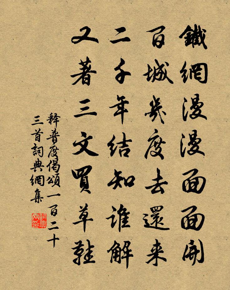 詩詞名句歷史字典書法欣賞書法字典國語詞典說文解字康熙字典古漢語字典標 題 作 者 詩 句 偈頌一百二十三首作者:釋普度 朝代:宋代偈頌一百二十三首原文鐵網漫漫面面開,百城幾度去還來。二千年結知誰解,又著三文買草鞋。詩詞問答問:偈頌一百二十三首的作者是誰?答:釋普度問:偈頌一百二十三首寫於哪個朝代?答:宋代釋普度偈頌一百二十三首書法欣賞偈頌一百二十三首書法作品詩詞推薦雞鳴埭曲溫庭筠〔唐代〕南朝天子射雉時,銀河耿耿星參差。銅壺漏斷夢初覺,寶馬塵高人未知。魚躍蓮東盪宮沼,濛濛御柳懸棲鳥。紅妝題淳于髡墓劉禹錫〔唐代〕生為齊贅婿,死作楚先賢。應以客卿葬,故臨官道邊。寓言本多興,放意能合權。我有一石酒,置君墳樹前。比同彥平謁希顏千里昆仲千里留醉短項翁彥平樂備〔宋代〕君不見便腹邊先生,齁齁晝眠貯五經。又不見長頭朵都尉,喋喋問字聒人耳。兩人挾策煩天機,俱忘其羊乃其理。菩薩蠻佚名〔宋代〕柳橋花塢南城陌。朱顏綠髮長安客。雨後小池台。尋常載酒來。馬頭今日路。卻望城西去。斜日下汀洲。斷雲和淚張聖民席上聽張令彈琴梅堯臣〔宋代〕一聽履霜霜滿足,再聽綠水聲緣谷。我行日月候春波,嫩苔沙雨侵魚目。漁歌晚唱泛水來,天浸滄浪光可掬。坐中與諸同僚偶會賦八題不期而會蘇頌〔宋代〕泛交以勢利,君子期久要。道義苟契合,出處無阻遙。龍興雲必從,宮鳴商亦調。樂哉此席會,固非夙相招。禪人並化主寫真求贊釋正覺〔宋代〕兀兀堆堆,髑髏眼開。全身放下,借伴還來。一彈指響流通句,樓閣門門見善財。連日雨作頓有秋意懷感之餘得詩七首書呈教授趙蕃〔宋代〕我官雖雲薄,廩粟猶有繼。懷哉江東弟,餬口當何計。風悲隕高梧,雨嘆凋碧蕙。富合與貧離,怛然撫身世。書嬾陸游〔宋代〕此身不覺老侵尋,殘發蕭蕭雪滿簪。那有新詩書觸目,亦無閒話問安心。塞垣西戍茫如夢,省戶東歸病至今。一嬾呈胡伯圓尚書釋紹嵩〔宋代〕韓李流芳獨未泯,先生孤唱發陽春。惠能伎倆元無有,強到朱門謁近臣。鷓鴣天(元日呈王帥)黃機〔宋代〕柳際梅邊臘雪乾。釵頭蝴蝶又成團。飄零萍梗江湖客,冷落笙簫燈火天。澆濁酒,惜流年。牙旗夜市幾時穿。太平雜曲歌辭·傷歌行莊南傑〔唐代〕兔走烏飛不相見,人事依稀速如電。王母夭桃一度開,玉樓紅粉千回變。車馳馬走鹹陽道,石家舊宅空荒草。秋雨累年中秋無月今年凡數夕有之十五日尤佳李流謙〔宋代〕境濁常鮮愜,事難獲易欣。皎月當中秋,覘候每倦勤。扁舟泊水岸,是夕無纖雲。冷侵碧琉璃,又如爛鎔銀。十年覽友生古風李鹹用〔唐代〕伯牙鳴玉琴,幽音隨指發。不是鍾期聽,俗耳安能別。高山閒巍峨,流水聲嗚咽。一卷冰雪言,清泠冷心骨。分明師襲卿來權攝峨眉縣祿東之來乃去送以詩乃無晁公溯〔宋代〕白水諸山翠作堆,豈令飛舄著塵埃。勿嫌屈子峨眉縣,正得同吾婪尾杯。淑日升堂迎盡永,和風排闥送春來。還家除夜哭內洪咨夔〔宋代〕密雪疏風客屋穿,幾回除夕伴憂煎。團欒方索日邊飯,契闊已成松底眠。畫火何堪思舊事,理衣誰與管新年。平時錄顏魯公事劉克莊〔宋代〕世亂朝危節少全,魯公大義薄雲天。憫忠親以舌舐血,罵賊屍猶爪透拳。曾餌仙丹元不死,求容鬼質豈其然。郎君朝中措(趙倅·約玉樓溪小集)韓淲〔宋代〕一番風月已平分。留得玉溪雲。藹藹賓僚如故,東樓北海清尊。荷香涼透,柳陰深鎖,翠袂珠裙。□到九重城裡,山居閒思羅與之〔宋代〕菡萏兒女態,舂鋤金石交。晚來微雨過,涼思滿蒲梢。辛丑春遊金華出東郊陳文蔚〔宋代〕青山雙夾小溪流,綠篠人家古渡頭。雖是溪山不相識,勸人啼鳥卻相留。名句推薦君子求諸己,小人求諸人。孔子弟子《論語·衛靈公篇》 仁人之所以為事者,必興天下之利,除去天下之害,以此為事者也。墨子《墨子·15章 兼愛(中)》 章台柳,章台柳,昔日青青今在否?韓翃《章台柳·寄柳氏》 柳如眉,雲似發,鮫綃霧縠籠香雪。魏承班《漁歌子·柳如眉》 月下飛天鏡,雲生結海樓。李白《渡荊門送別》 老柘葉黃如嫩樹,寒櫻枝白是狂花。白居易《早冬》 只恐夜深花睡去,故燒高燭照紅妝。蘇軾《海棠》 此時瞻白兔,直欲數秋毫。杜甫《八月十五夜月二首》 萋萋芳草小樓西,雲壓雁聲低。劉基《眼兒媚·秋思》 刑過不辟大臣,賞善不遺匹夫。韓非及後人《韓非子·有度》