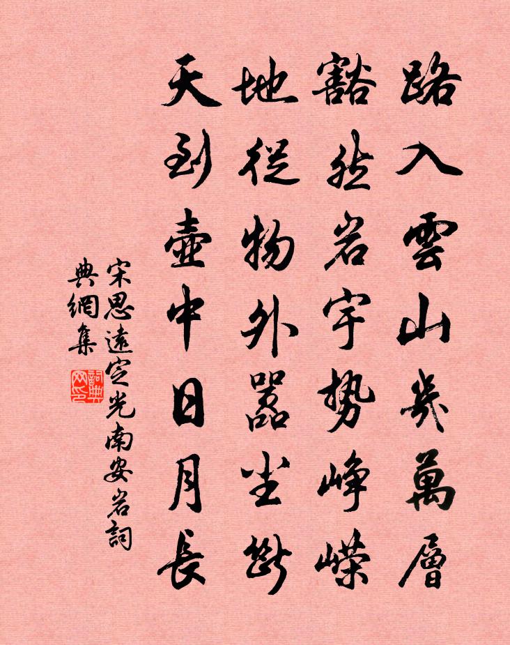 詩詞名句歷史字典書法欣賞書法字典國語詞典說文解字康熙字典古漢語字典標 題 作 者 詩 句 定光南安岩作者:宋思遠 朝代:宋代定光南安岩原文路入雲山幾萬層,豁然岩宇勢崢嶸。地從物外囂塵斷,天到壺中日月長。詩詞問答問:定光南安岩的作者是誰?答:宋思遠問:定光南安岩寫於哪個朝代?答:宋代宋思遠定光南安岩書法欣賞定光南安岩書法作品詩詞推薦為顧美山賦五字田釋文珦〔宋代〕寶此五字田,不羨千畝耤。冥搜為播種,發言皆黍稷。梅山老吟農,良已著深績。終然乃有秋,不負平生力。留別寄元裕李新〔宋代〕耳熟英聲相見晚,解顏一笑盡天真。有魚待客不妨醉,無玉藏花初厭貧。疏竹已留清夜月,好風先斷過江塵。幽居頌古三十一首釋安永〔宋代〕掀翻海岳求知已,雪刃橫身立太平。野老不知堯舜力,冬冬打鼓祭江神。初秋寓直三首鄭畋〔唐代〕曉星獨掛結麟樓,三殿風高藥樹秋。玉笛數聲飄不住,問人依約在東頭。宿鳥翩翩落照微,石台樓閣鎖重扉。步廊悼幼子孟郊〔唐代〕一閉黃蒿門,不聞白日事。生氣散成風,枯骸化為地。負我十年恩,欠爾千行淚。灑之北原上,不待秋風至。水龍吟 次藥房韻 案此下原附史藥房作另錄陸文圭〔元代〕西州玉局飛仙,霓裳曾侍槐龍翠。飛花麗句,雅音猶在,有人庚未。千載峨峰,一江川練,又練清氣。嘆瀛洲路近郡中即事白居易〔唐代〕漫漫潮初平,熙熙春日至。空闊遠江山,晴明好天氣。外有適意物,中無繫心事。數篇對竹吟,一杯望雲醉。行攜次韻宇文使君山行陸游〔宋代〕城中鐵望西山,鐵爽氣固可鐵致。不如山中行,衣屨染濃翠。使君資格逸,鐵馬奏橫吹。平郊何曠盪,修竹亦清閟江城子 庚寅年,通仙觀醮罷復徊,不遂本願尹志平〔元代〕玉河別後出西山。曉霜寒。過重關。書疏相邀,須索赴清壇。度死超生雖好事,年已暮,鬢成斑。修真未就積功難風入松(壽梅壑)吳文英〔宋代〕一帆江上暮潮平。騎鶴過瑤京。湘波山色青天外,紅香盪、玉佩東丁。西圃仍圓夜月,南風微弄秋聲。阿鹹才俊玉寄題喻叔奇國傅郎中園亭二十六詠花屏楊萬里〔宋代〕錦障豪舉笑騃童,松圖冷淡惱山翁。玉山頹處誰扶著,花作屏風倚暖紅。枕上晁說之〔宋代〕人間百感未能休,欲語無情謾九州。樓上角聲山上月,共人割據一端愁。九月十一日雪二首趙蕃〔宋代〕九月天雨雪,何曾見南方。我行蔣山來,解轡菩提坊。一飯誰為設,百錢倒空囊。平生遠遊意,到此增彷徨。勿厭游密庵三首劉子翬〔宋代〕半參樵徑繞危岑,仿佛精廬若可尋。怪底扶筇箸力健,暖風晴日送登臨。陳子厚送韶鴨將以七絕因次其韻吳芾〔宋代〕湖光深處恣沉浮,未讓波間鷺與鷗。舊侶此時應羨汝,欲來相就苦無由。江城子·中秋早雨晚晴陳著〔宋代〕中秋佳月最端圓。老痴頑。見多番。杯酒相延,今夕不應慳。殘雨如何妨樂事,聲淅淅,點斑斑。天應有意故遮闌虞美人·好風微揭簾旌起孫光憲〔五代〕好風微揭簾旌起,金翼鸞相倚。翠檐愁聽乳禽聲,此時春態暗關情,獨難平。畫堂流水空相翳,一穗香搖曳。教人謁金門馮延巳〔唐代〕聖明世,獨折一枝丹桂。學著荷衣還可喜,春狂不啻□。年少都來有幾,自古閒愁無際。滿盞勸君休惜醉,願君千寄贈庫部王郎中(時充折糴使)盧綸〔唐代〕諤諤漢名臣,從天令若春。敘辭皆詔旨,稱宦即星辰。草木承風偃,雲雷施澤均。威懲治粟尉,恩洽讓田人。泉貨書感陸游〔宋代〕楚些難招去乾魂,正令舌在向誰論?中分白日歸欹枕,全付青春與杜門。凜凜咥人愁履虎,區區染指畏嘗黿。殘年名句推薦湛湛長江去,冥冥細雨來。杜甫《梅雨》 翠華想像空山里,玉殿虛無野寺中。杜甫《詠懷古蹟五首·其四》 萬里人南去,三春雁北飛。韋承慶《南中詠雁詩》 白馬繞旌旗,悲鳴相追攀。李白《豫章行》 是故,君子有終身之憂,無一朝之患也。孟子《孟子·離婁章句下·第二十八節》 從此信音稀,嶺南無雁飛。李師中《菩薩蠻·子規啼破城樓月》 商葉墮乾雨,秋衣臥單雲。孟郊《秋懷十五首》 白日依山盡,黃河入海流。王之渙《登鸛雀樓》 雨後雙禽來占竹,秋深一蝶下尋花。文同《北齋雨後》 知君慣度祁連城,豈能愁見輪台月。岑參《送李副使赴磧西官軍》